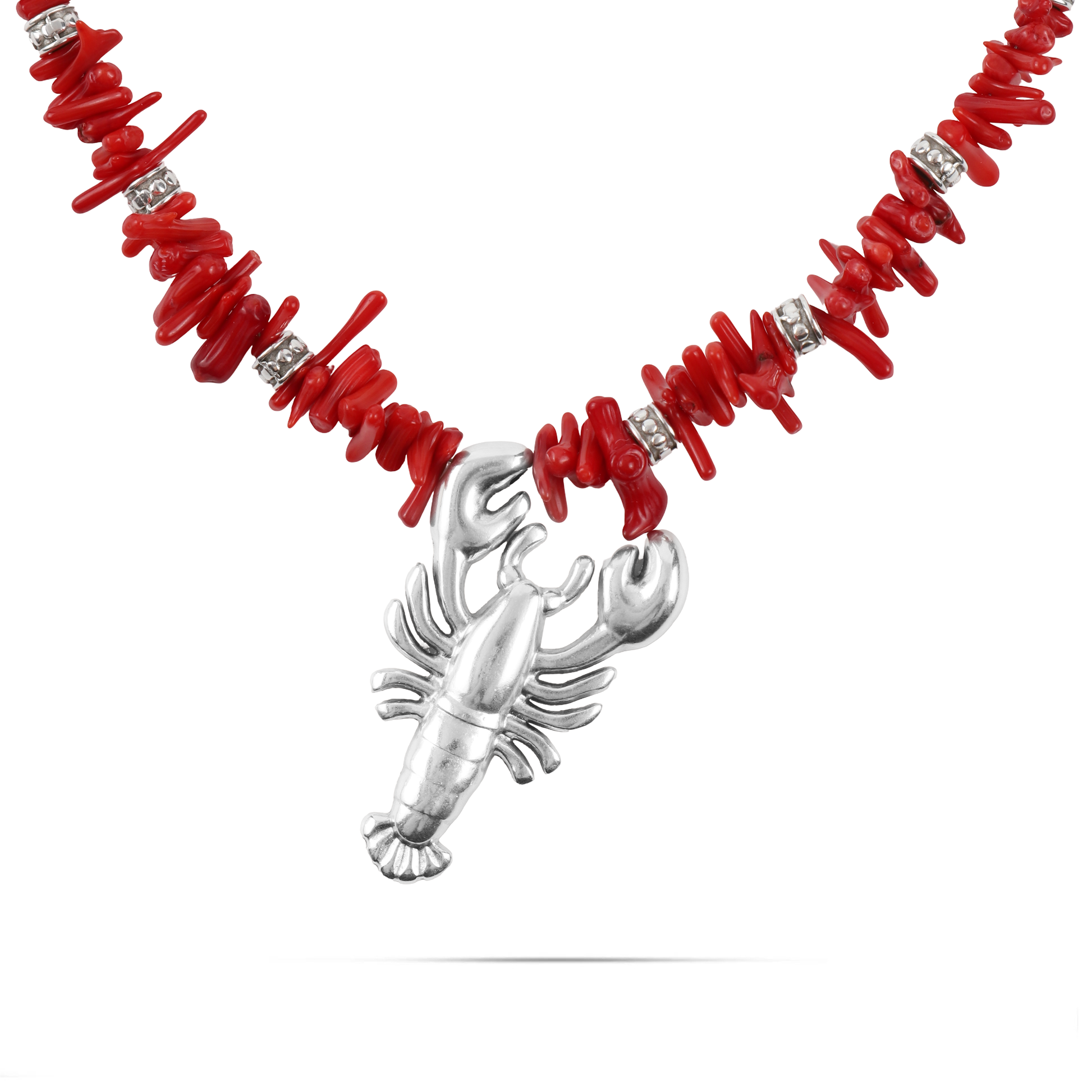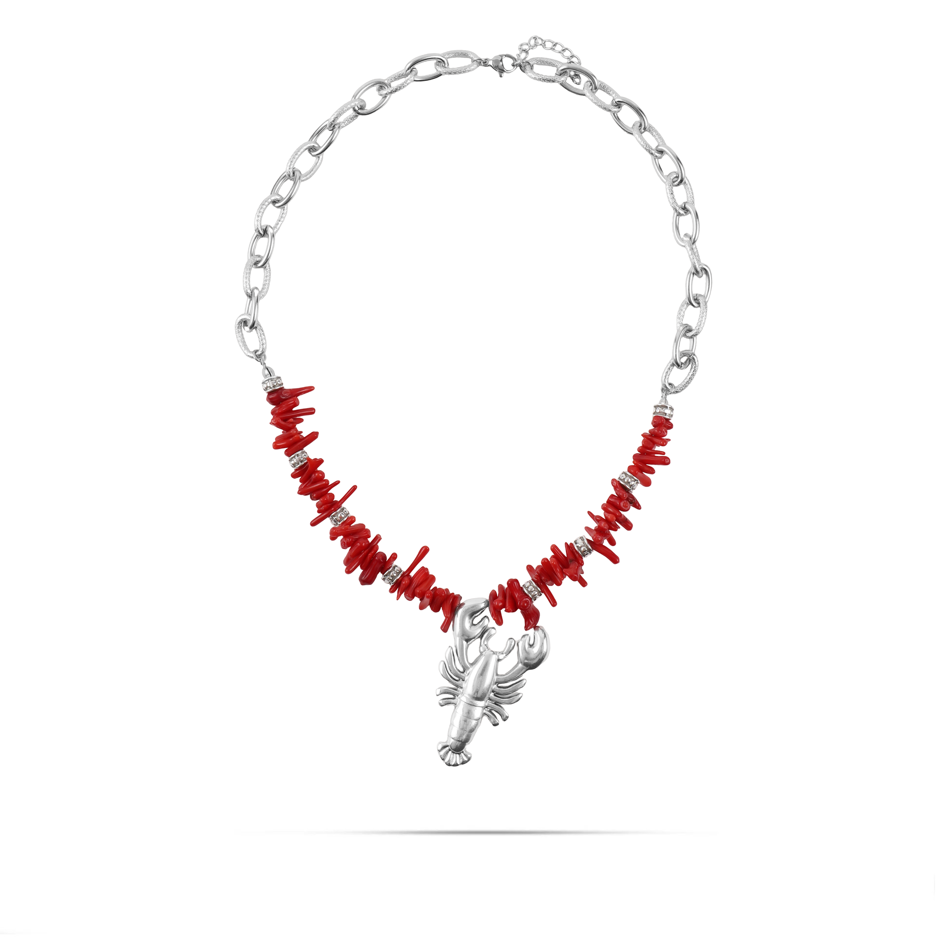 Χειροποίητο κολιέ με αστακό και κοράλια Mar and Mar Red Lobster Silver από ανοξείδωτο ατσάλι