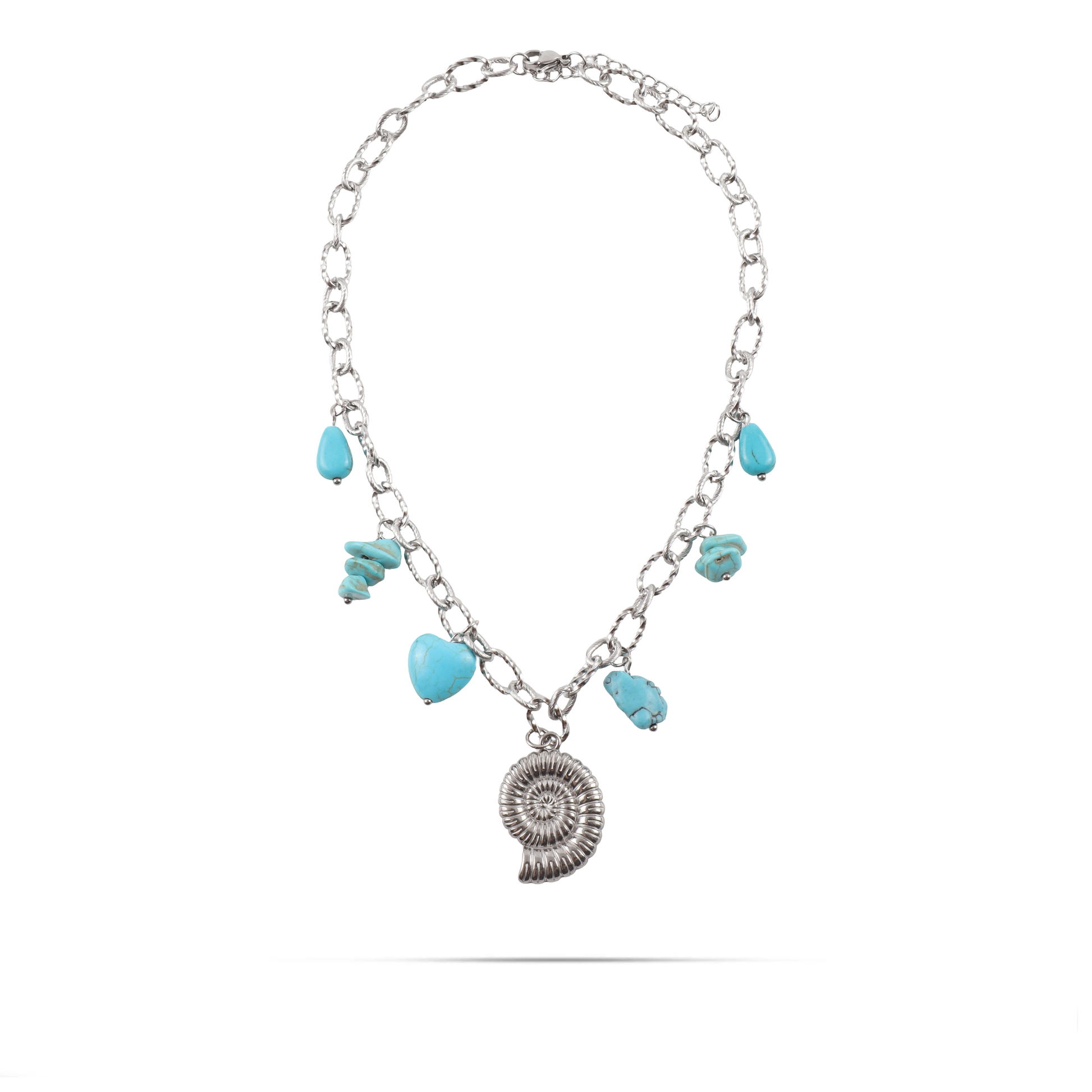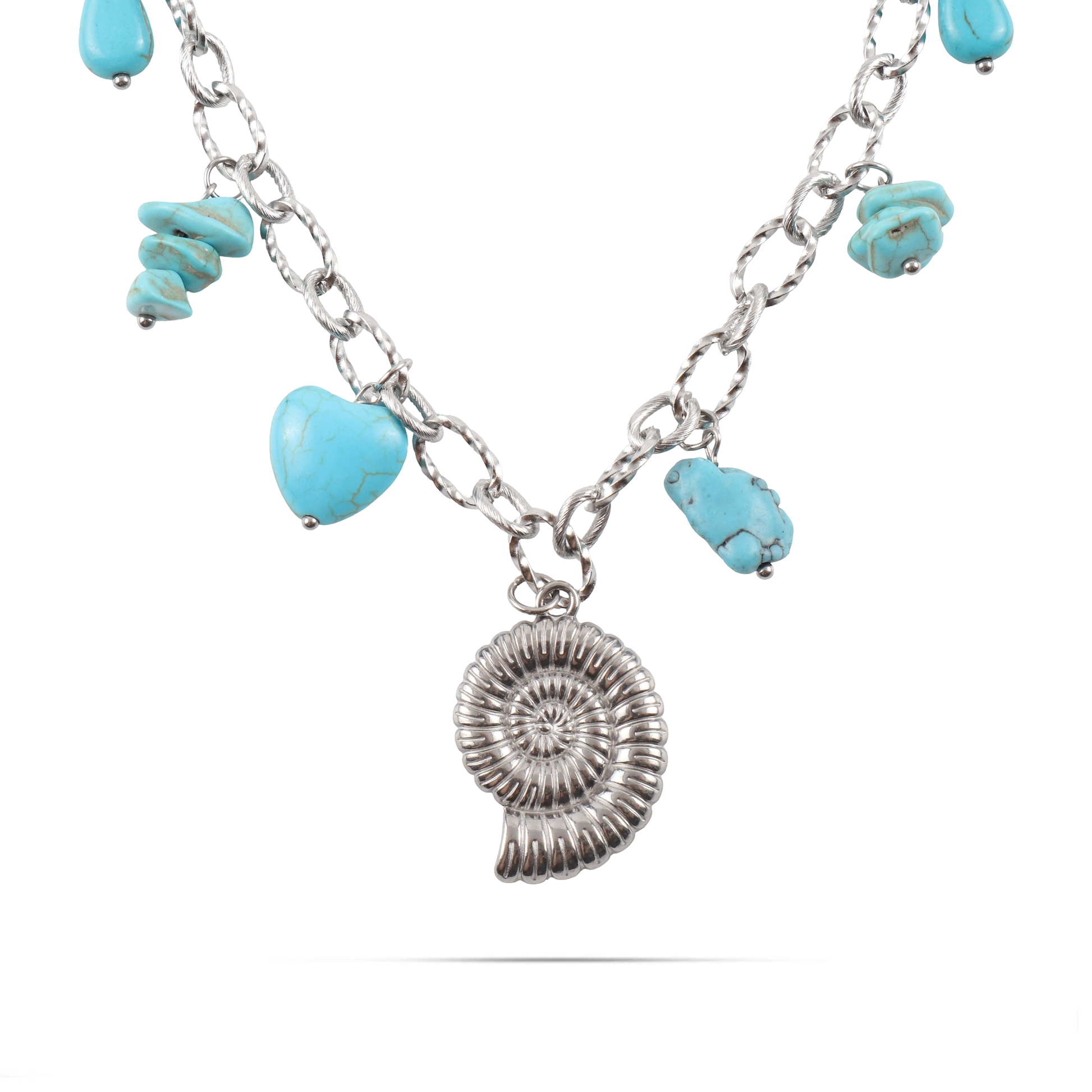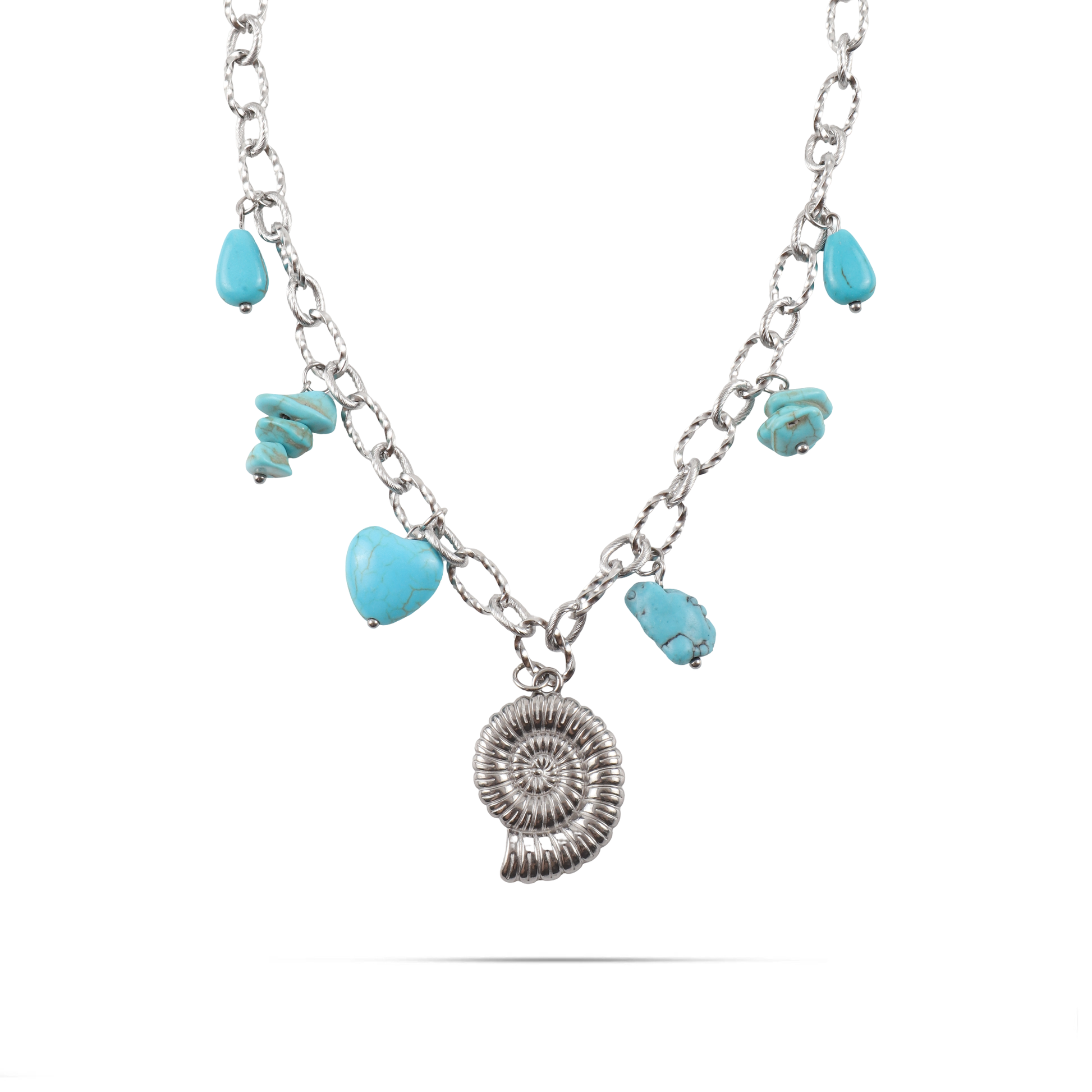 Χειροποίητο κολιέ με κρεμαστό κοχύλι και φυσικές ορυκτές πέτρες Χαολίτη Mar and Mar Nerida Silver από ανοξείδωτο ατσάλι
