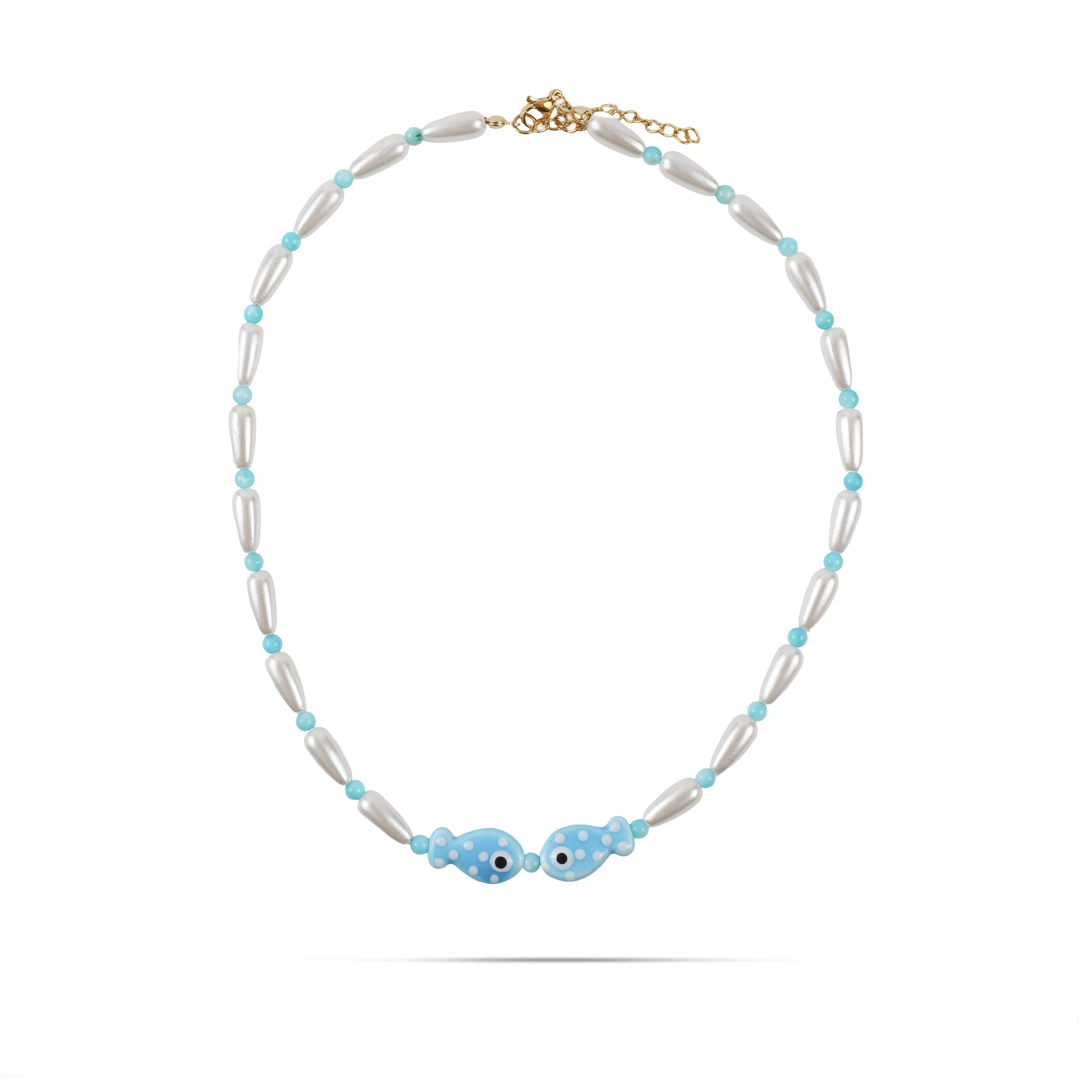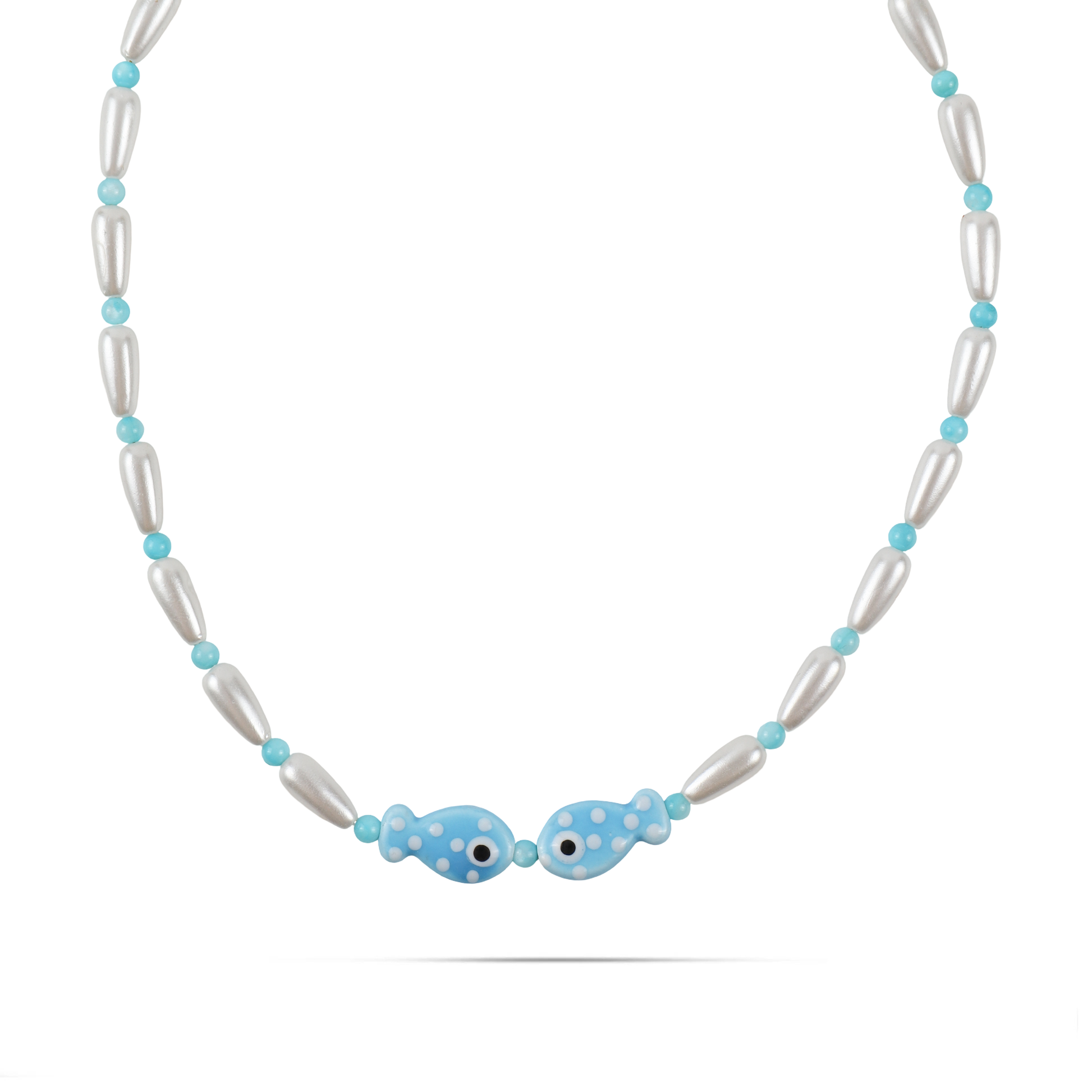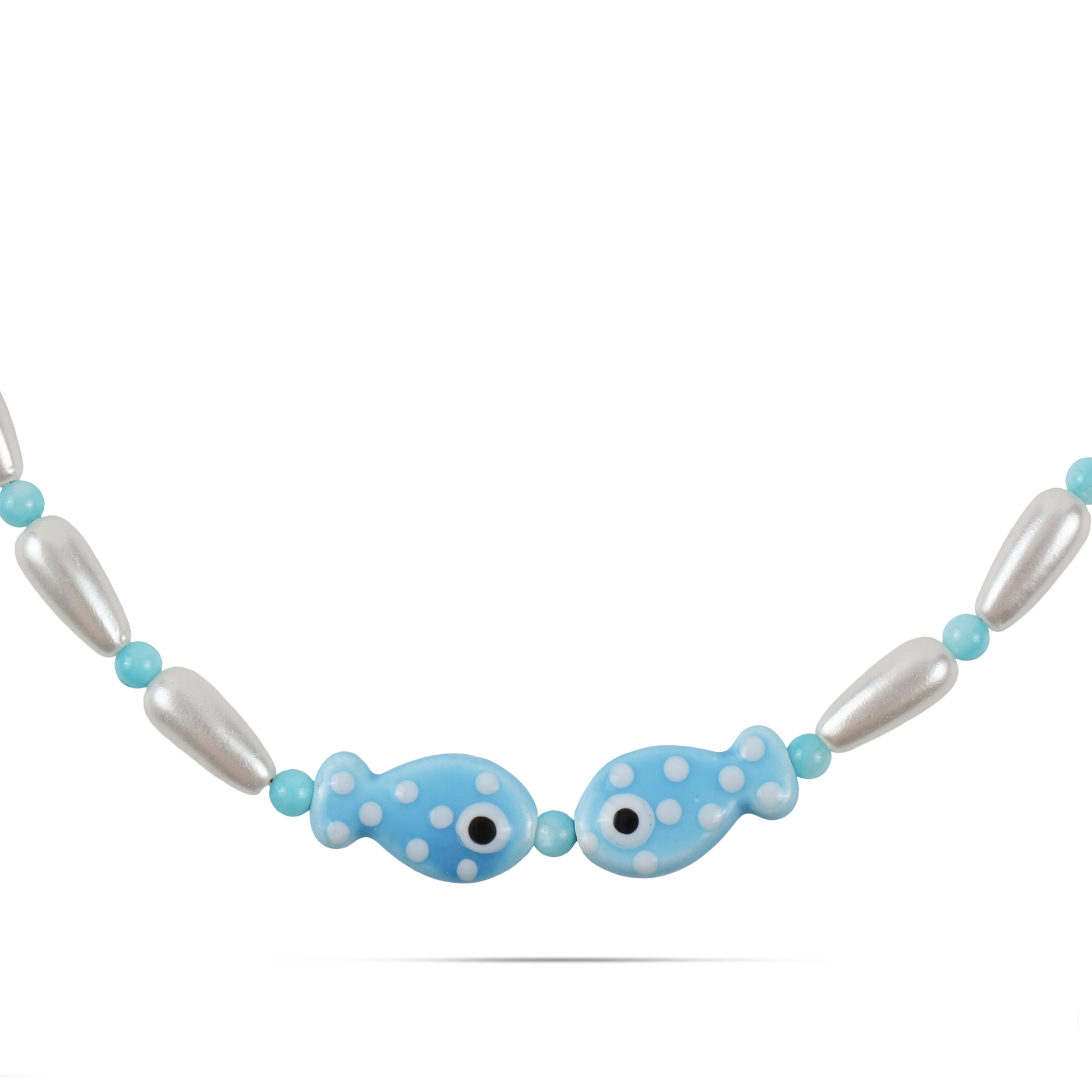 Χειροποίητο κολιέ με πέρλες χάντρες και ψαράκια από πηλό Mar and Mar Selva (Light Blue) από ανοξείδωτο ατσάλι