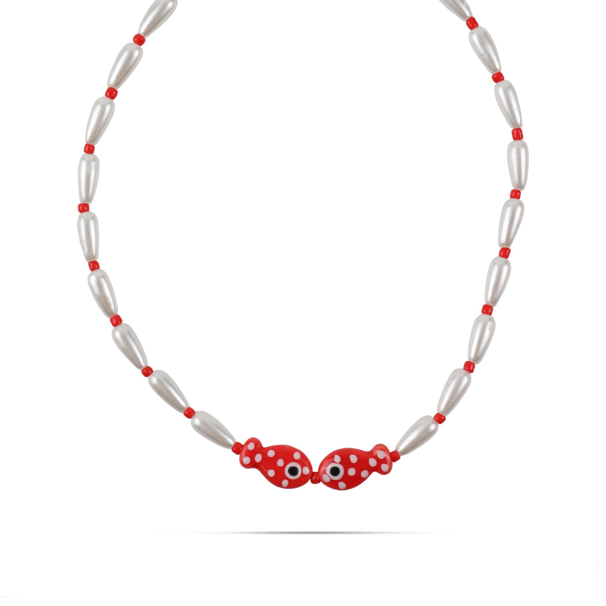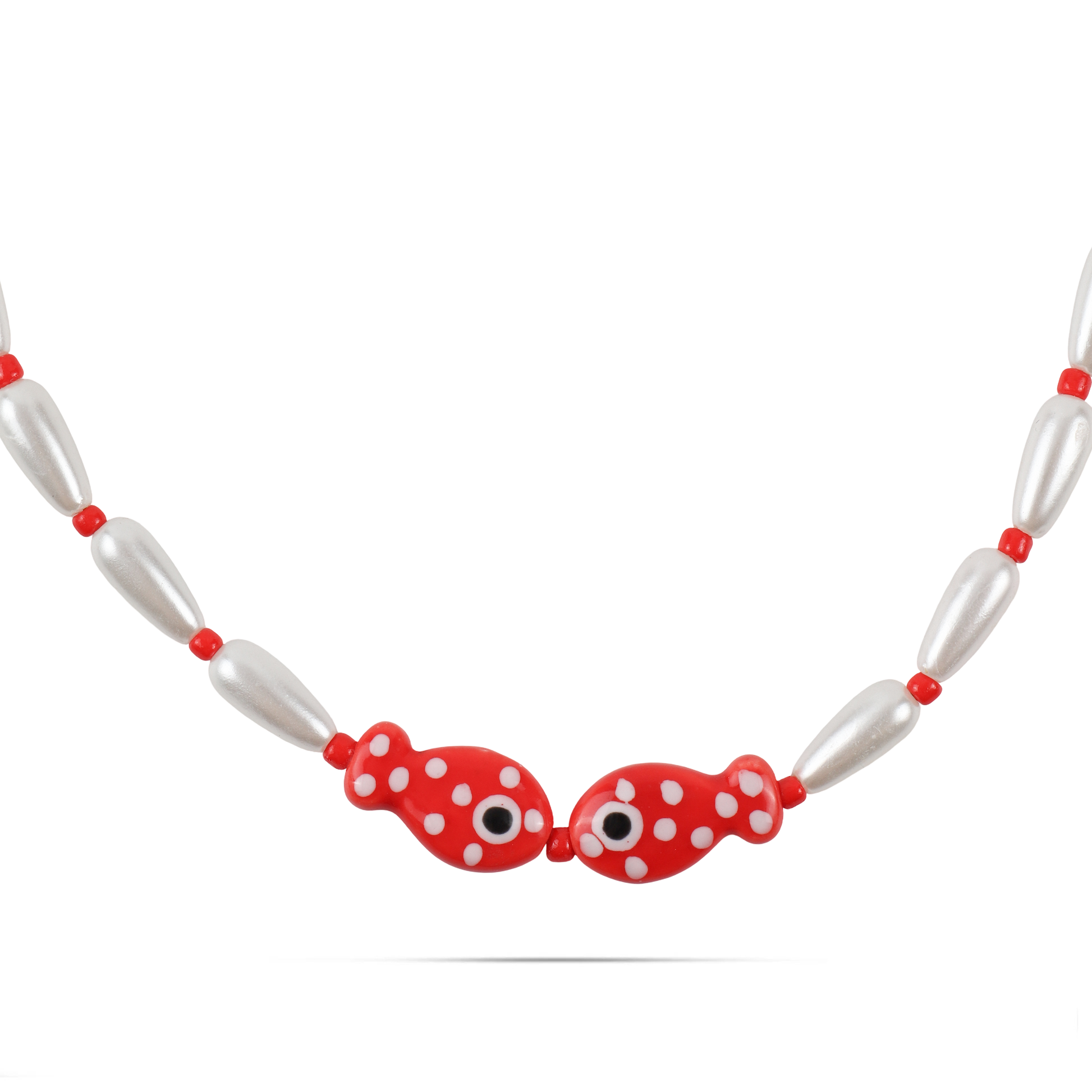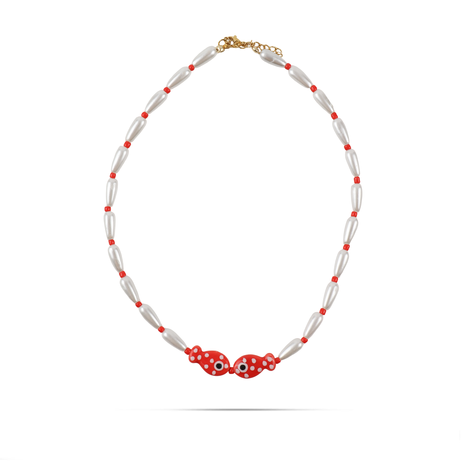 Χειροποίητο κολιέ με πέρλες χάντρες και ψαράκια από πηλό Mar and Mar Selva (Red) από ανοξείδωτο ατσάλι