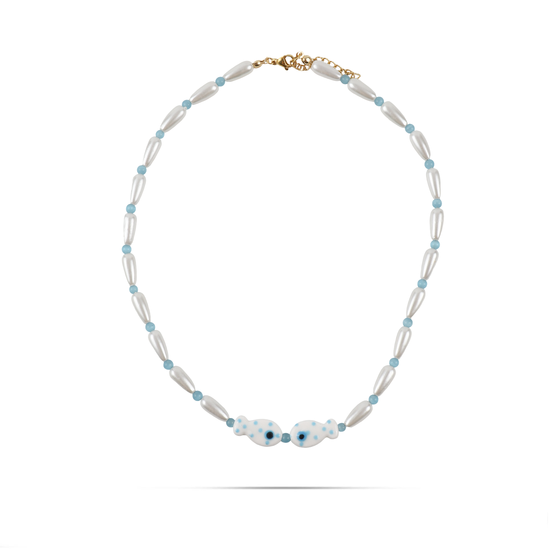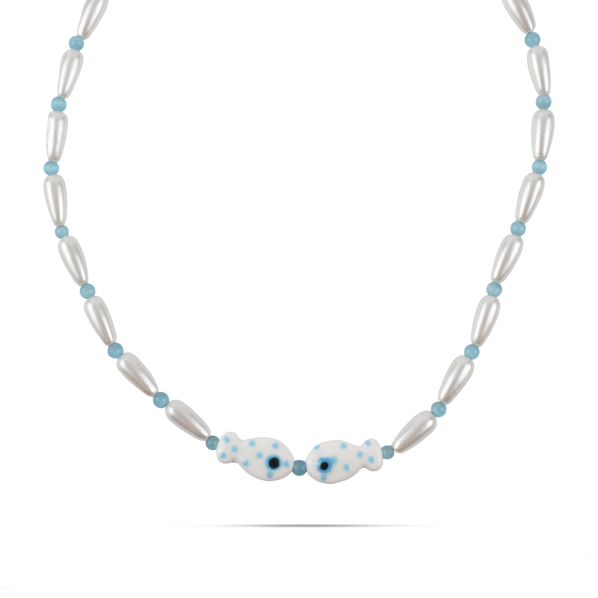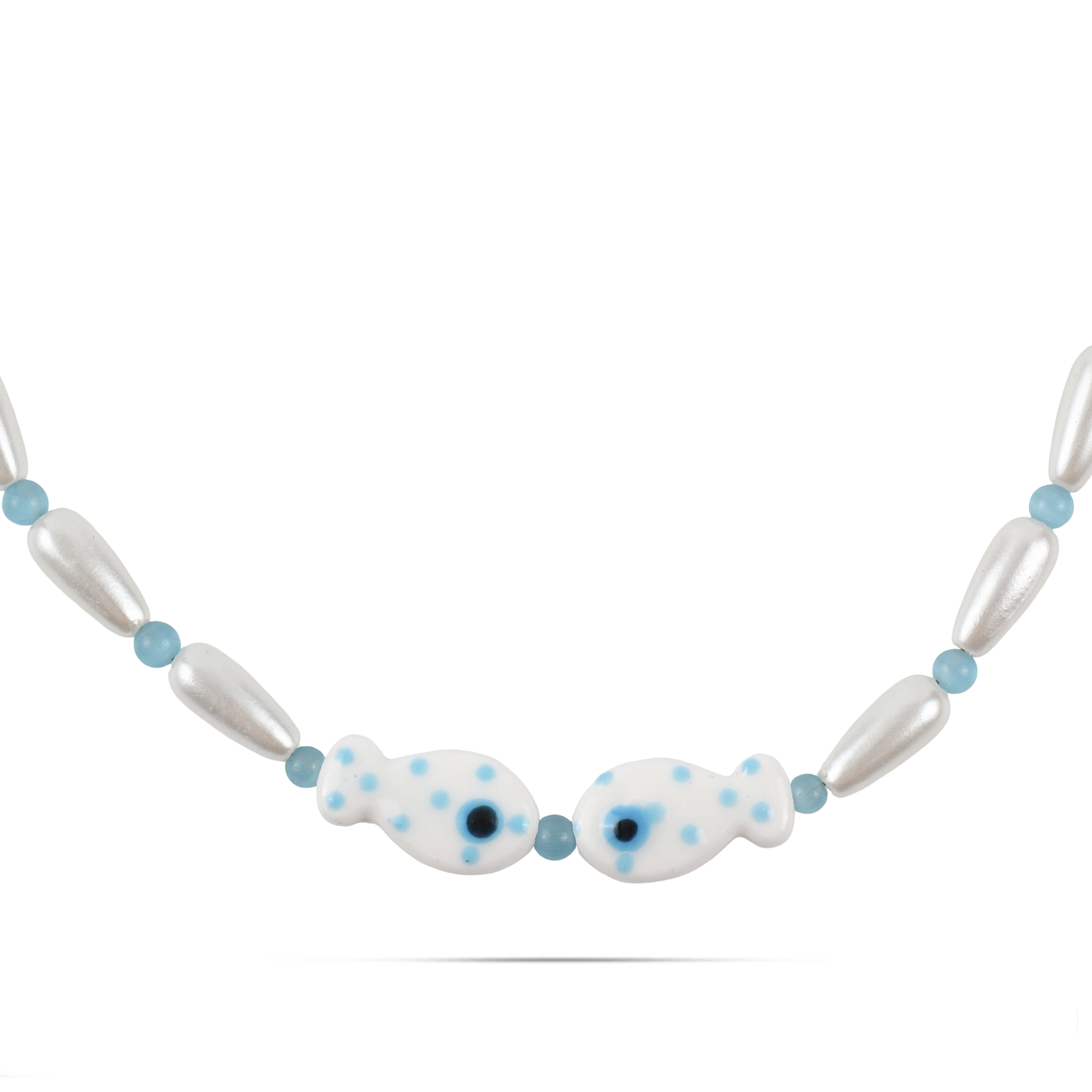 Χειροποίητο κολιέ με πέρλες χάντρες και ψαράκια από πηλό Mar and Mar Selva (White) από ανοξείδωτο ατσάλι