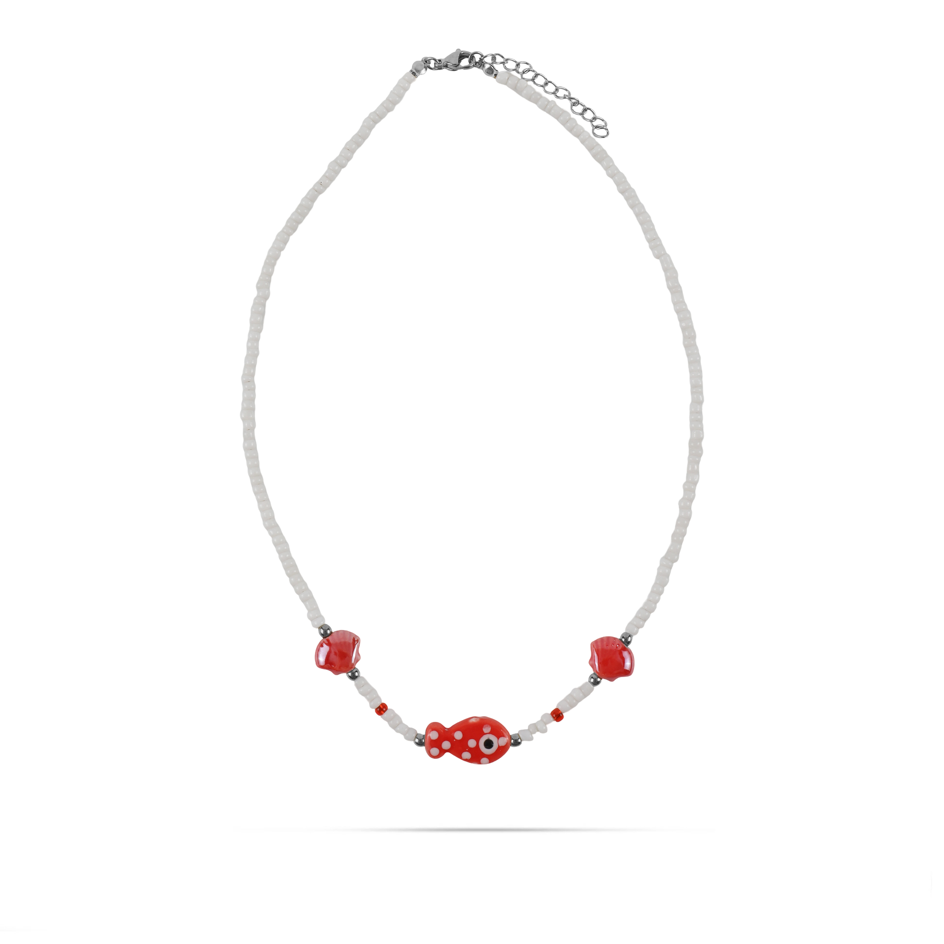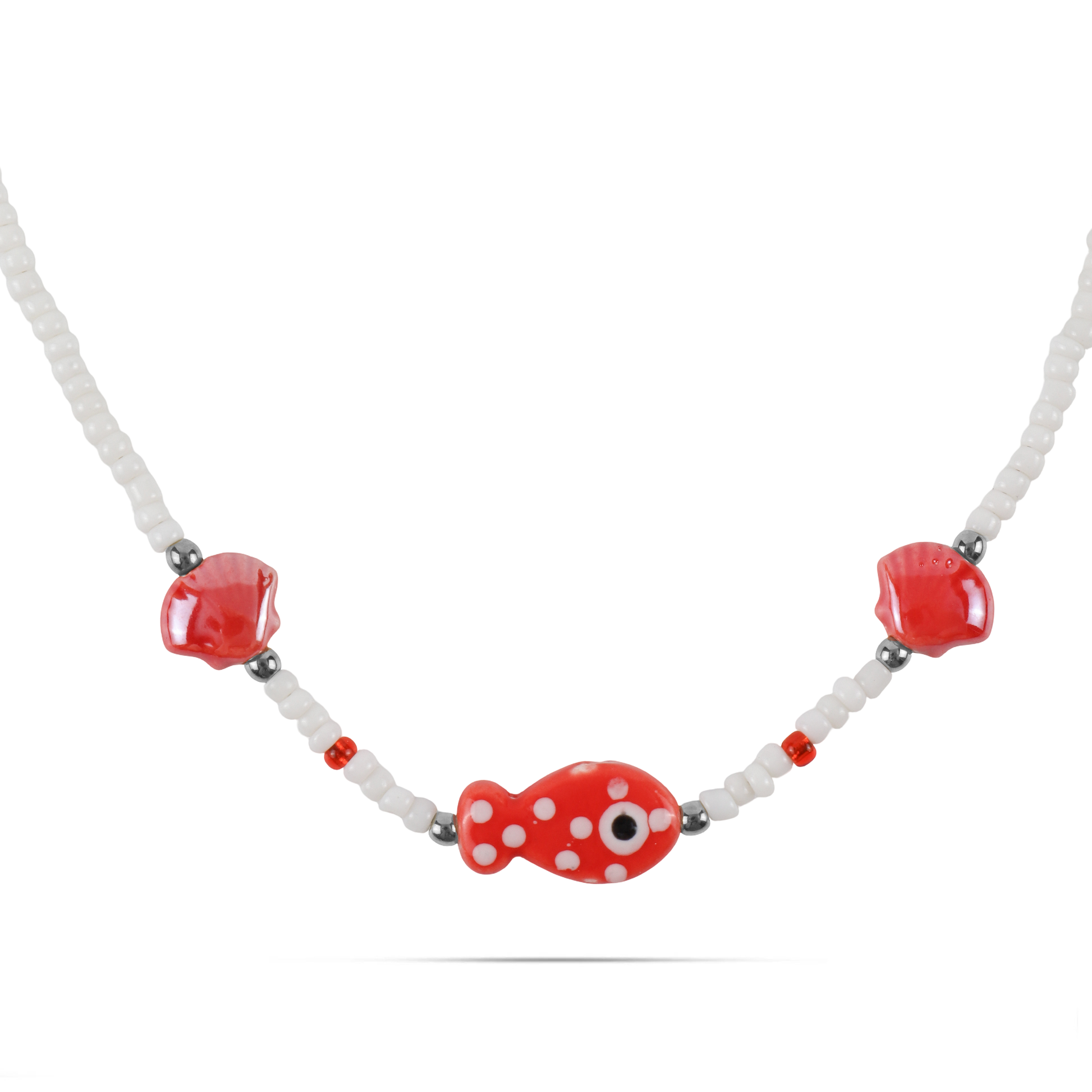 Χειροποίητο κολιέ με πήλινα στοιχεία και χάντρες Mar and Mar Aelia fish (red) Silver από ανοξείδωτο ατσάλι