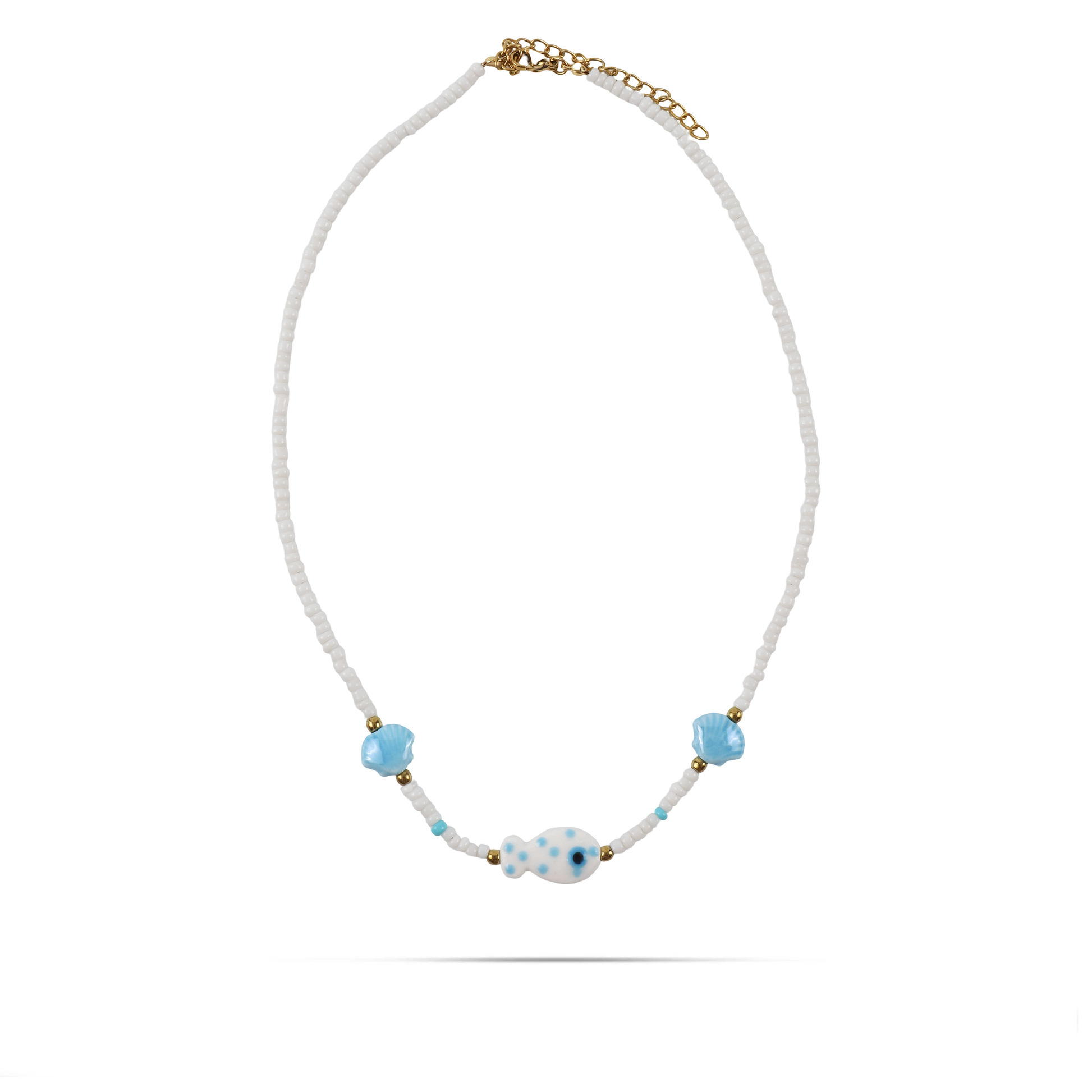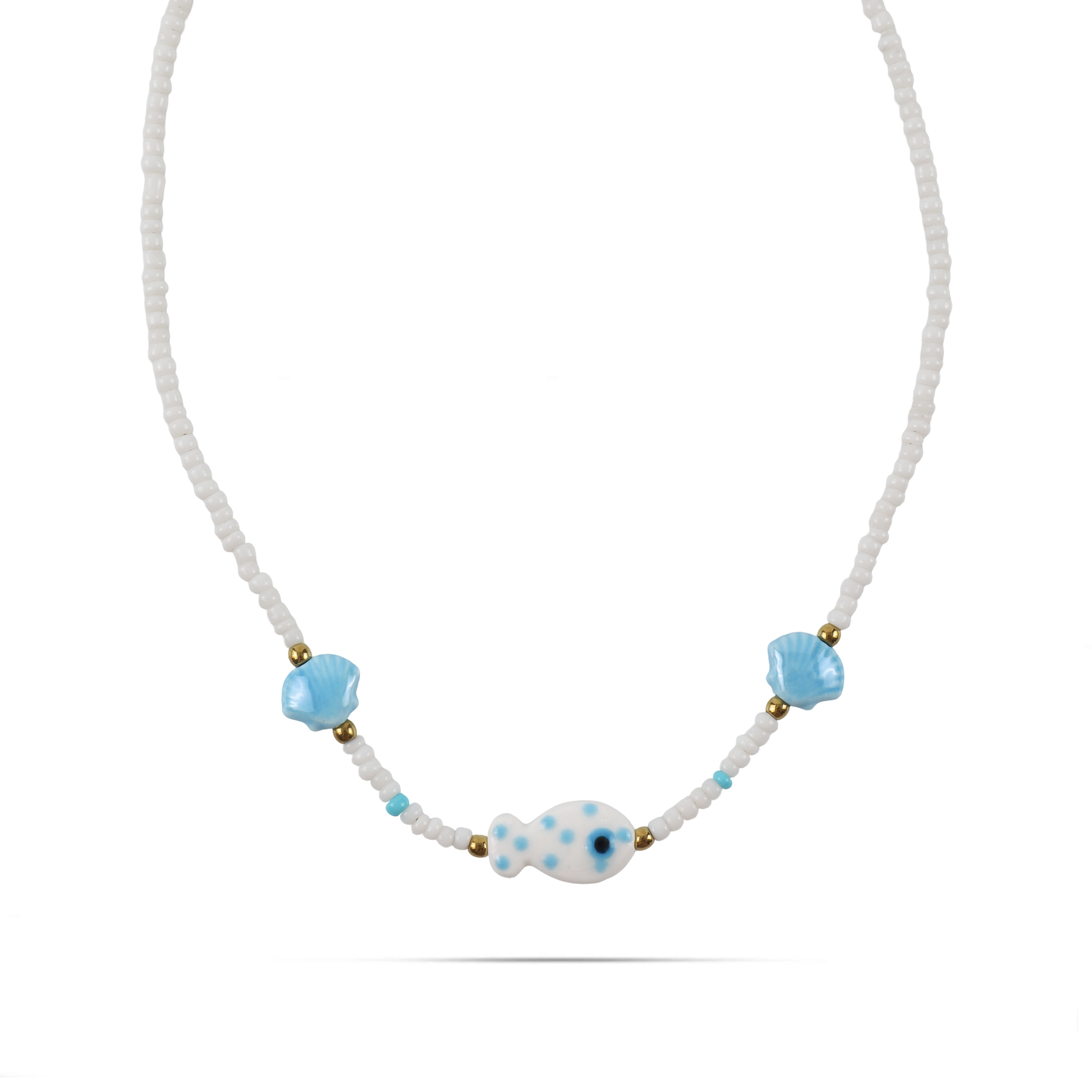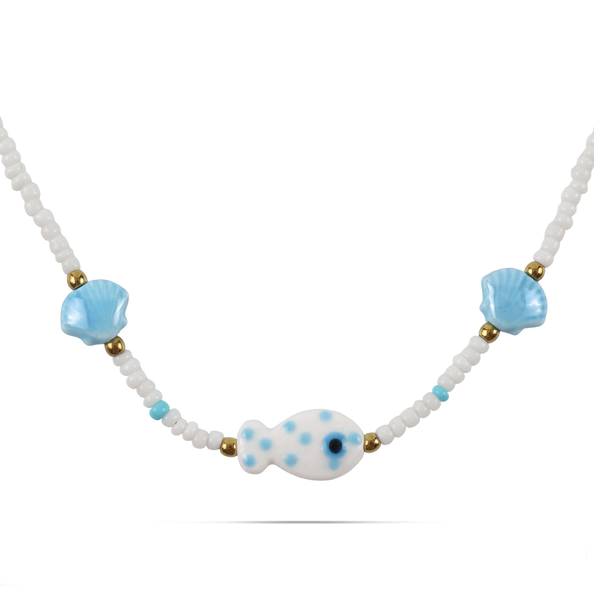 Χειροποίητο κολιέ με πήλινα στοιχεία και χάντρες Mar and Mar Aelia fish (white) από ανοξείδωτο ατσάλι