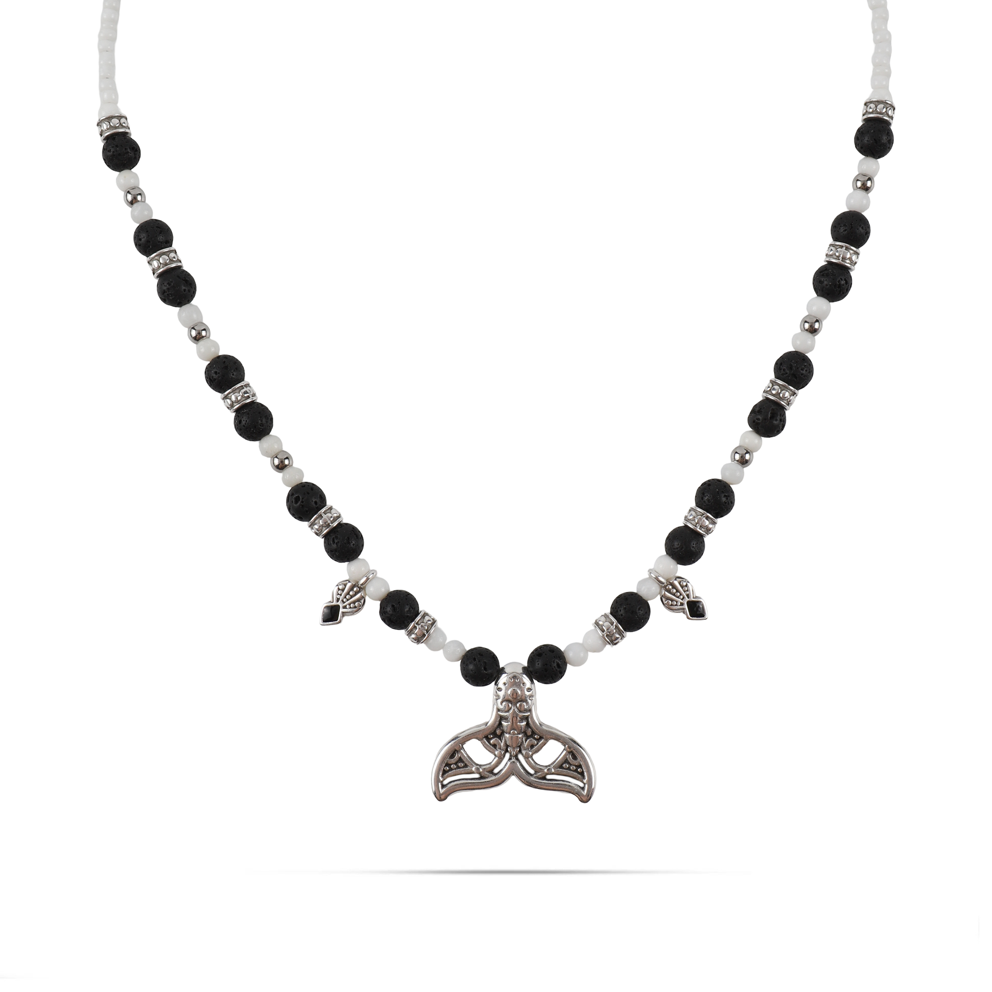 Χειροποίητο κολιέ Mar and Mar Lustrina Black με φυσικές ορυκτές πέτρες Λάβας και φυσικό κοχύλι από ανοξείδωτο ατσάλι
