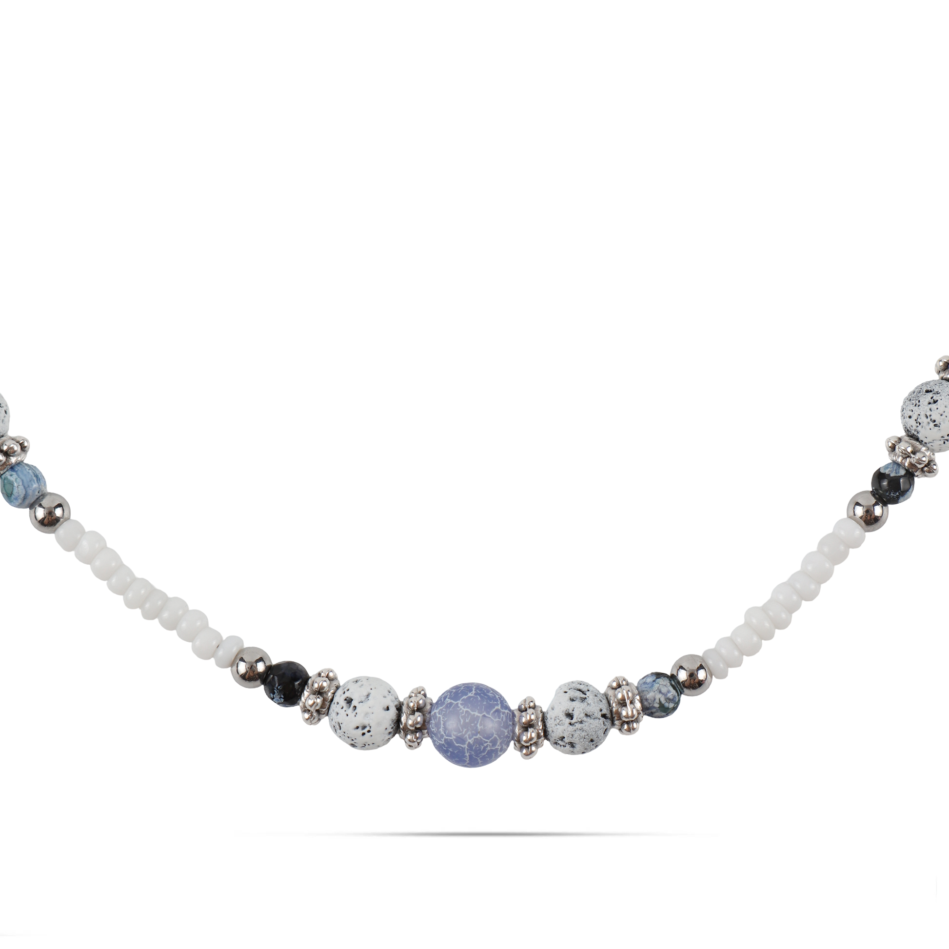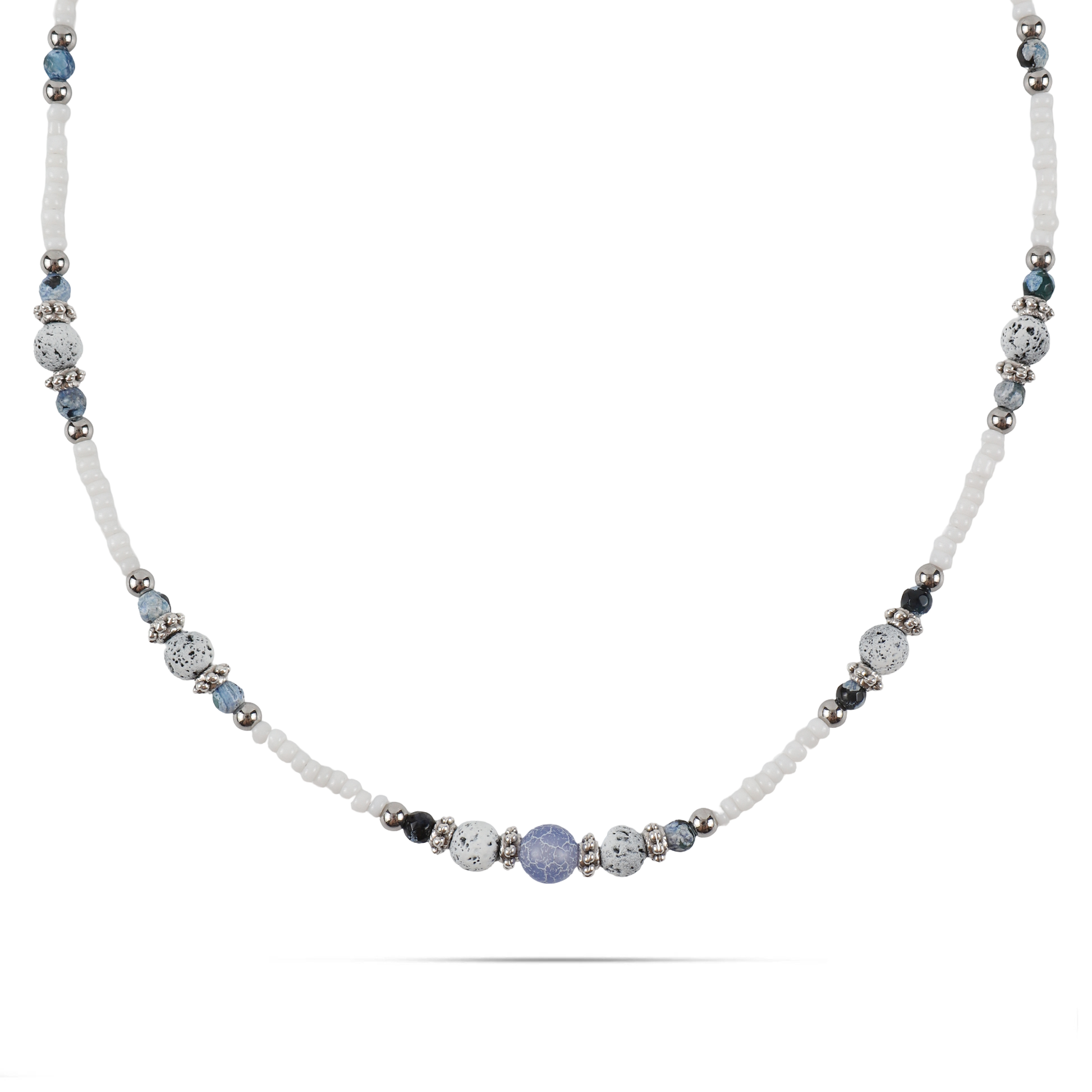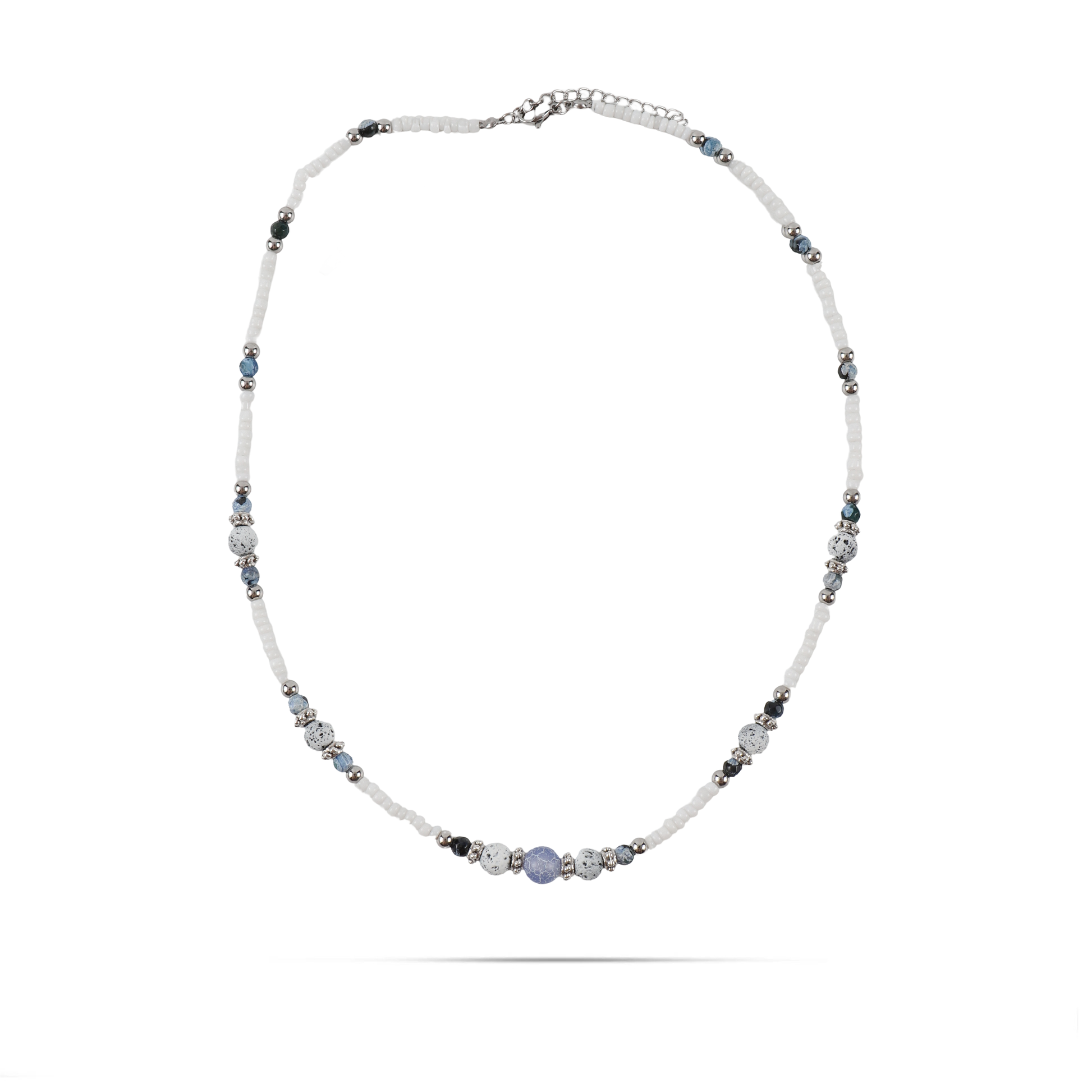Χειροποίητο κολιέ Mar and Mar Nymalia με φυσικές ορυκτές πέτρες Λάπις λάζουλι, Χαολίτη και φυσικό κοχύλι από ανοξείδωτο ατσάλι