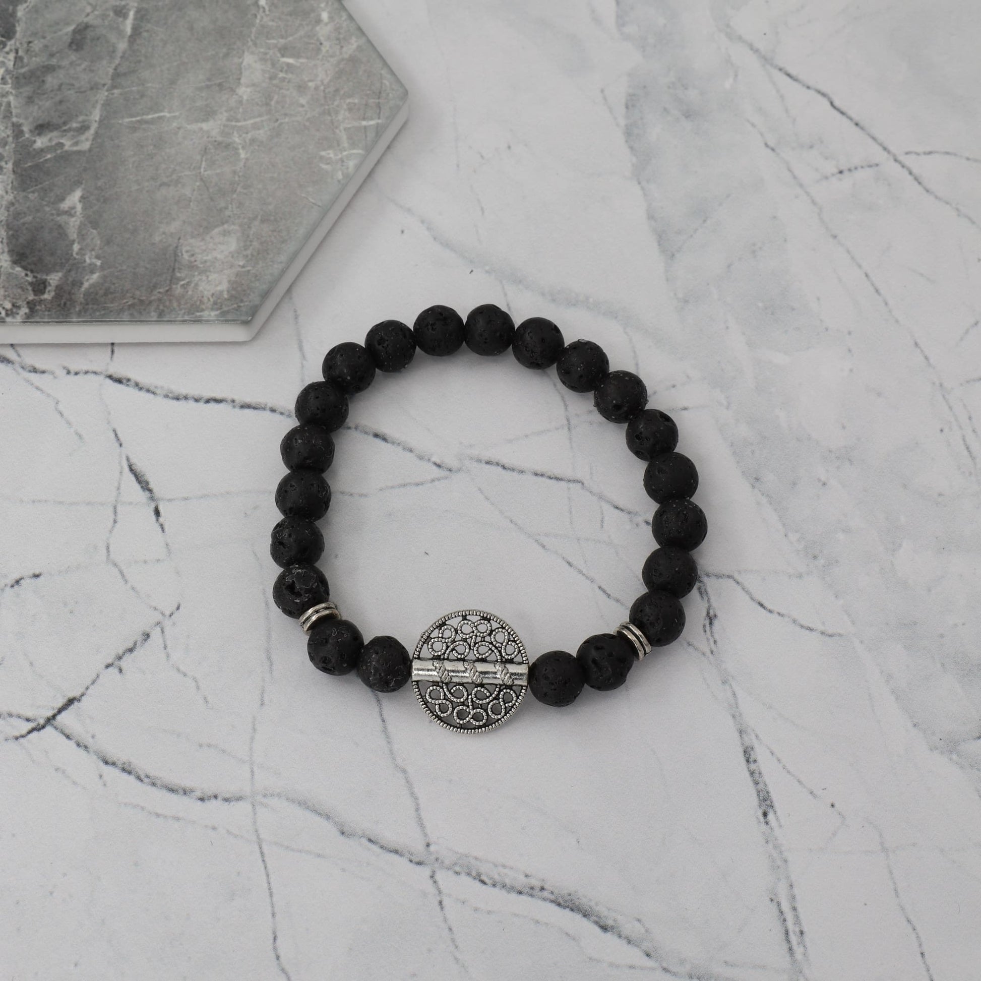 Βραχιόλι χεριού με λαστιχάκι διακοσμημένο με κυκλικό μενταγιόν με υπέροχα σχέδια και με πανέμορφες χάντρες από ημιπολύτιμους λίθους σε υπέροχο μαύρο και γκρι χρώμα για να διαλέξετε αυτό που σας ταιριάζει!