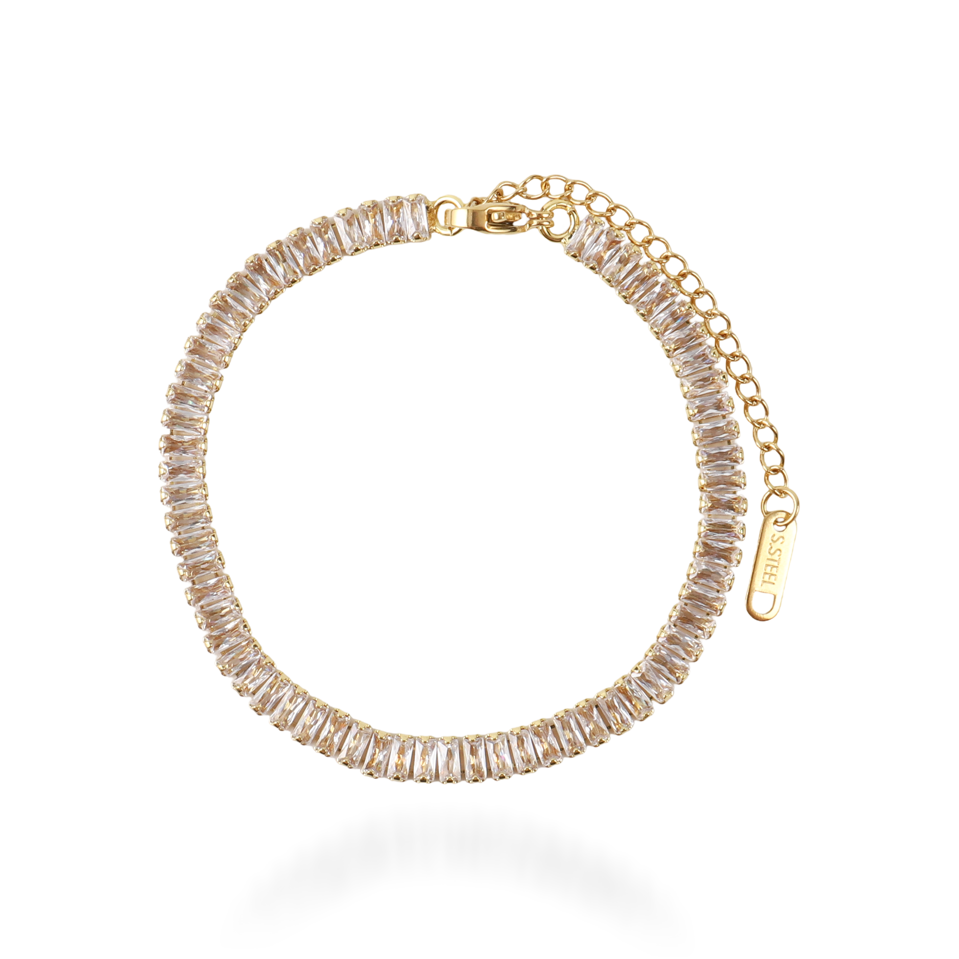 Αναδείξτε το στυλ σας με τη λάμψη της αλυσίδας χεριού Riviera. Κατασκευασμένη από ορείχαλκο σε διπλά επιχρυσωμένο 18Κ και ασημί χρώμα, αυτή η αλυσίδα είναι μια εντυπωσιακή προσθήκη. Οι λαμπερές πέτρες Baguette Zircon που διακοσμούν την αλυσίδα προσθέτουν μια διακριτική και πολυτελή λάμψη. Φορέστε την για να ξεχωρίσετε σε κάθε περίσταση και να προσθέσετε λάμψη στο καθημερινό σας στυλ.