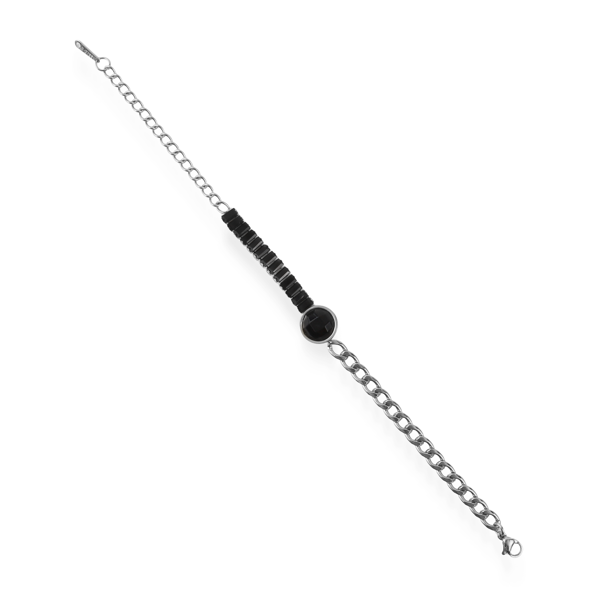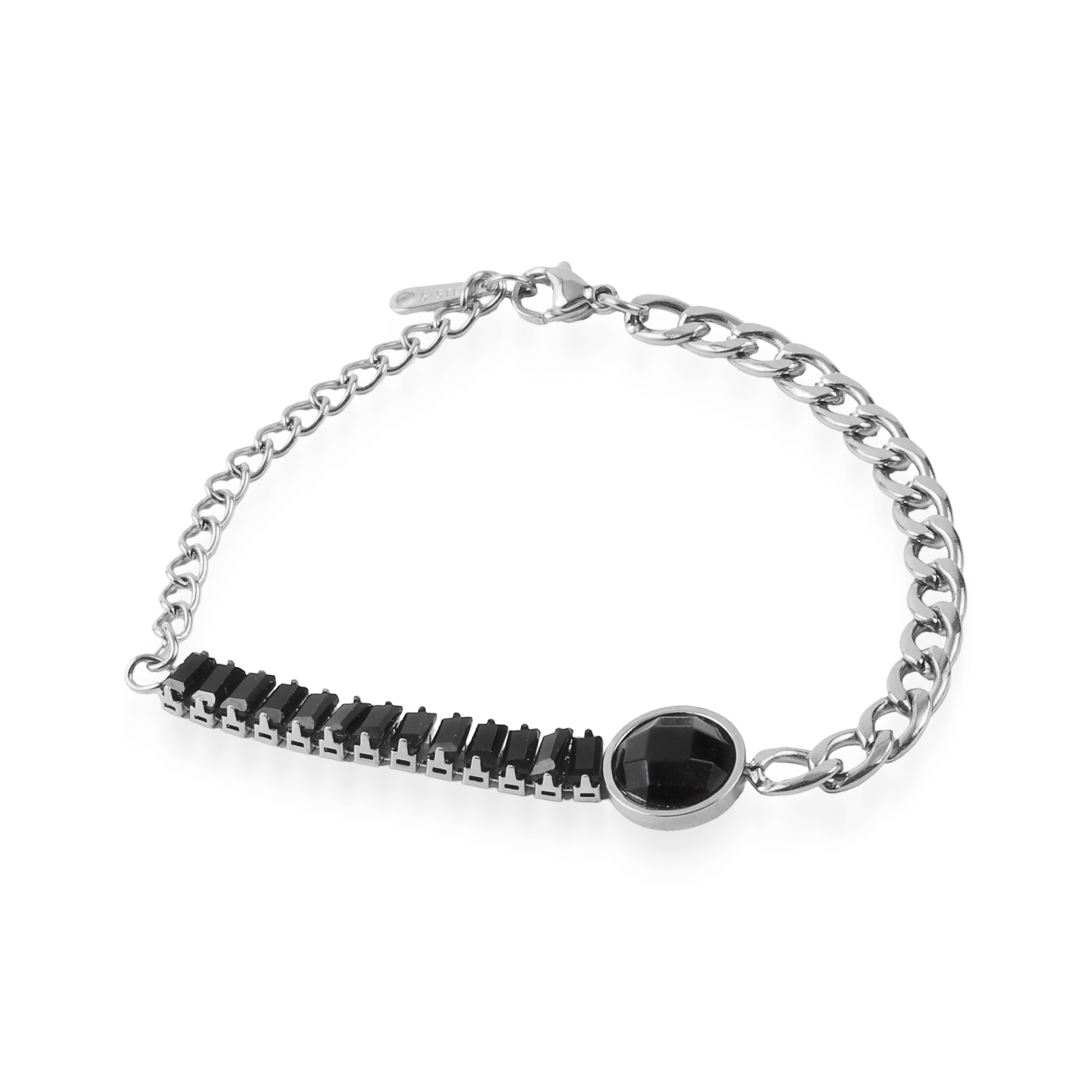 Απογειώστε το προσωπικό σας στυλ με αυτό το εκλεπτυσμένο βραχιόλι από ανοξείδωτο ατσάλι σε ασημί απόχρωση. Οι μυστηριώδεις μαύρες πέτρες ζιργκόν συνδυάζονται αρμονικά με το λαμπερό ασημί χρώμα, δημιουργώντας έναν τολμηρό αλλά κομψό συνδυασμό. Ένα μοναδικό κομμάτι που θα δώσει ένταση και χαρακτήρα σε κάθε σας εμφάνιση.