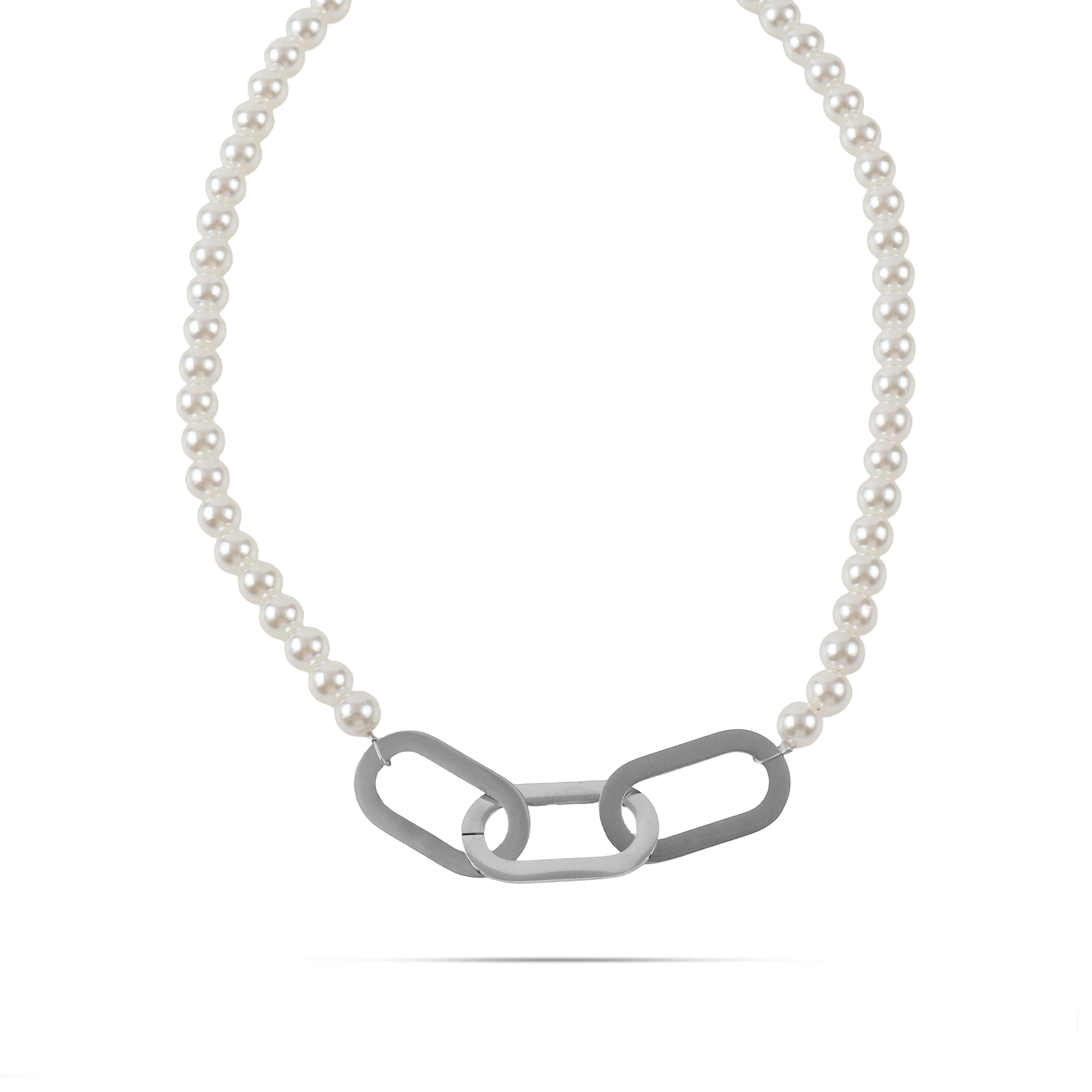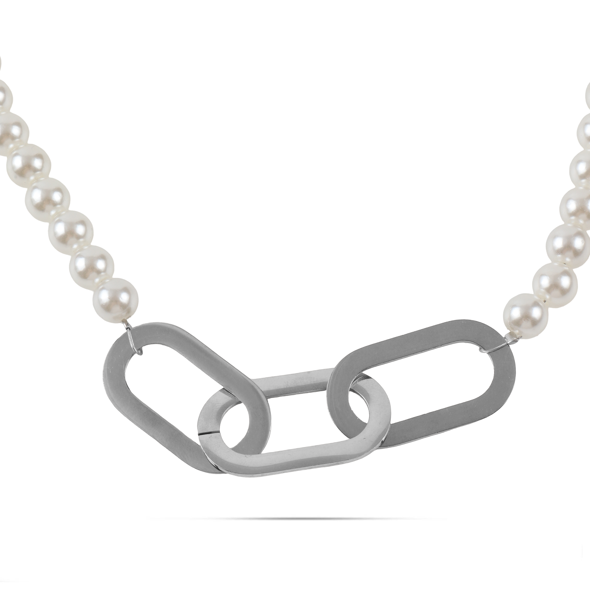 Χειροποίητη αλυσίδα λαιμού σε ασημί χρώμα με πέρλες και τρεις μεγάλους οβάλ κρίκους η οποία προσφέρει έναν εκλεπτυσμένο συνδυασμό κομψότητας και μοναδικού σχεδιασμού. Οι πέρλες προσθέτουν φινέτσα και κομψότητα, ενώ οι μεγάλοι οβάλ κρίκοι δημιουργούν ένα εντυπωσιακό και ενδιαφέρον στοιχείο. Η αλυσίδα αυτή είναι ιδανική για να προσθέσετε φινέτσα και κομψότητα σε ειδικές περιστάσεις ή στην καθημερινότητά σας.