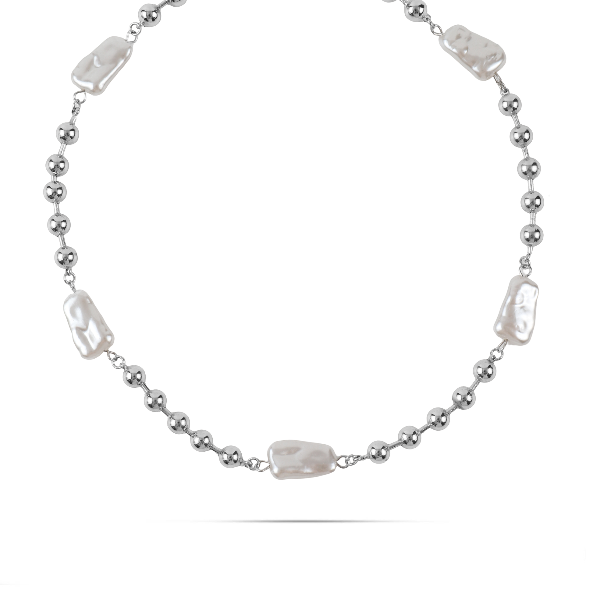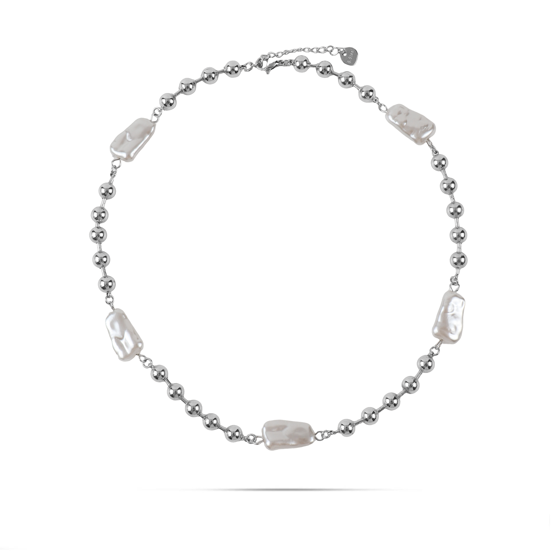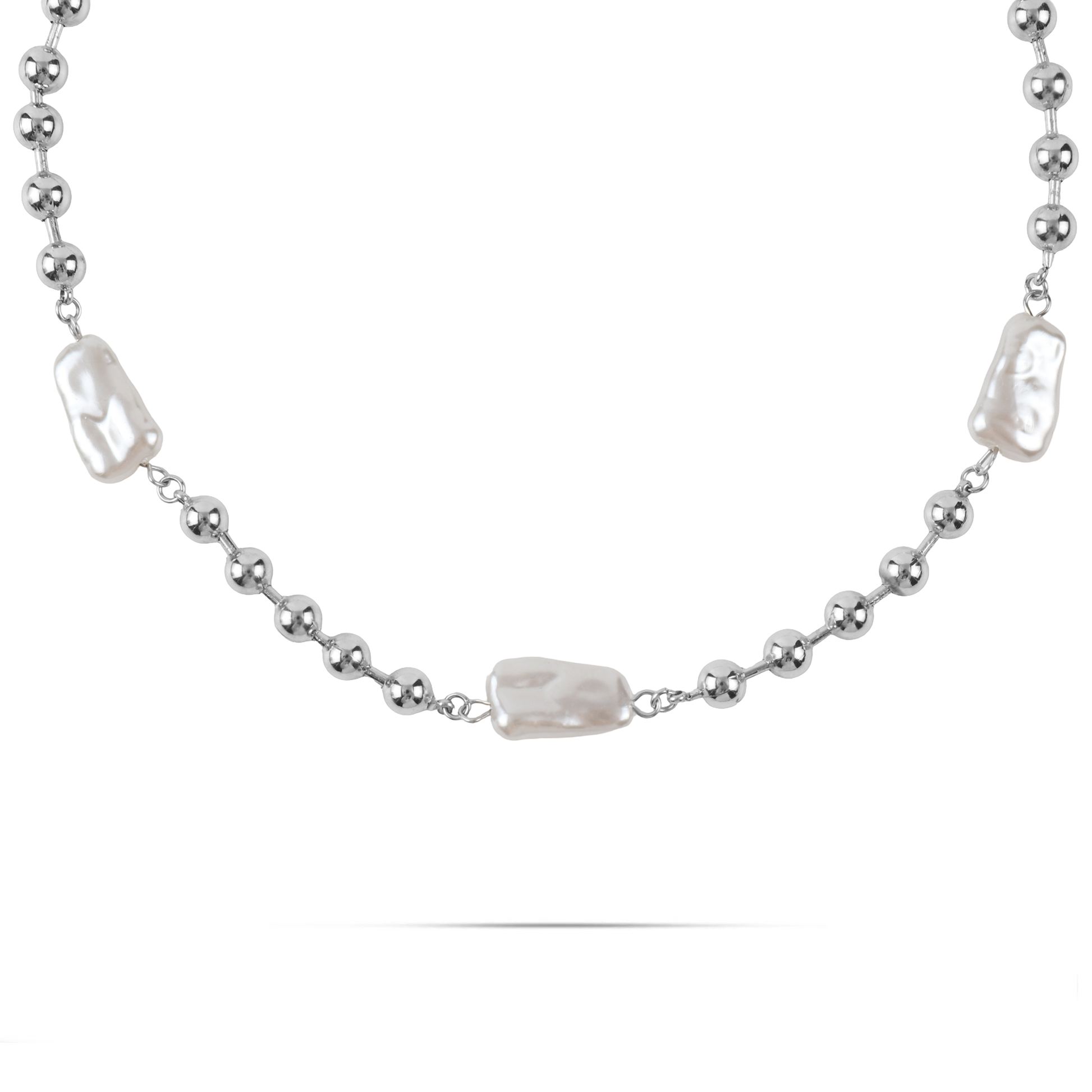 Αλυσίδα λαιμού από ανοξείδωτο ατσάλι σε ασημί χρώμα, διακοσμημένη με λαμπερές πέρλες, ένας όμορφος συνδυασμός μεταξύ κομψότητας και ανθεκτικότητας. Οι λαμπερές πέρλες προσδίδουν μια διακριτική λάμψη, ενώ το ανοξείδωτο ατσάλι εξασφαλίζει ανθεκτικότητα και διάρκεια ζωής. Αυτή η αλυσίδα είναι ιδανική για να προσθέσετε μια νότα κομψότητας σε καθημερινές εμφανίσεις ή να τη συνδυάσετε με άλλα κοσμήματα για ένα πιο εντυπωσιακό αποτέλεσμα.