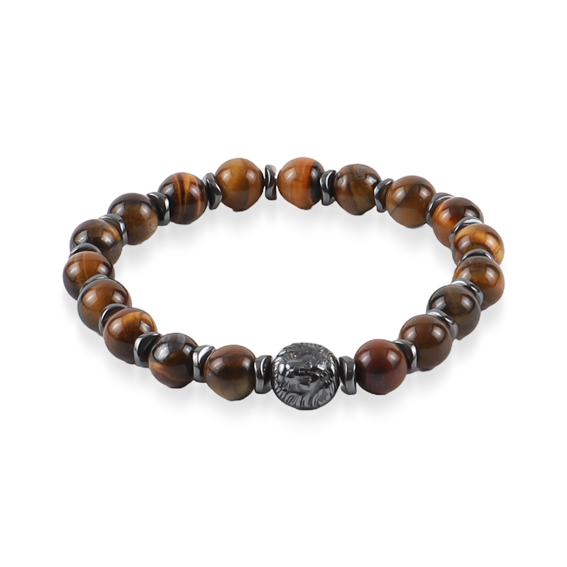 Ανδρικό χειροποίητο βραχιόλι με λιοντάρι και φυσικές ορυκτές πέτρες διακοσμημένο από καφέ μάτι τίγρης (0.8cm) και πλακέ ροδέλα αιματίτη (0.6cm).