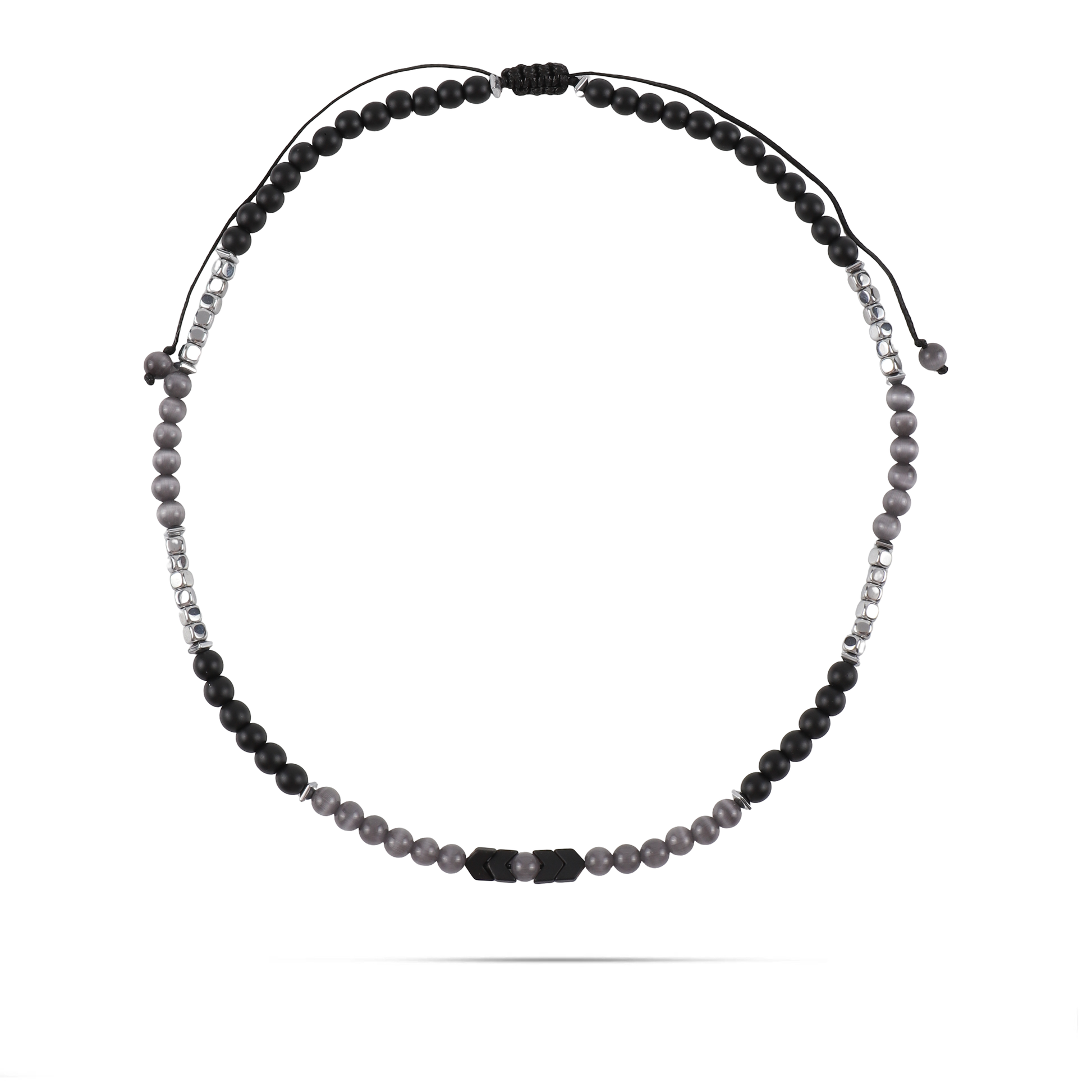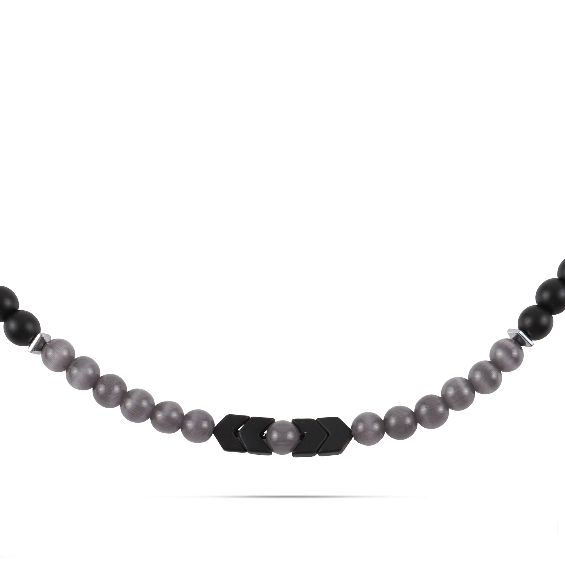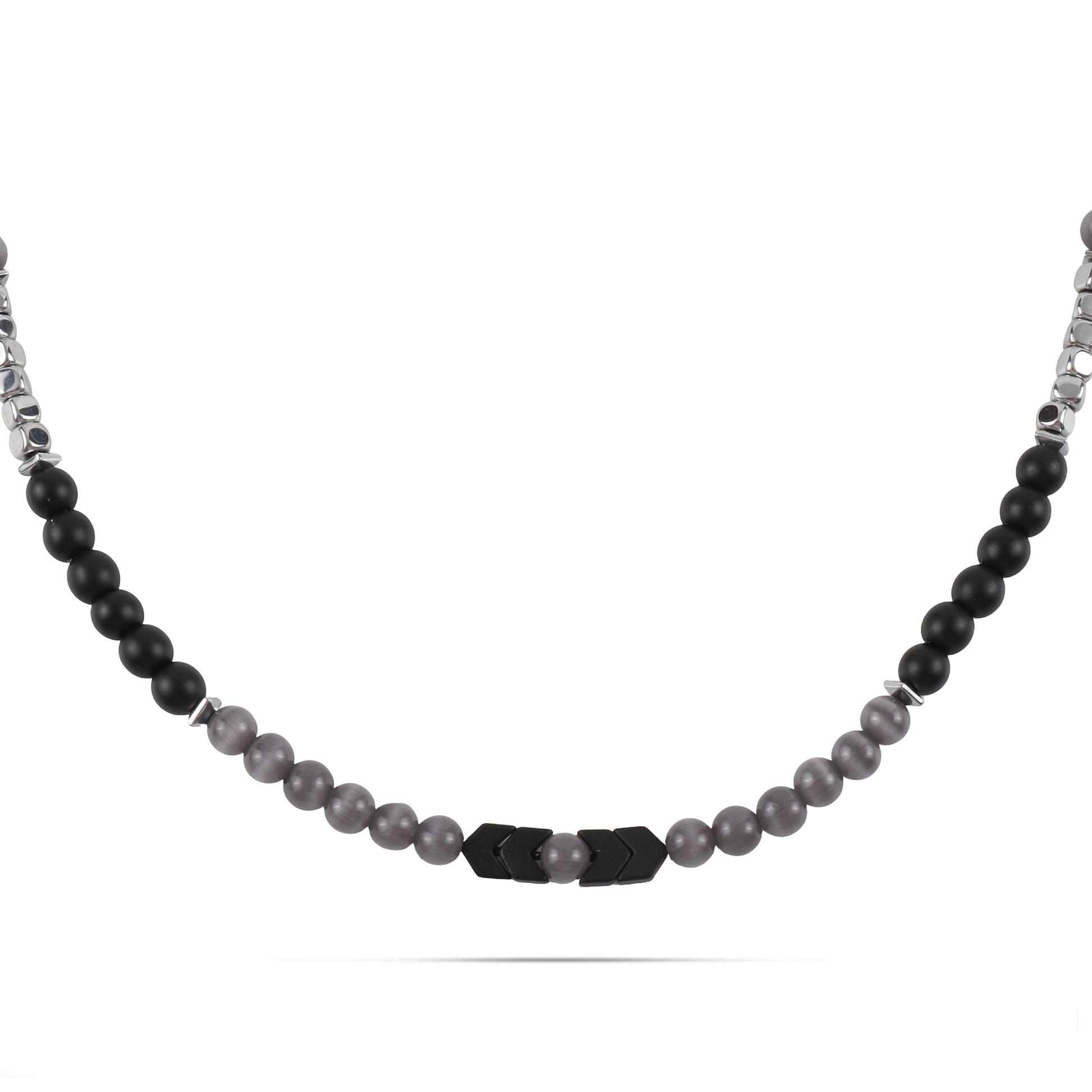 Ανδρικό χειροποίητο κολιέ με φυσικές ορυκτές πέτρες από από μάτι γάτας (0,6cm), ματ πέτρα όνυχα (0.6cm), μαύρα βέλη αιματίτη (0,6cm), ασημί ρόμβο αιματίτη (0,4cm) και ασημί κύβο αιματίτη (0.4cm).