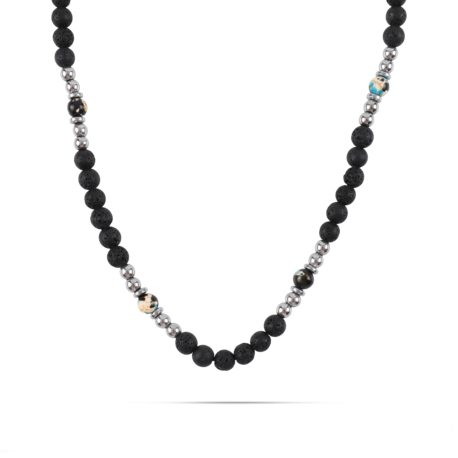 Ανδρικό χειροποίητο κολιέ με φυσικές ορυκτές πέτρες από μαύρη πέτρα λάβας (0,8cm), πολύχρωμο αχάτη (0.8cm), ασημί μπίλια αιματίτη (0,6cm) και ασημί ροδέλα αιματίτη (0,6cm).