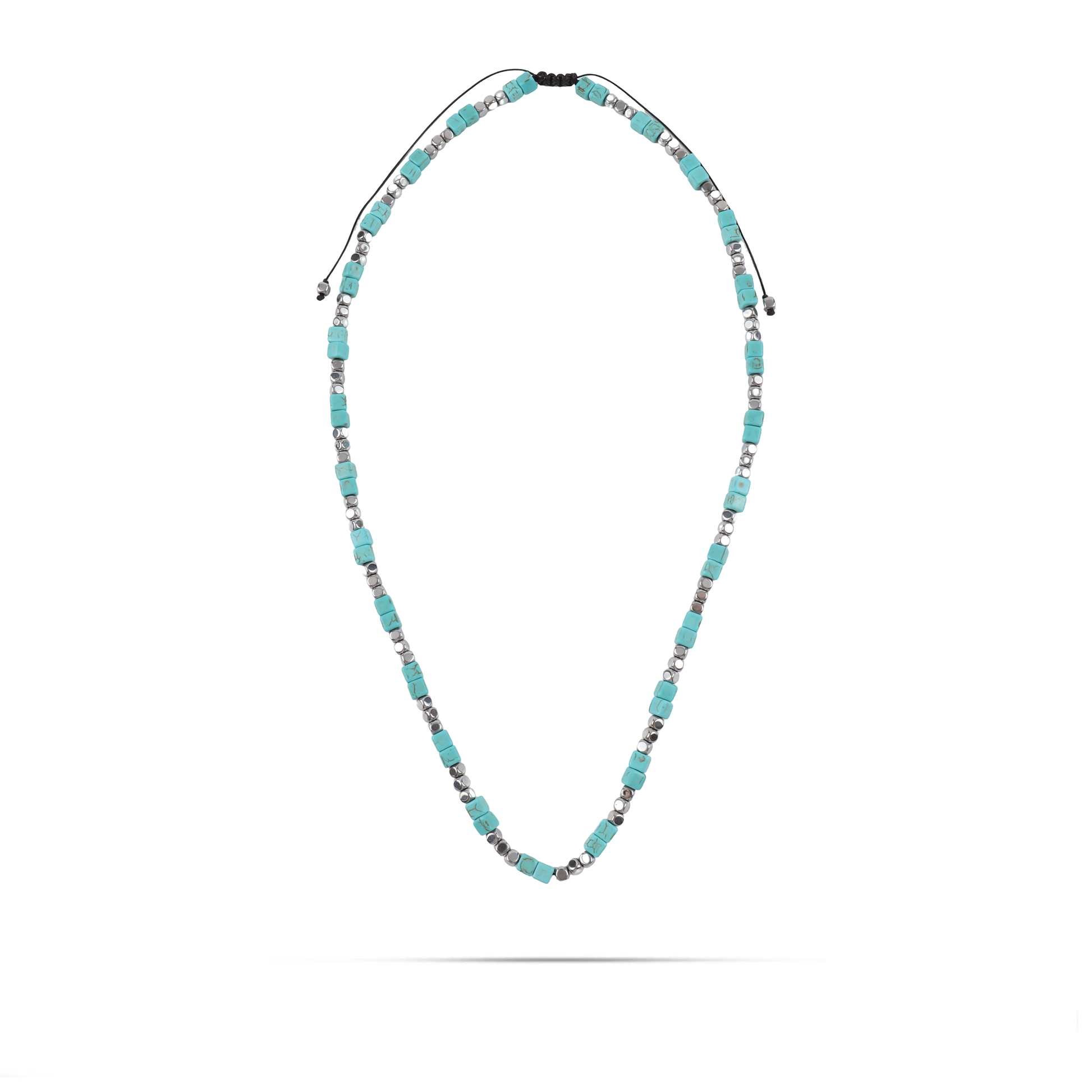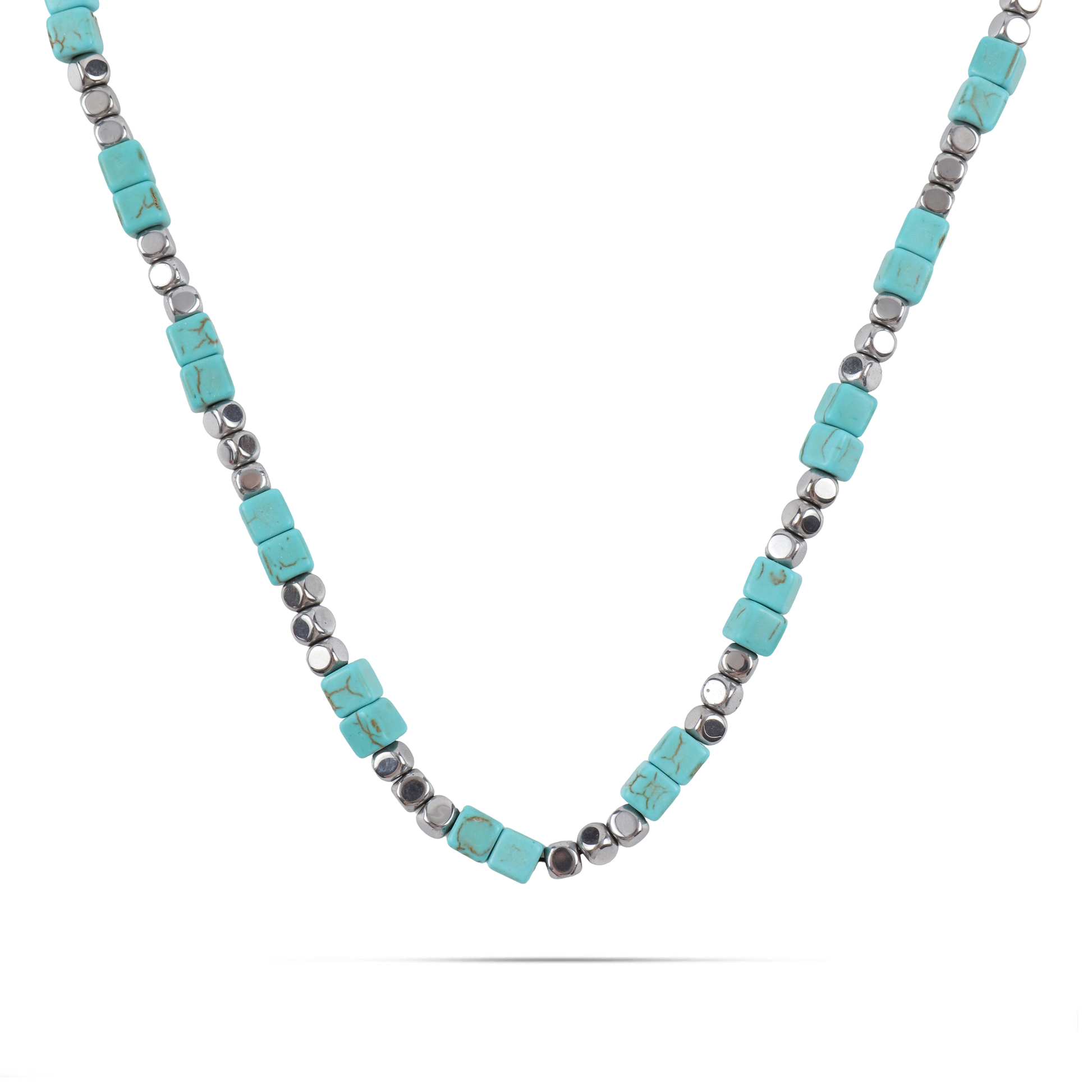 Ανδρικό χειροποίητο κολιέ με φυσικές ορυκτές πέτρες από τιρκουάζ κύβο χαολίτη (0,5cm), και ασημί κύβο αιματίτη (0.4cm).
