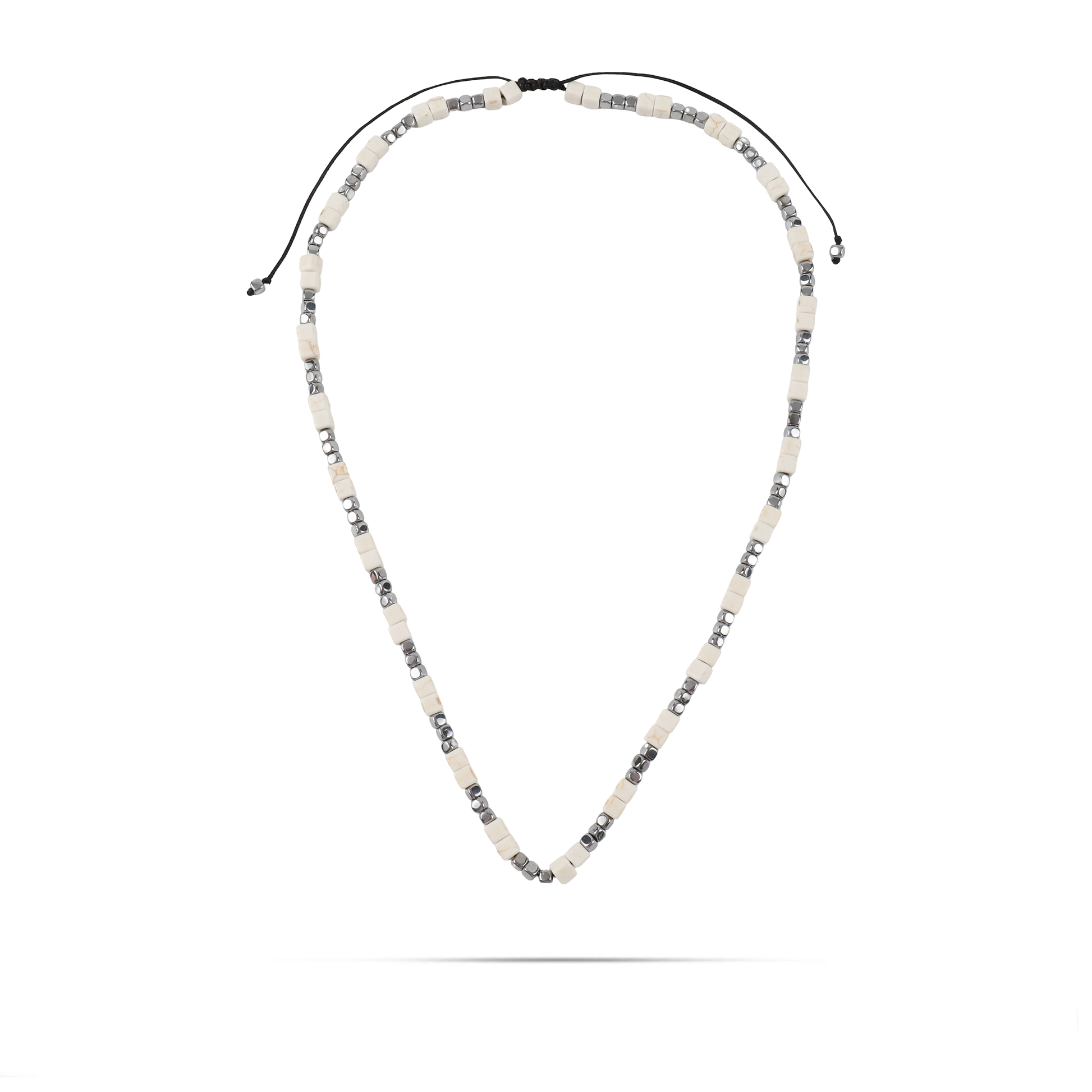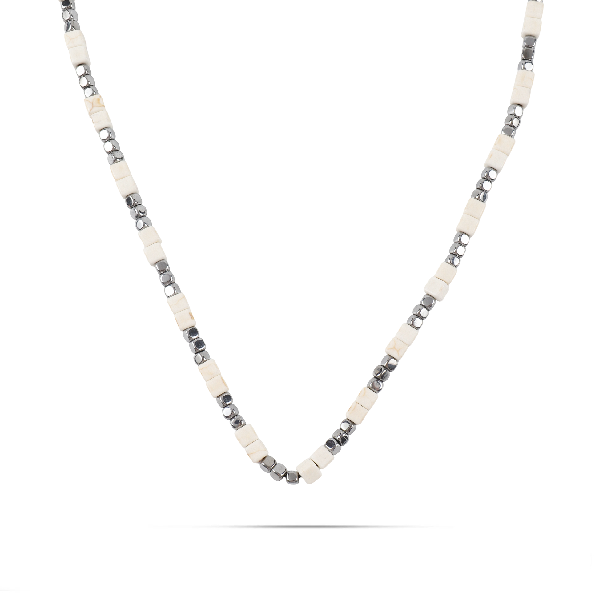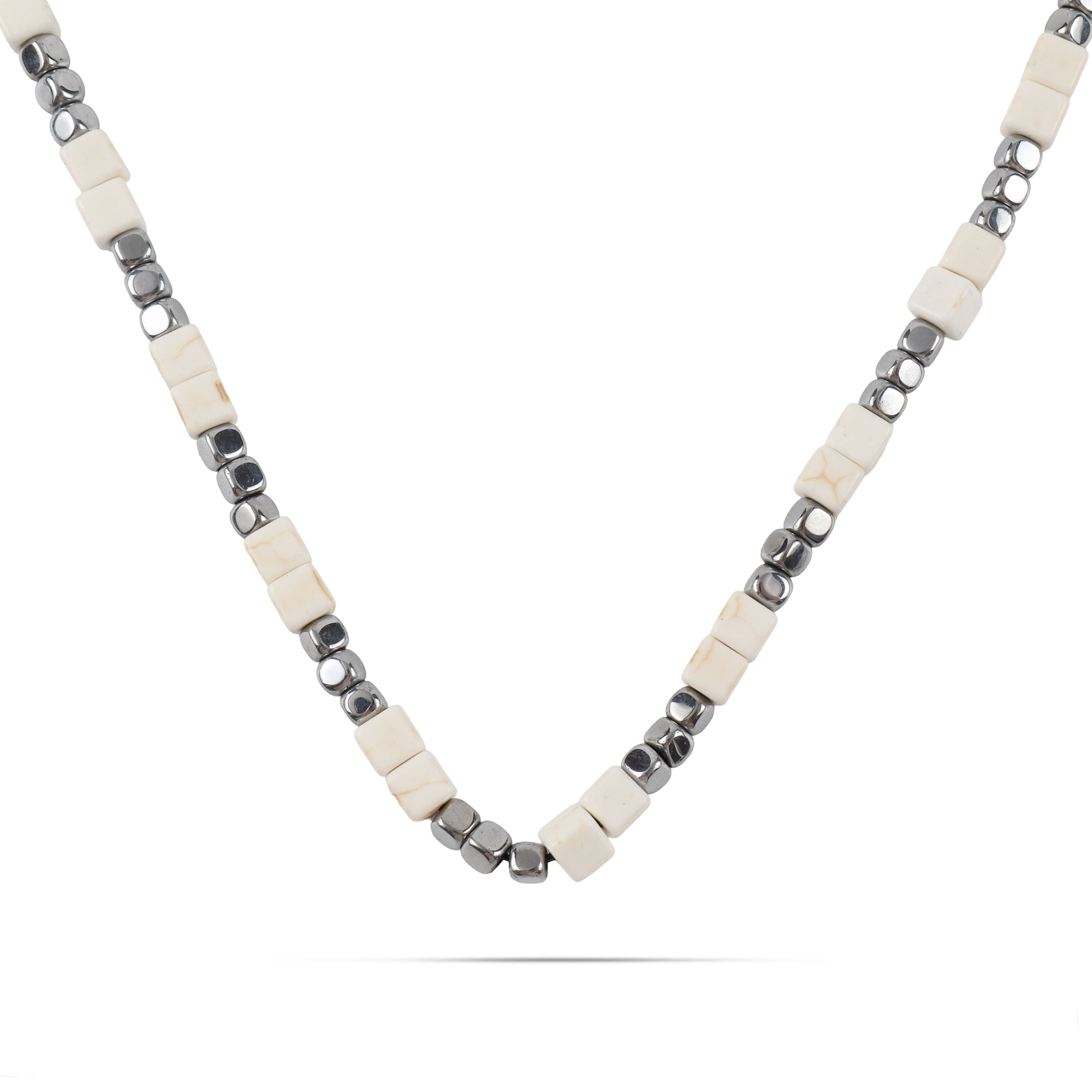 Ανδρικό χειροποίητο κολιέ με φυσικές ορυκτές πέτρες από λευκούς κύβους αχάτη (0,5cm) και ασημί κύβο αιματίτη (0.4cm).
