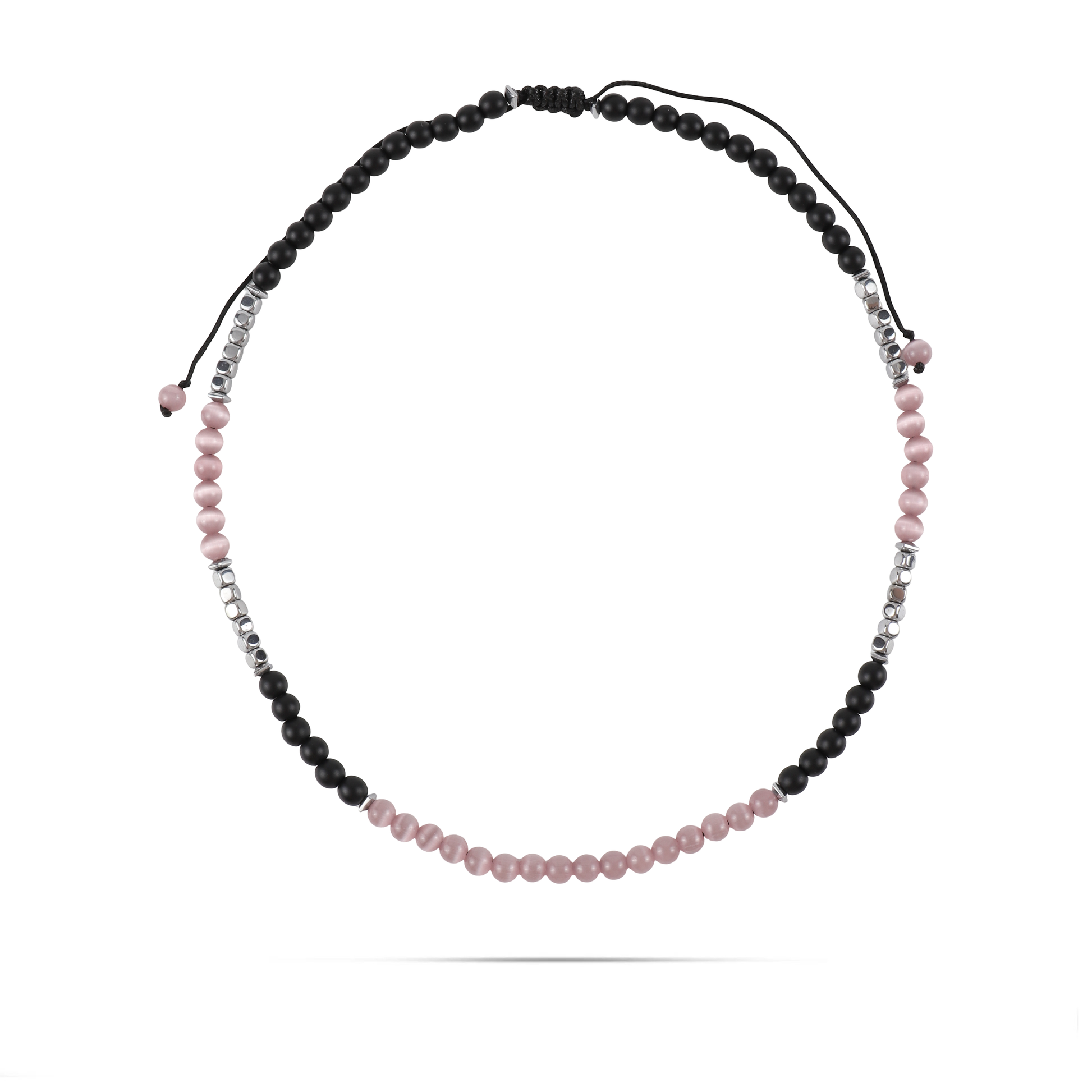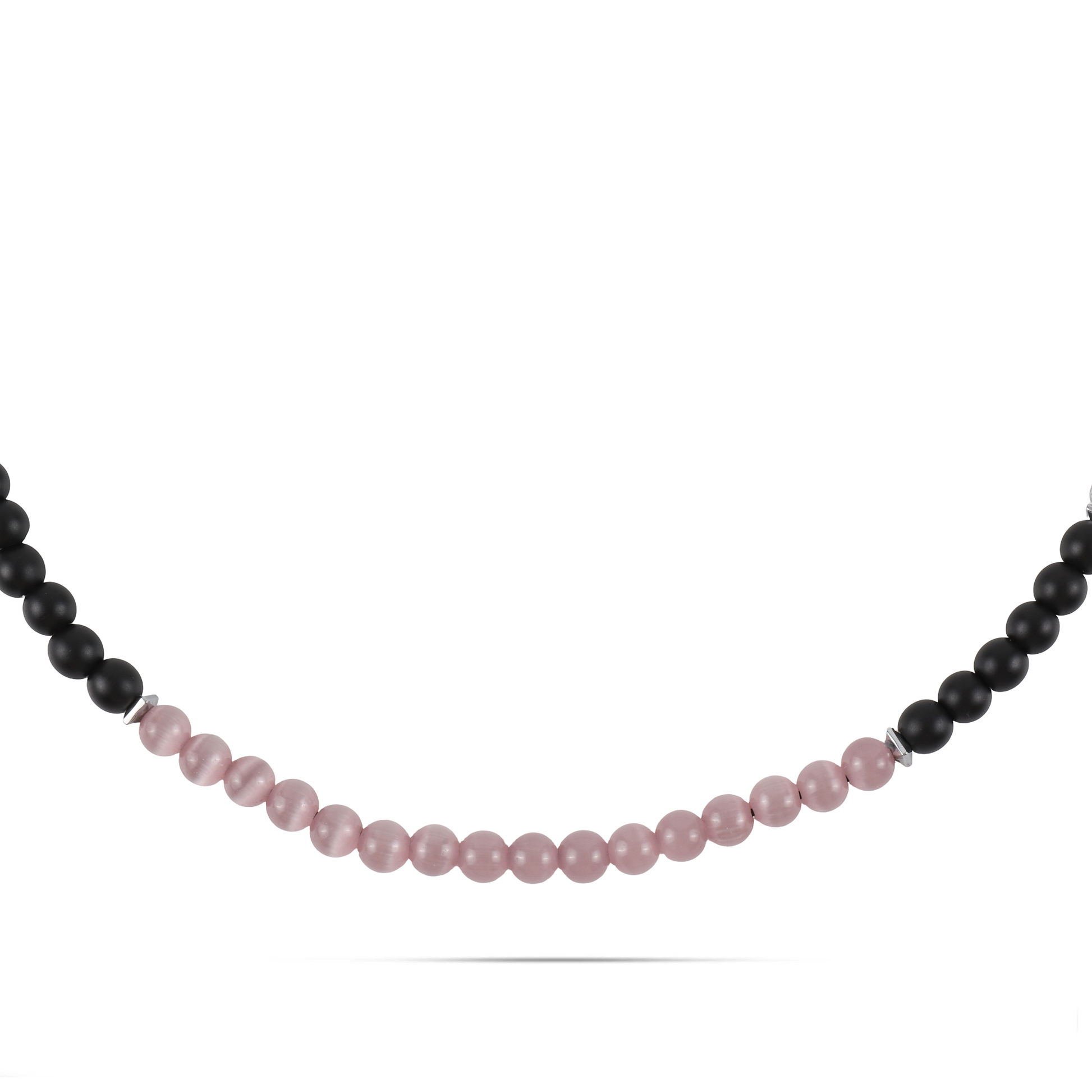 Ανδρικό χειροποίητο κολιέ με φυσικές ορυκτές πέτρες από ροζ μάτι γάτας (0,6cm), ματ πέτρα όνυχα (0.6cm), ασημί ρόμβο αιματίτη (0,4cm) και ασημί κύβο αιματίτη (0.4cm).