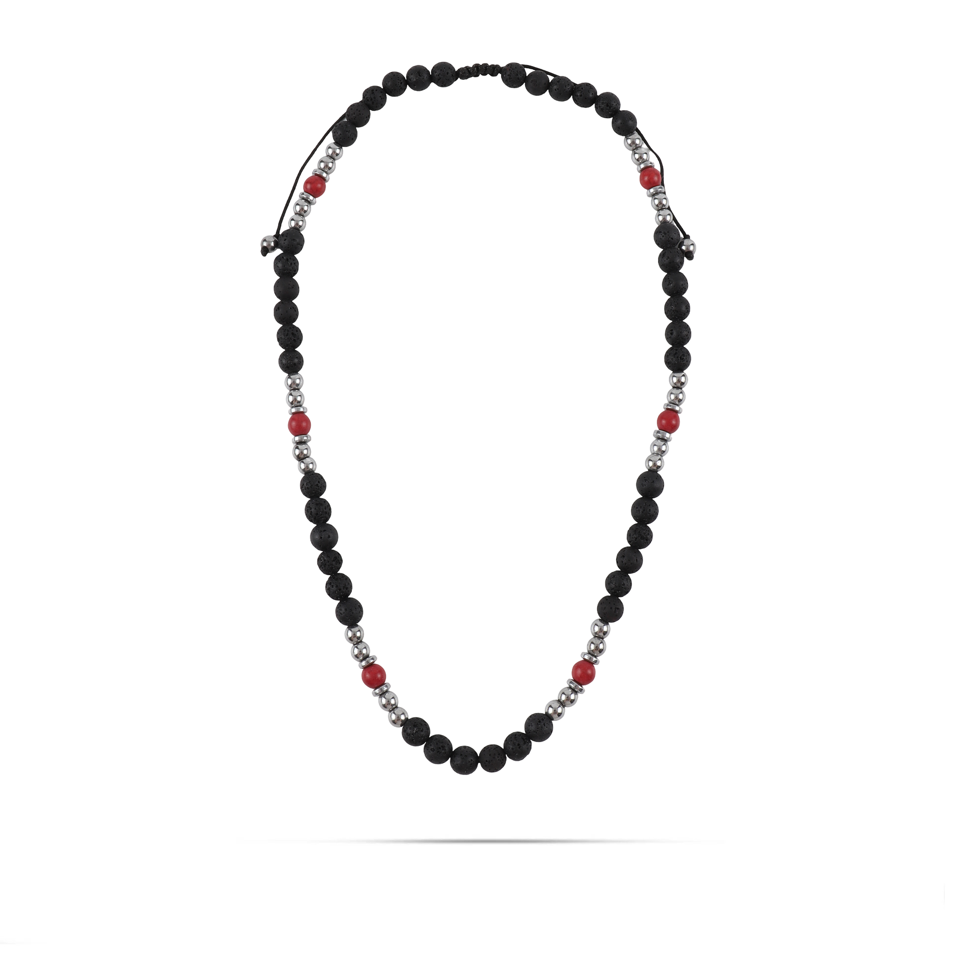Ανδρικό χειροποίητο κολιέ με φυσικές ορυκτές πέτρες από μαύρη πέτρα λάβας (0,8cm), κόκκινο χαολίτη (0,7cm), ασημί μπίλια αιματίτη (0,6cm) και ασημί ροδέλα αιματίτη (0,6cm).