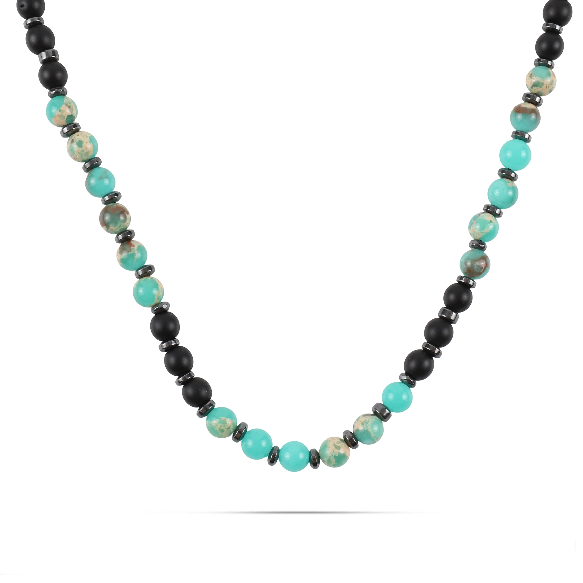 Ανδρικό χειροποίητο κολιέ με φυσικές ορυκτές πέτρες από τιρκουάζ ταγιέ αχάτη (0.6cm), μαύρο ματ όνυχα (0.6cm) και ασημί ροδέλα αιματίτη (0.4cm).