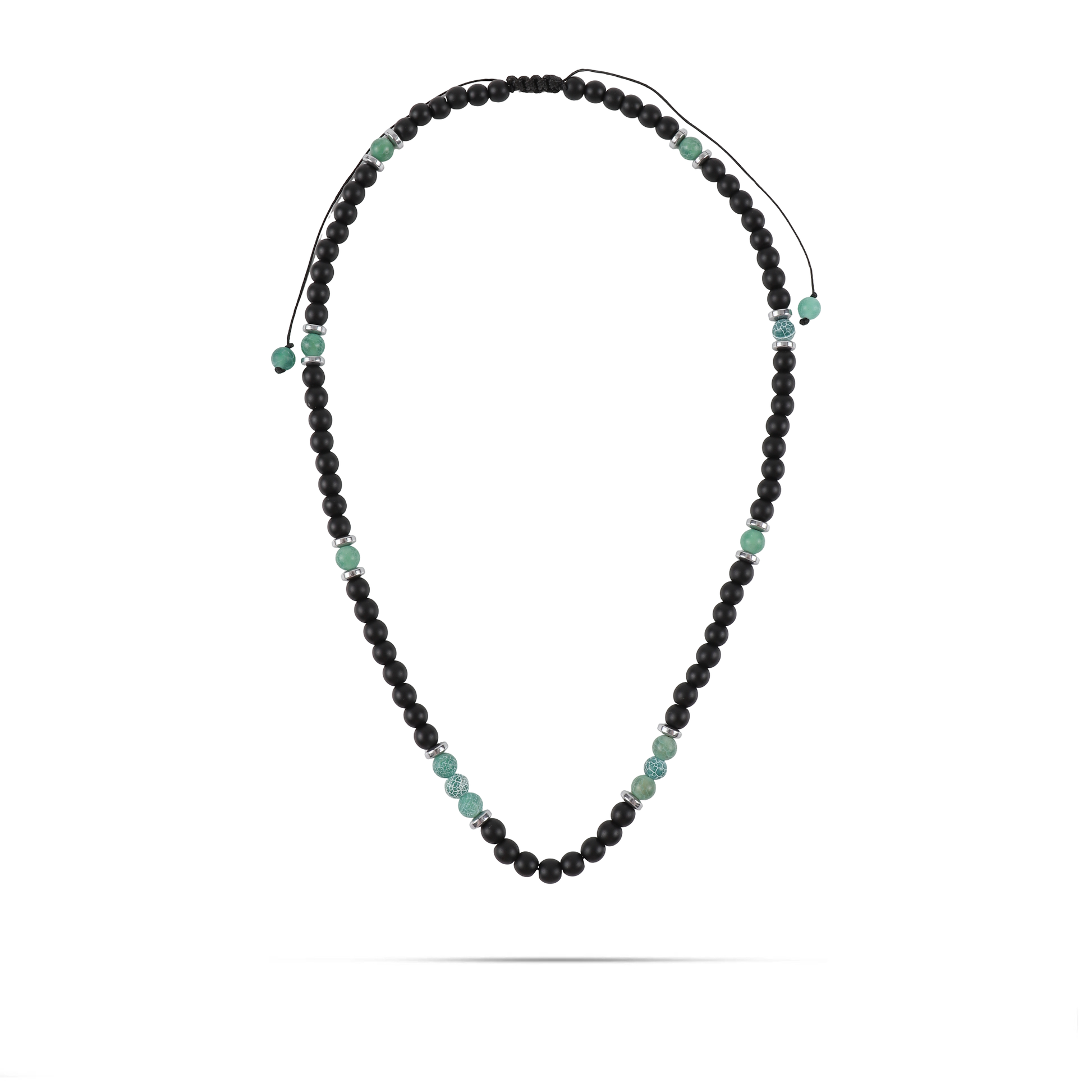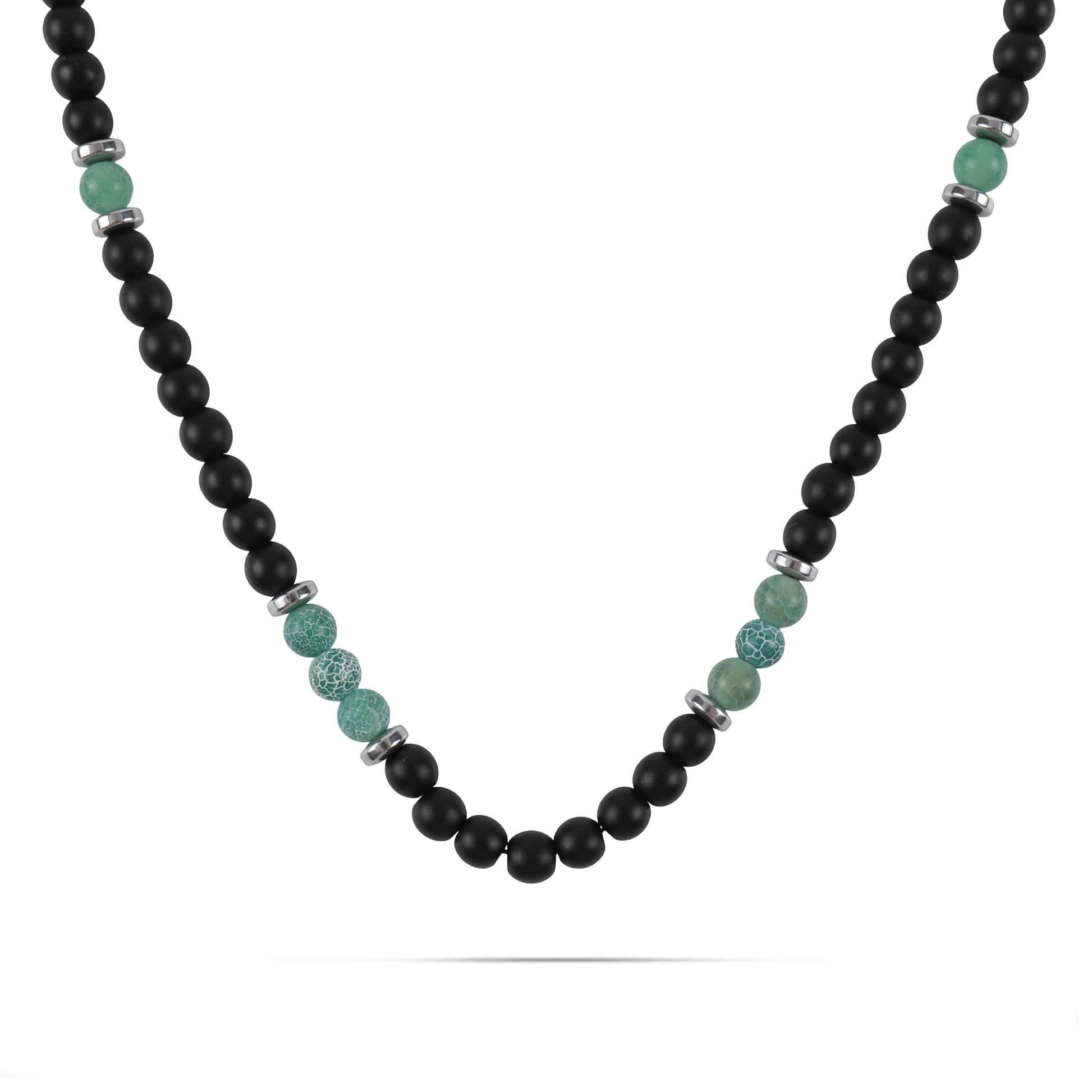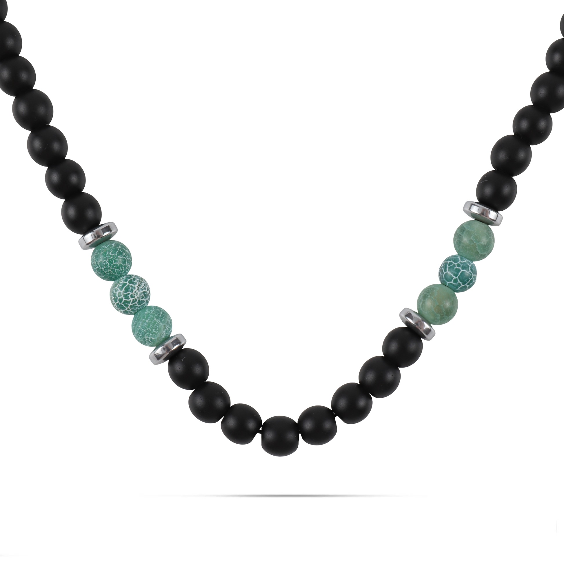 Ανδρικό χειροποίητο κολιέ με φυσικές ορυκτές πέτρες από όνυχα (0,6cm), πράσινο ταγιέ αχάτη (0,6cm) και ασημί πλακέ ροδέλα αιματίτη (0,6cm).