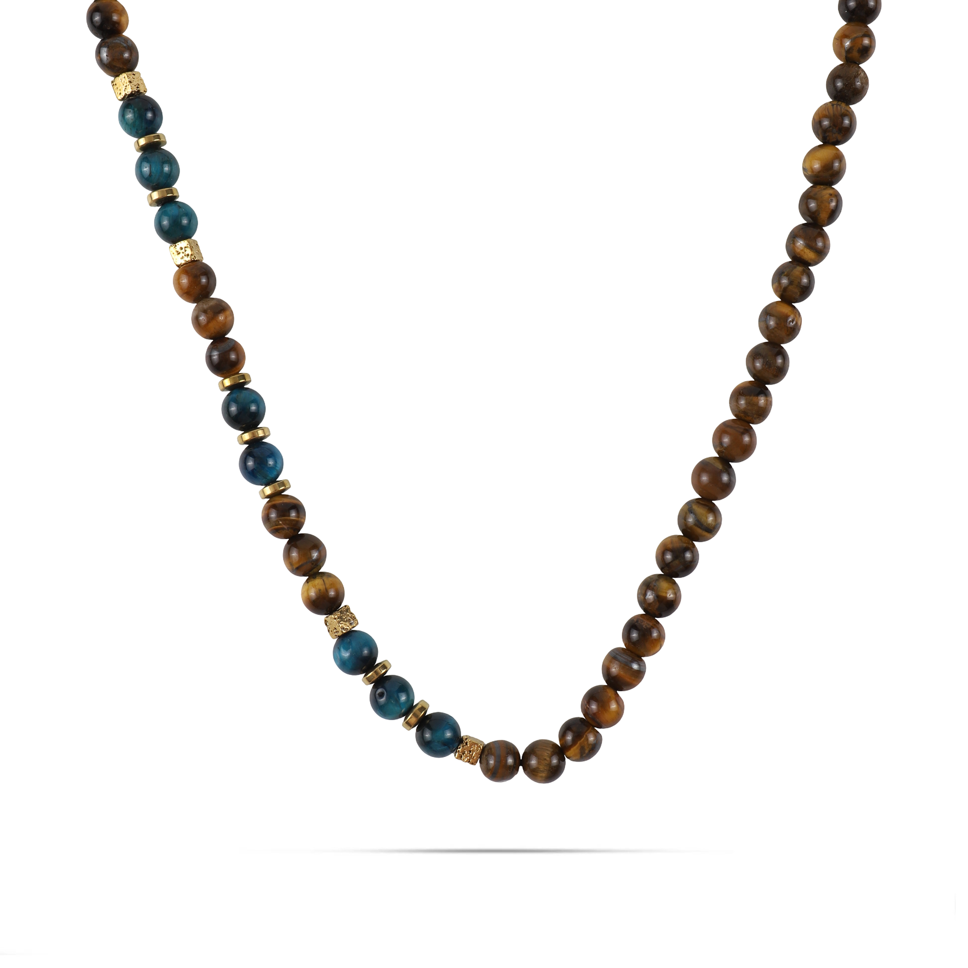 Ανδρικό χειροποίητο κολιέ με φυσικές ορυκτές πέτρες από καφέ και μπλε μάτι τίγρης (0,8cm), χρυσή πλακέ ροδέλα αιματίτη (0,6cm) και χρυσό κύβο αιματίτη (0,4cm).