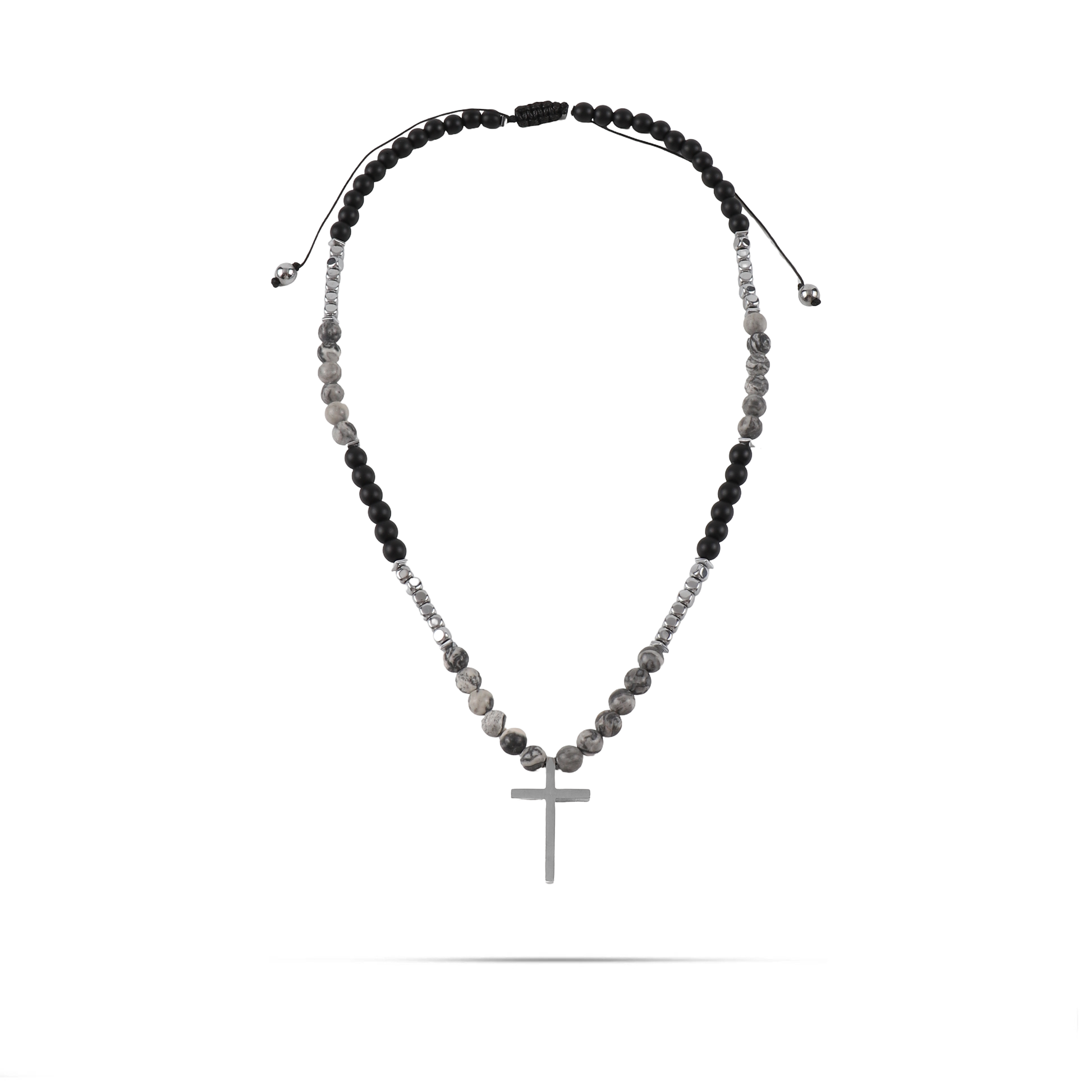Ανδρικό χειροποίητο κολιέ σταυρός μακραμέ Mar and Mar Vesper (Gray) με φυσικές ορυκτές πέτρες από Λαρβικίτη Λάβα και Αιματίτη