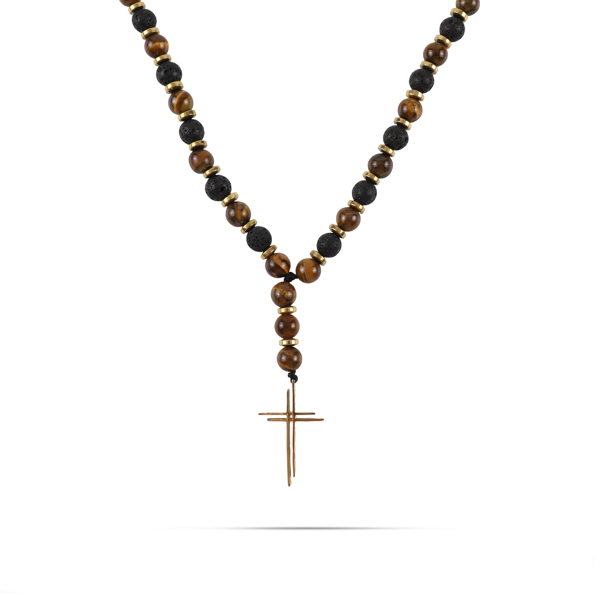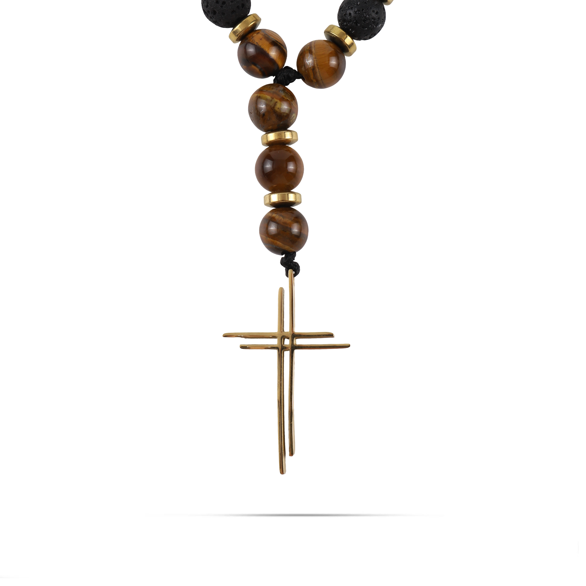 Ανδρικό χειροποίητο κολιέ με σταυρό και φυσικές ορυκτές πέτρες από καφέ μάτι τίγρη (0,8cm), μαύρη πέτρα λάβας (0,8cm) και χρυσή ροδέλα αιματίτη (0.6cm).