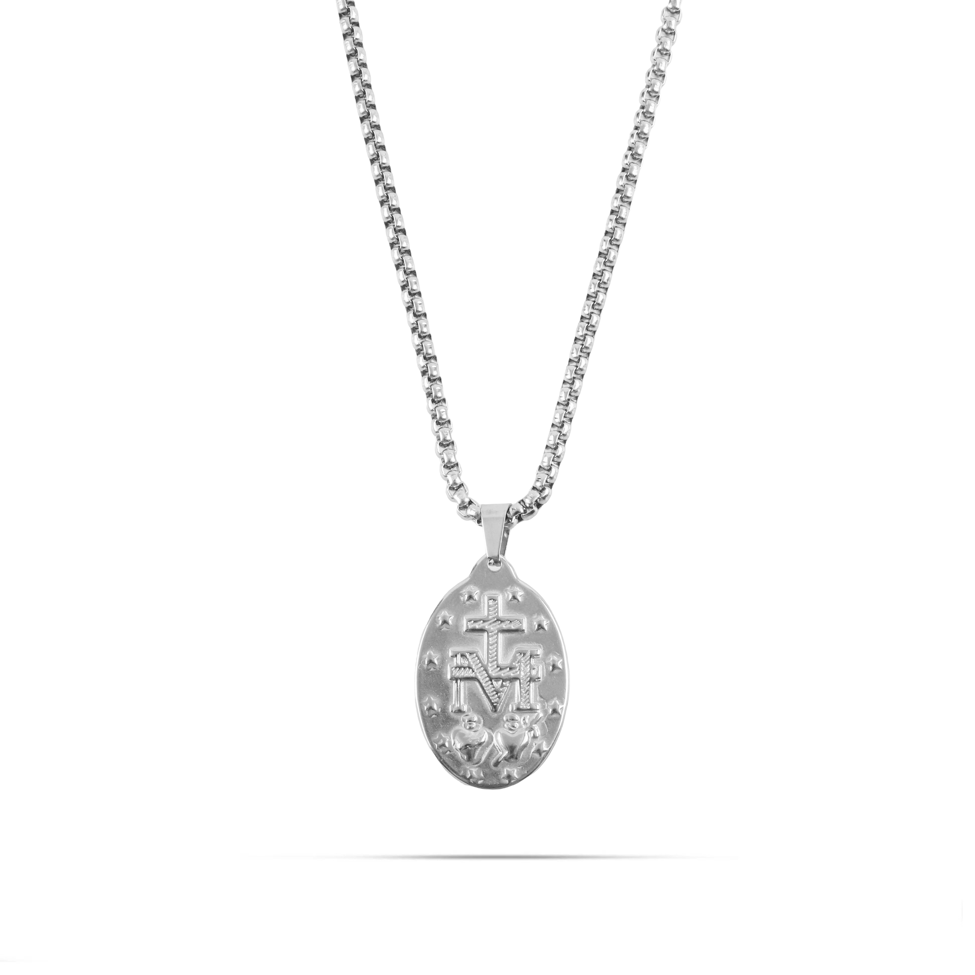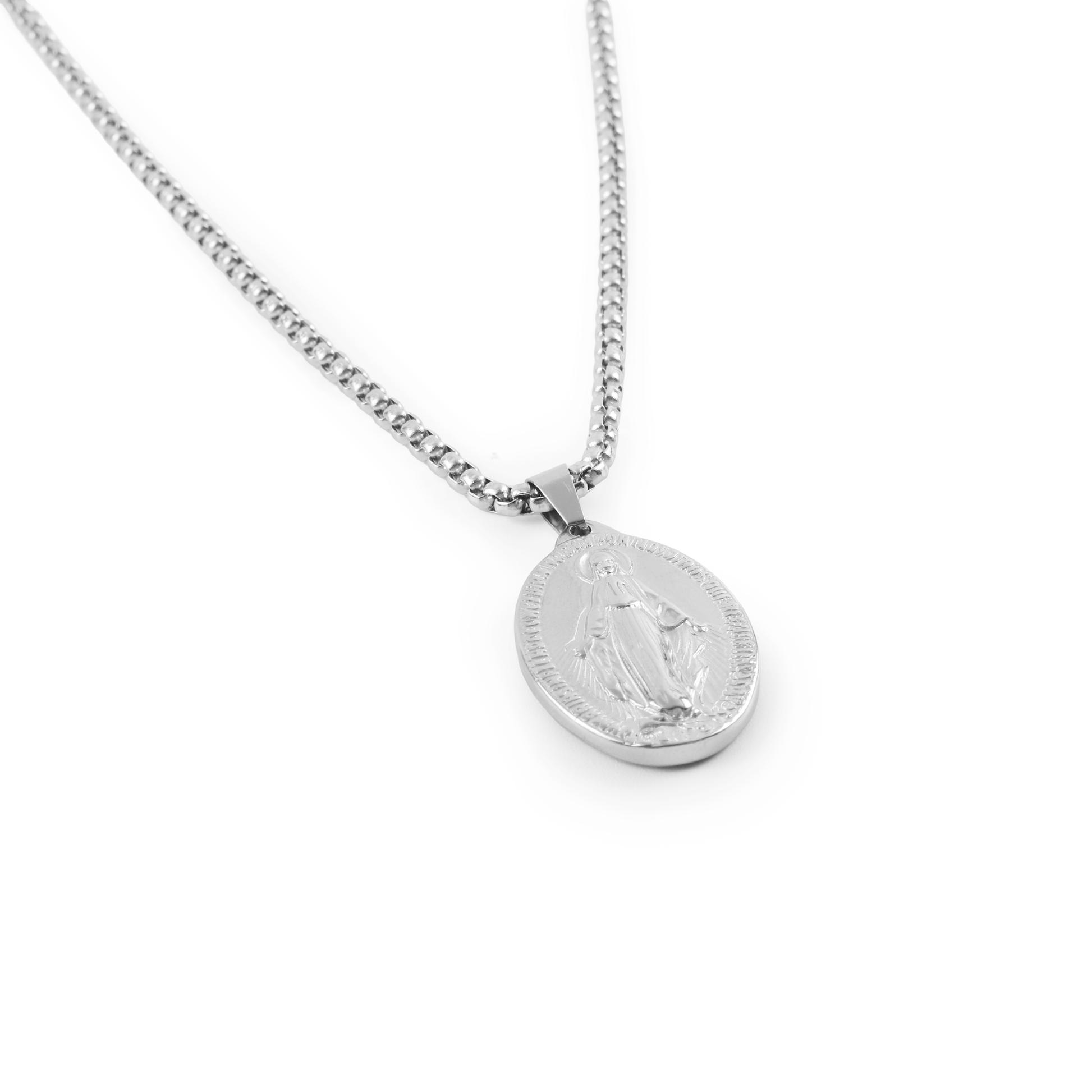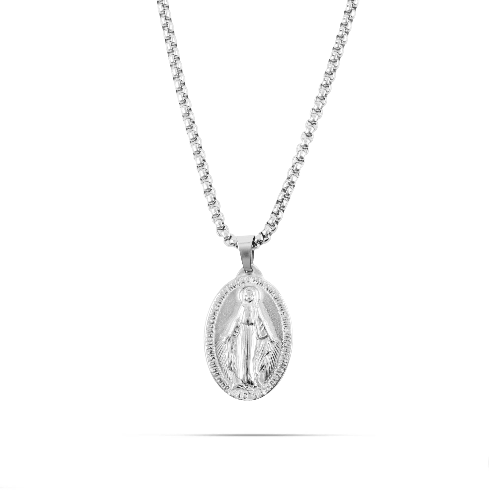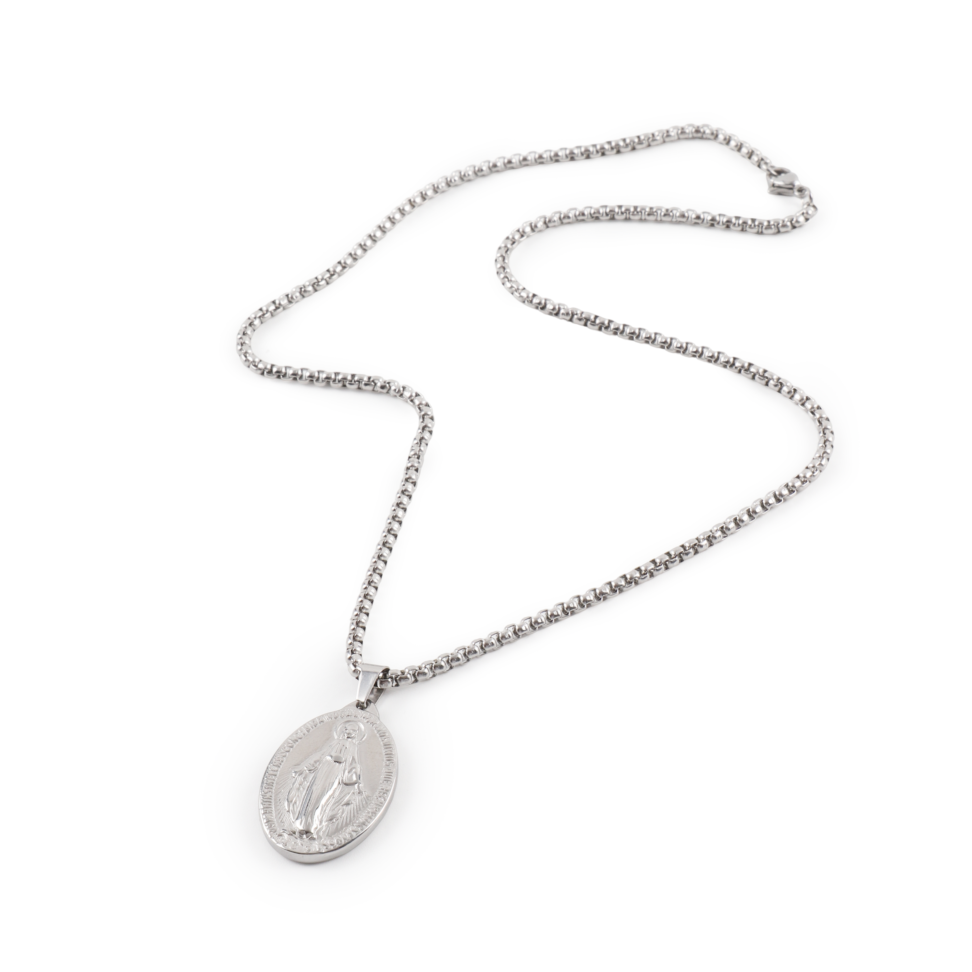 Κολιέ από ανοξείδωτο ατσάλι σε κομψό ασημί φινίρισμα. Ένα εκλεπτυσμένο κόσμημα με αλυσίδα και εντυπωσιακό οβάλ μενταγιόν που απεικονίζει την Παναγία – ένα διαχρονικό σύμβολο πίστης και προστασίας.