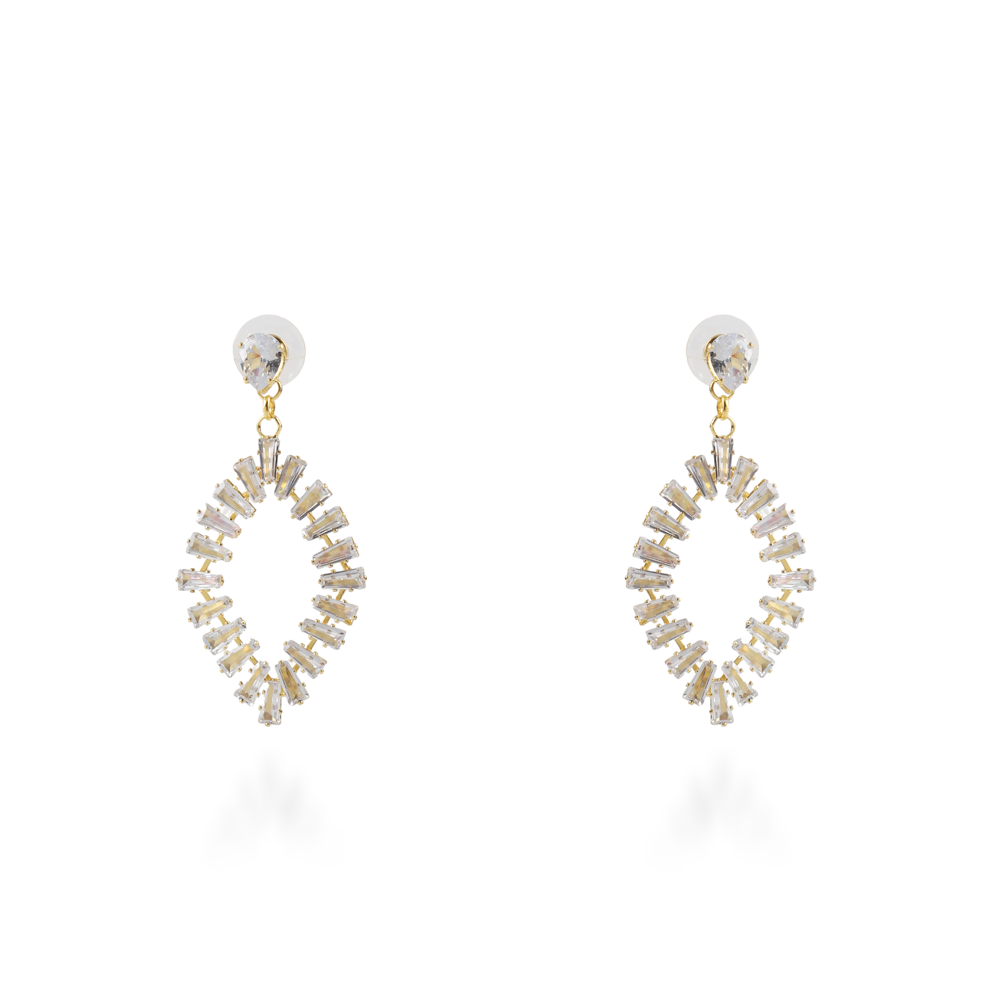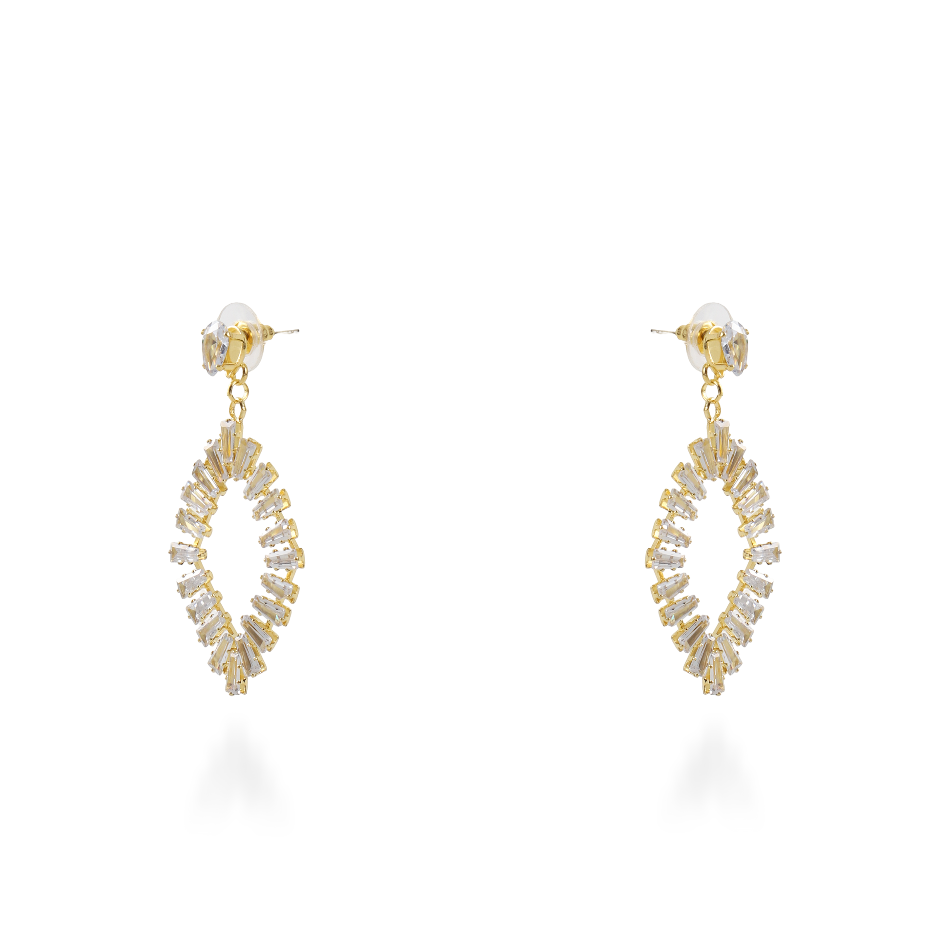 Σκουλαρίκια κρεμαστά από ορείχαλκο διακοσμημένα με πέτρες Baguette Zircon ένα εντυπωσιακό κόσμημα που διαθέτει μια εκλεπτυσμένη γοητεία. Αυτό το είδος κοσμημάτων είναι ιδανικό για επίσημες εκδηλώσεις και βραδινές εξόδους, προσδίδοντας λάμψη και κομψότητα στην εμφάνισή σας.