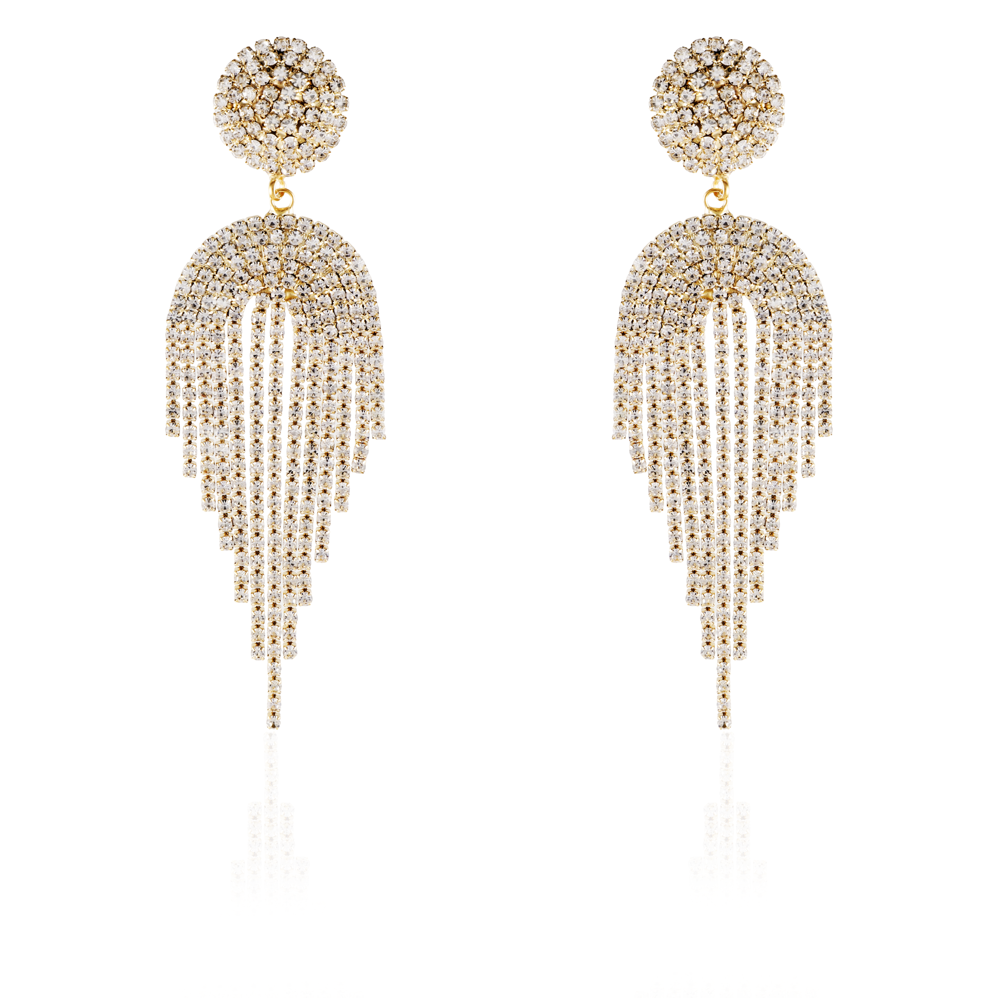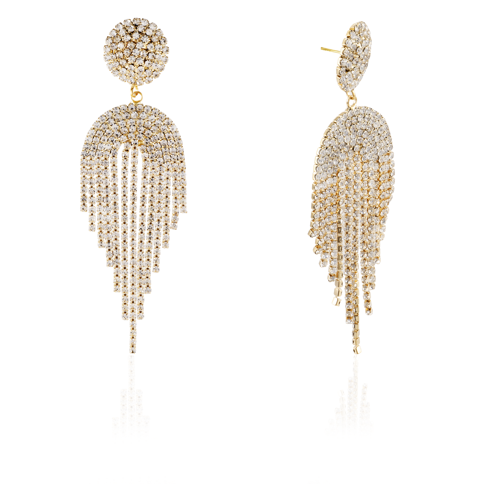 Σκουλαρίκια κρεμαστά από ορείχαλκο σε χρυσό χρώμα, με φανταστικό σχέδιο διακοσμημένο με λαμπερές πέτρες Zircon μια εντυπωσιακή επιλογή για το στυλ σας. Αυτά τα σκουλαρίκια είναι ιδανικά για ειδικές περιστάσεις ή για να προσφέρουν μια ξεχωριστή πινελιά στην καθημερινή εμφάνισή σας.