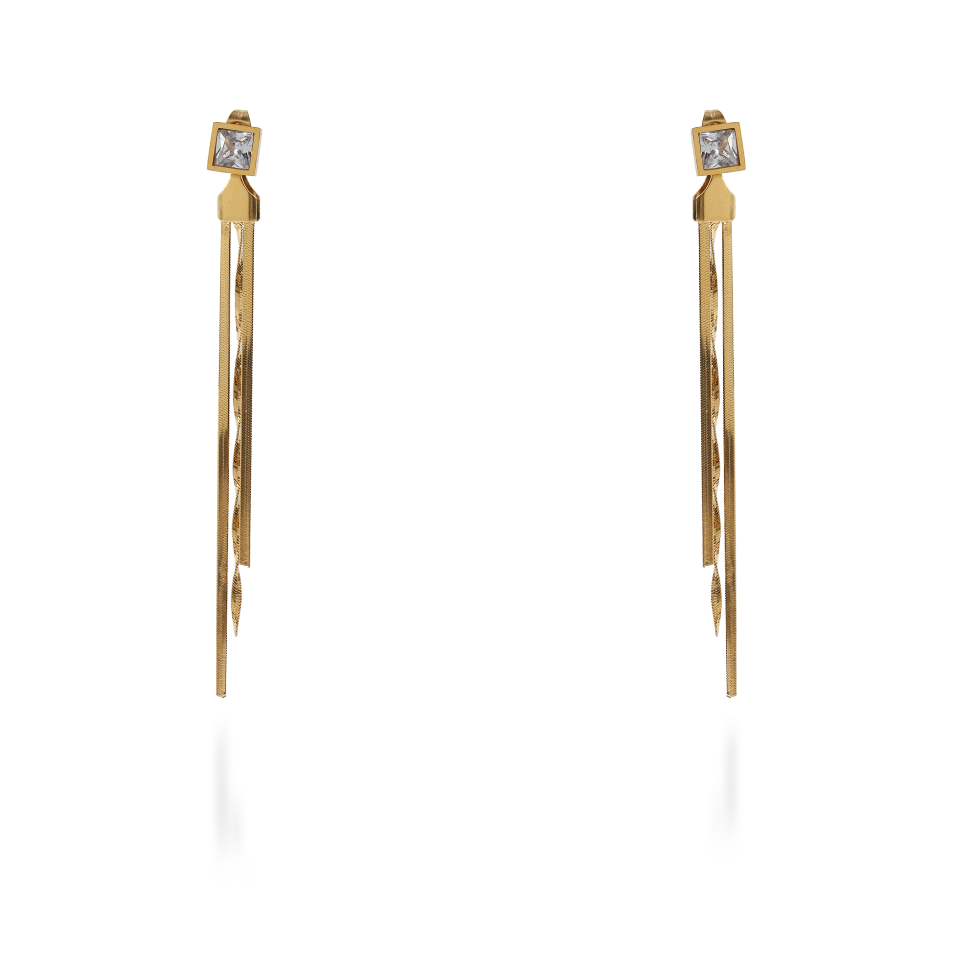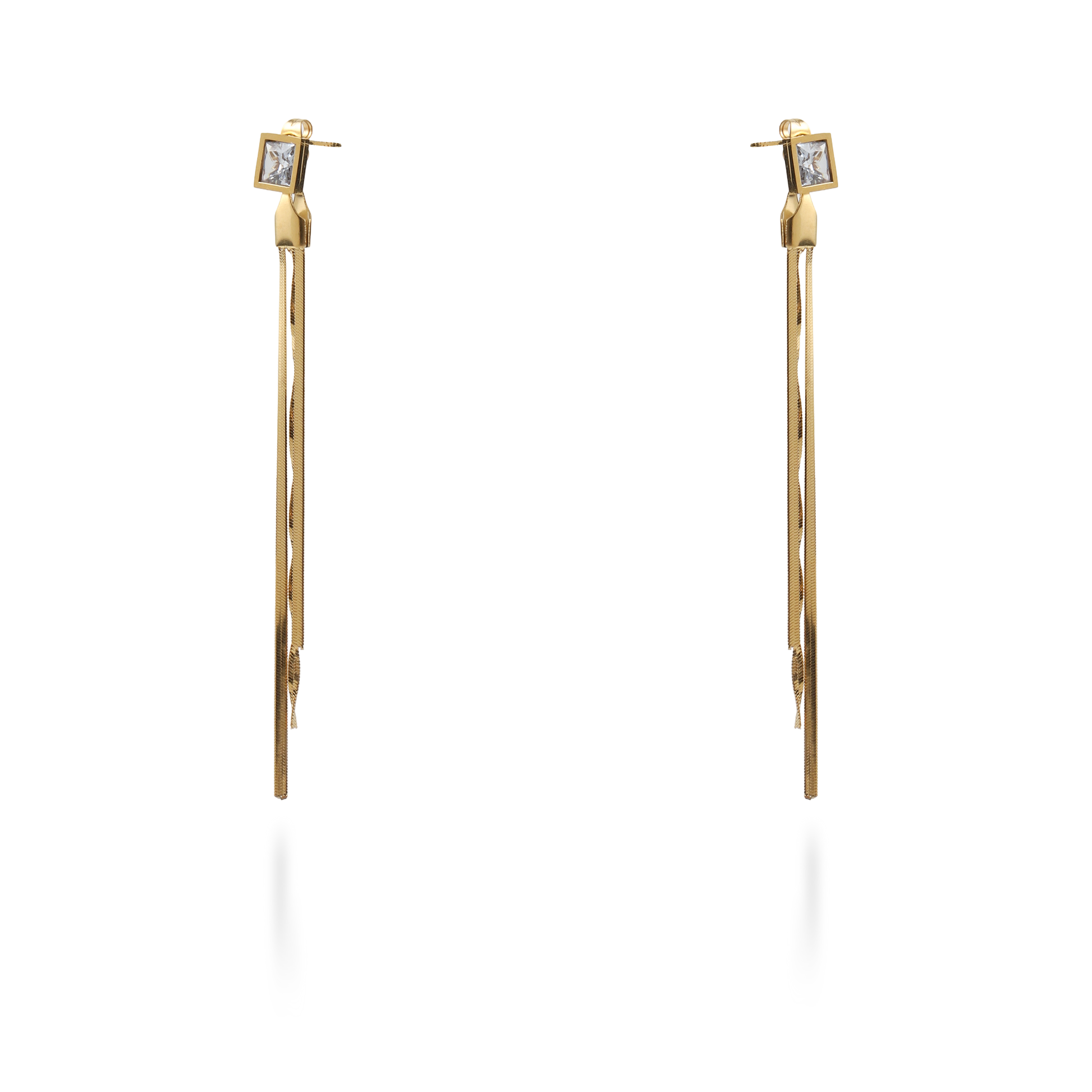 Σκουλαρίκια κρεμαστά από ανοξείδωτο ατσάλι διακοσμημένα με πέτρα Zircon και κρεμαστά Flat Snake αλυσιδάκια ένα εντυπωσιακό κόσμημα που δίνει λάμψη. Το ανοξείδωτο ατσάλι εξασφαλίζει αντοχή και λάμψη που διαρκεί, ενώ η λαμπερή πέτρα Zircon προσδίδει ένα απόλυτα λαμπερό αποτέλεσμα. Αυτά τα σκουλαρίκια είναι ιδανικά για κάθε περίσταση, από τις καθημερινές εμφανίσεις μέχρι τις επίσημες εκδηλώσεις. Μπορείτε να τα συνδυάσετε με άλλα κοσμήματα από τη συλλογή σας για ένα εντυπωσιακό αποτέλεσμα, ή να τα φορέσετε μόνα τους για ένα διακριτικό και κομψό look.