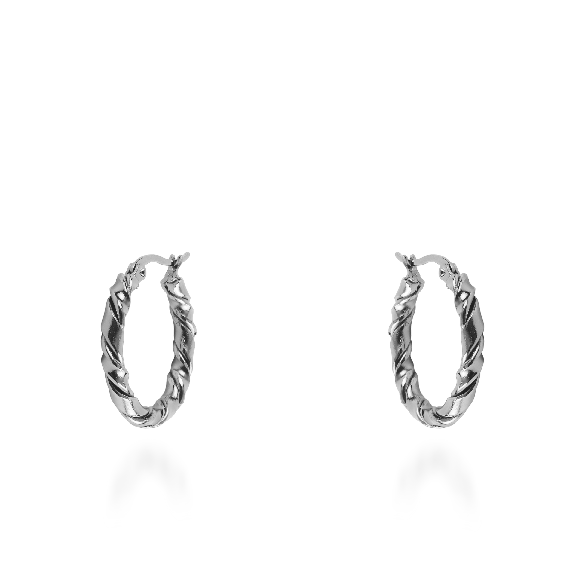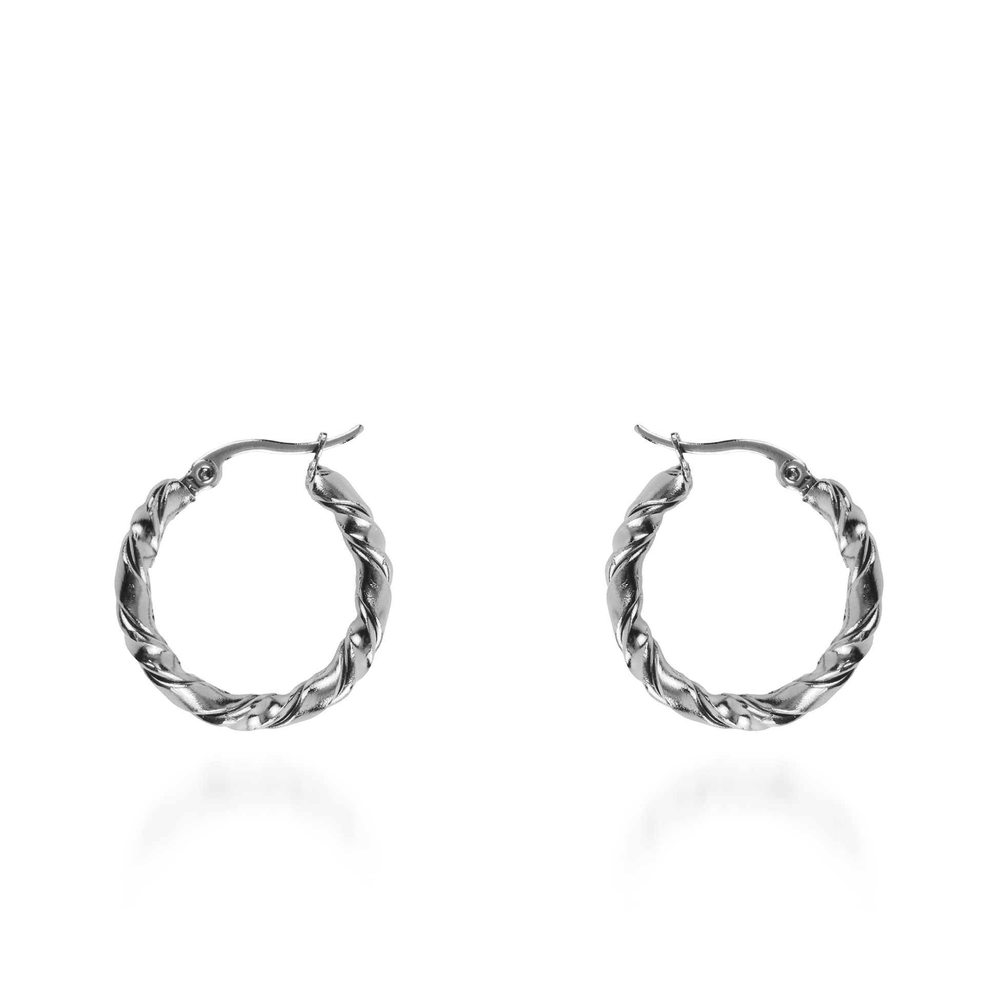 Σκουλαρίκια κρίκοι από ανοξείδωτο ατσάλι σε ασημί χρώμα με ιδιαίτερο στριφογυριστό σχέδιο που προσφέρουν έναν δυναμικό και μοντέρνο χαρακτήρα στο στυλ σας. Αυτά τα εντυπωσιακά και μοντέρνα σκουλαρίκια είναι ιδανικά για κάθε περίσταση, προσθέτοντας μια δόση στυλ και προσωπικότητας στο σύνολό σας.