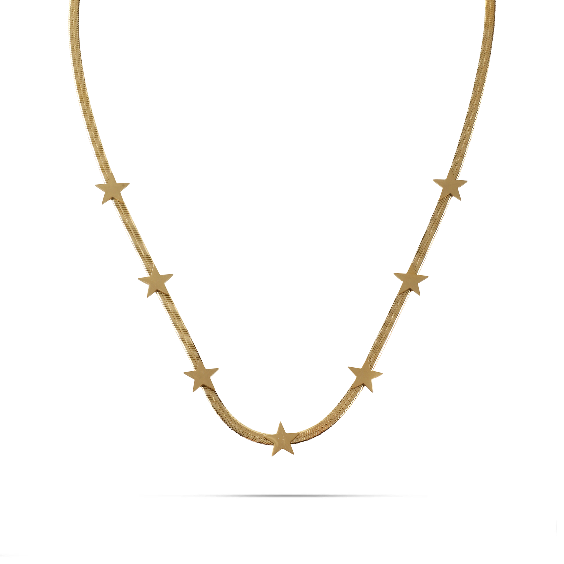 Κολιέ από ανοξείδωτο ατσάλι σε ζεστό χρυσό χρώμα με αλυσίδα τύπου Flat Snake, διακοσμημένη με μικρά αστέρια που χαρίζουν φωτεινότητα και παιχνιδιάρικη κομψότητα. Το μοναδικό σχέδιο προσθέτει μοντέρνα λάμψη, καθιστώντας το ιδανικό για καθημερινά αλλά και ιδιαίτερα looks.