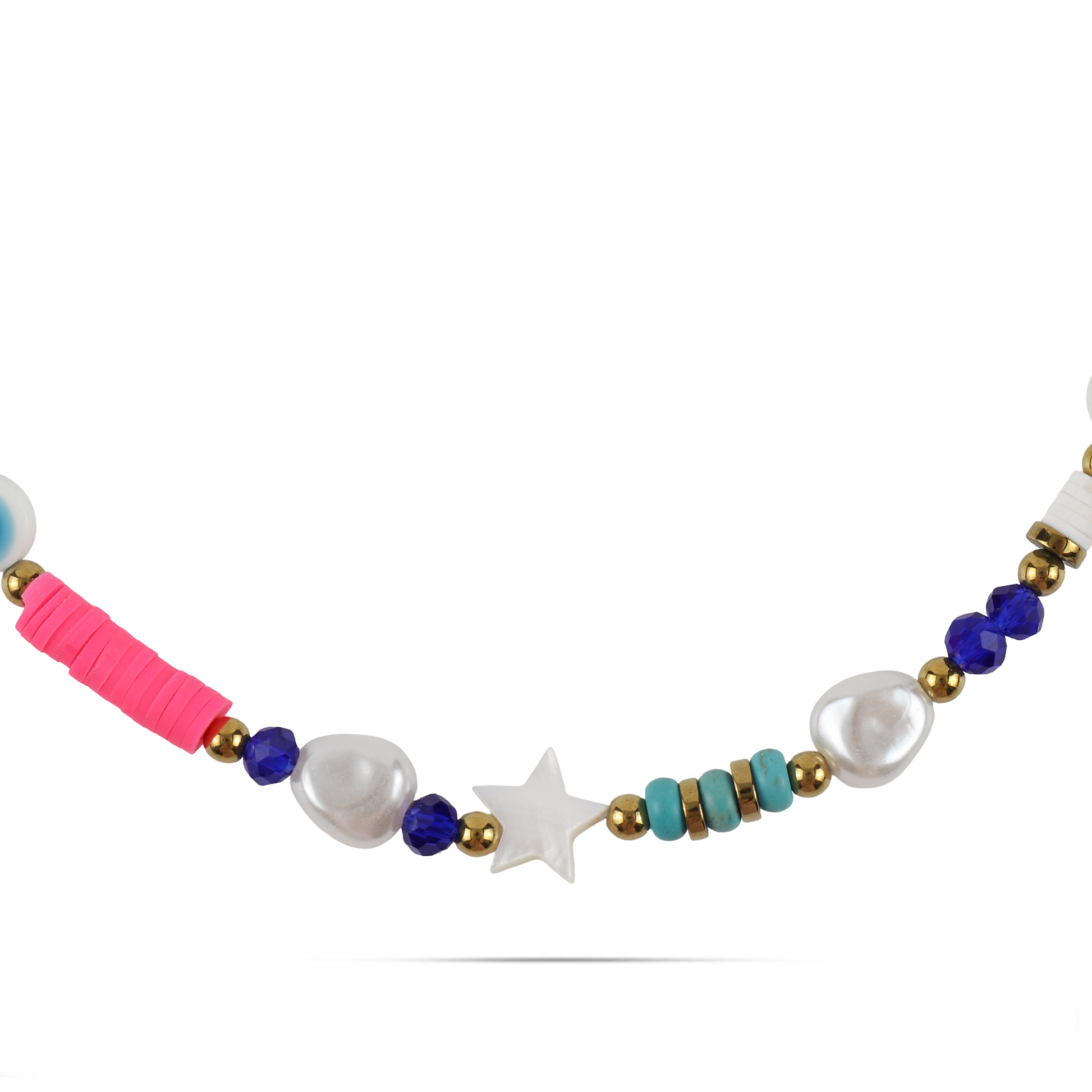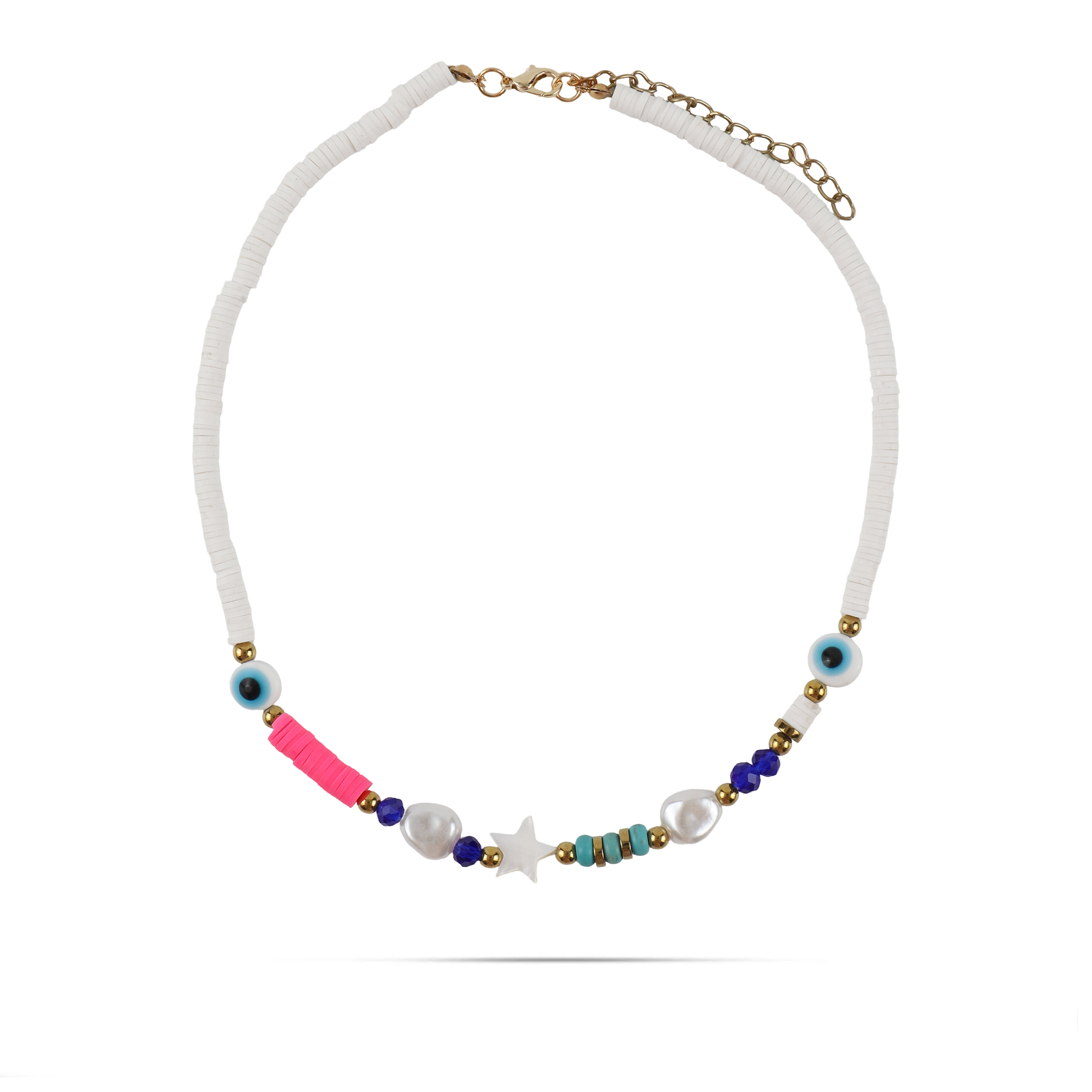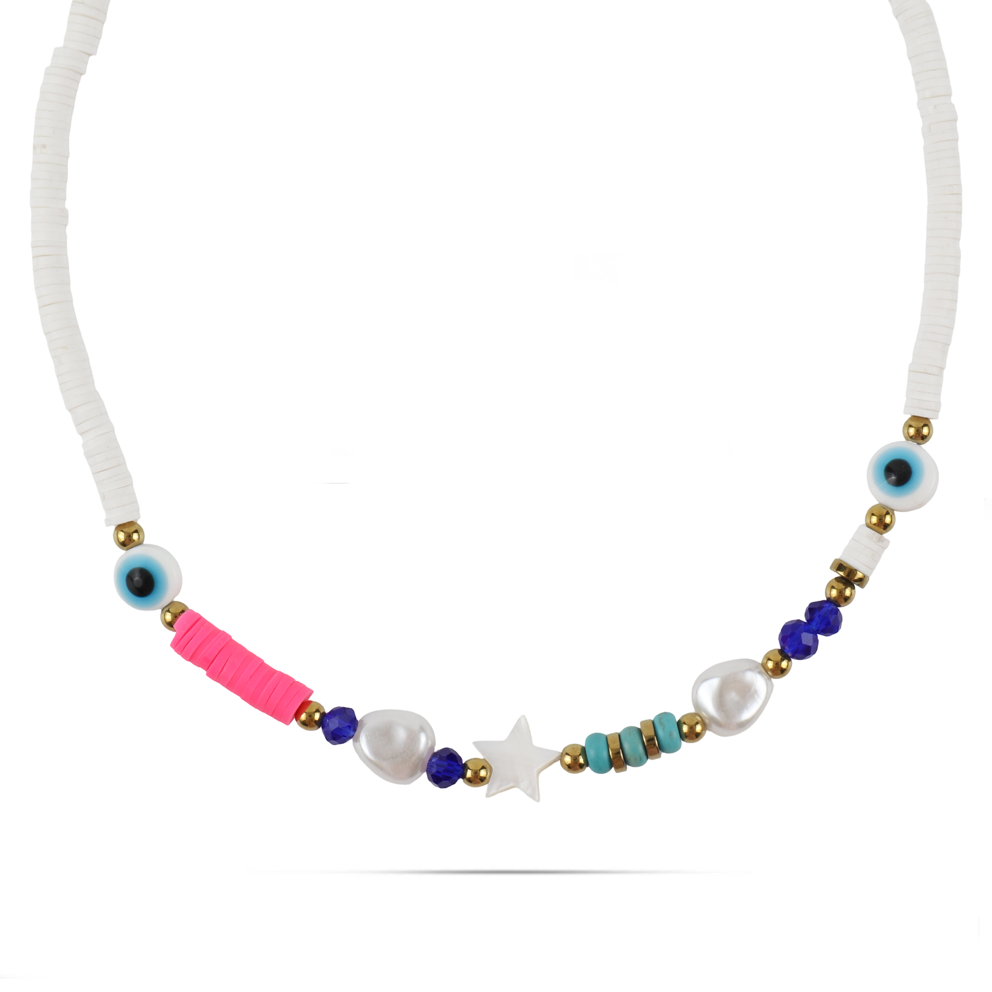 Κολιέ διακοσμημένο με πλακέ χάντρες, ματάκια και υπέροχες λαμπερές πέρλες, ένα εντυπωσιακό και κομψό κόσμημα. Η συνδυασμένη χρήση διαφορετικών στοιχείων προσθέτει πολυδιάστατο χαρακτήρα στο κολιέ, ενώ η λάμψη των περλών προσδίδει κομψότητα. Το ματάκι είναι ένα σύμβολο προστασίας και τύχης, προσδίδοντας στο κολιέ μια ξεχωριστή αίσθηση μυστηρίου και μαγείας. Το κολιέ μπορεί να φορεθεί καθημερινά προσθέτοντας στυλ στην εμφάνιση σας.