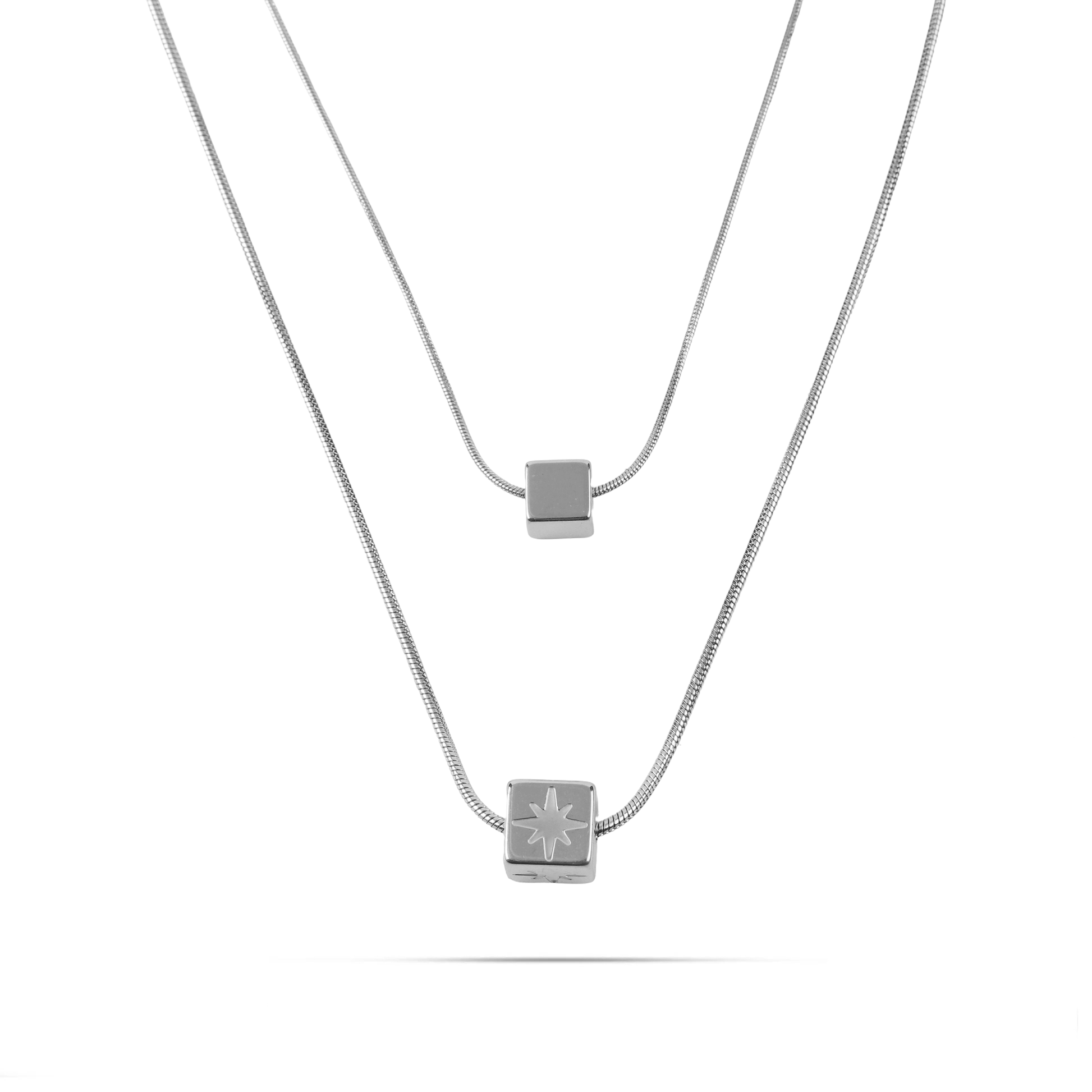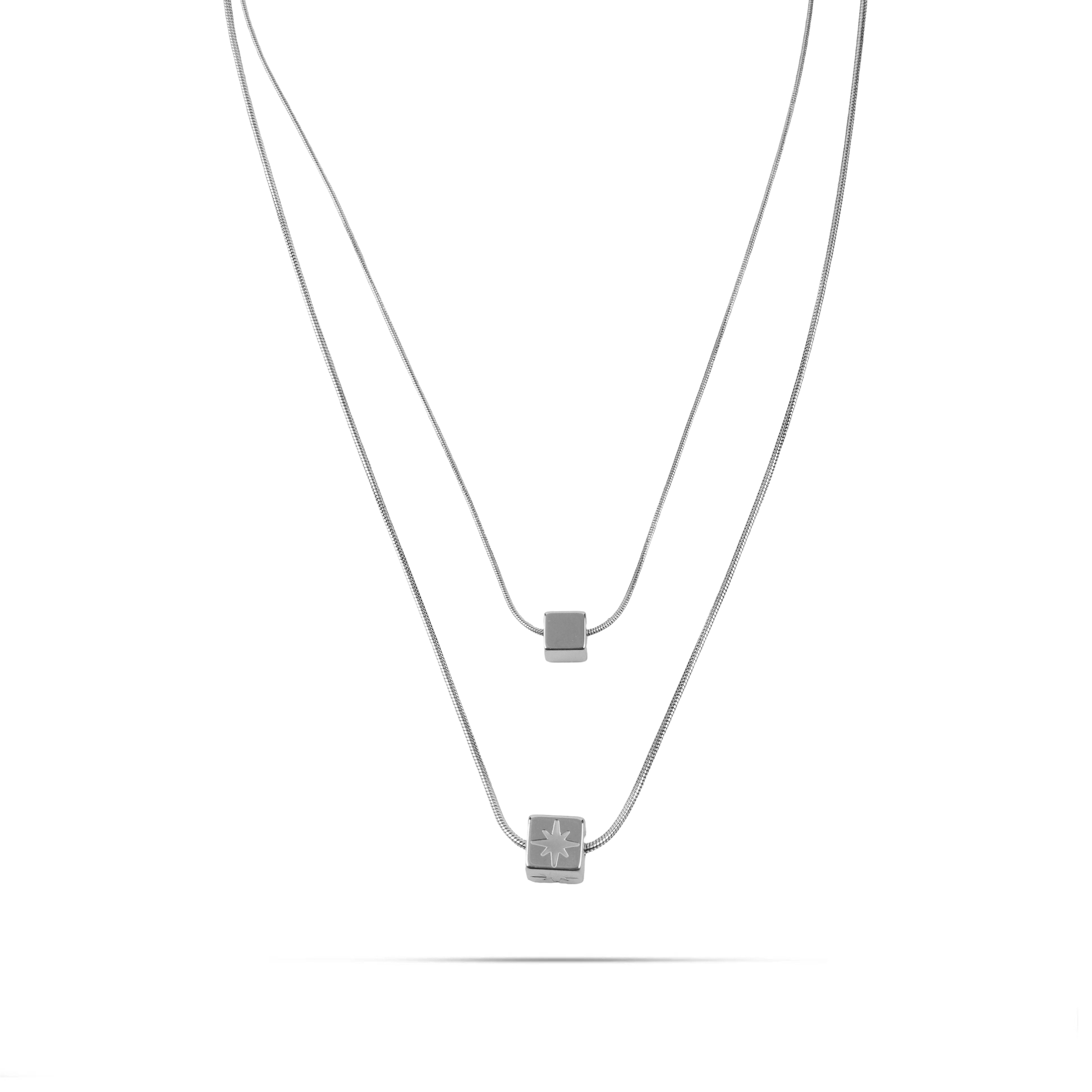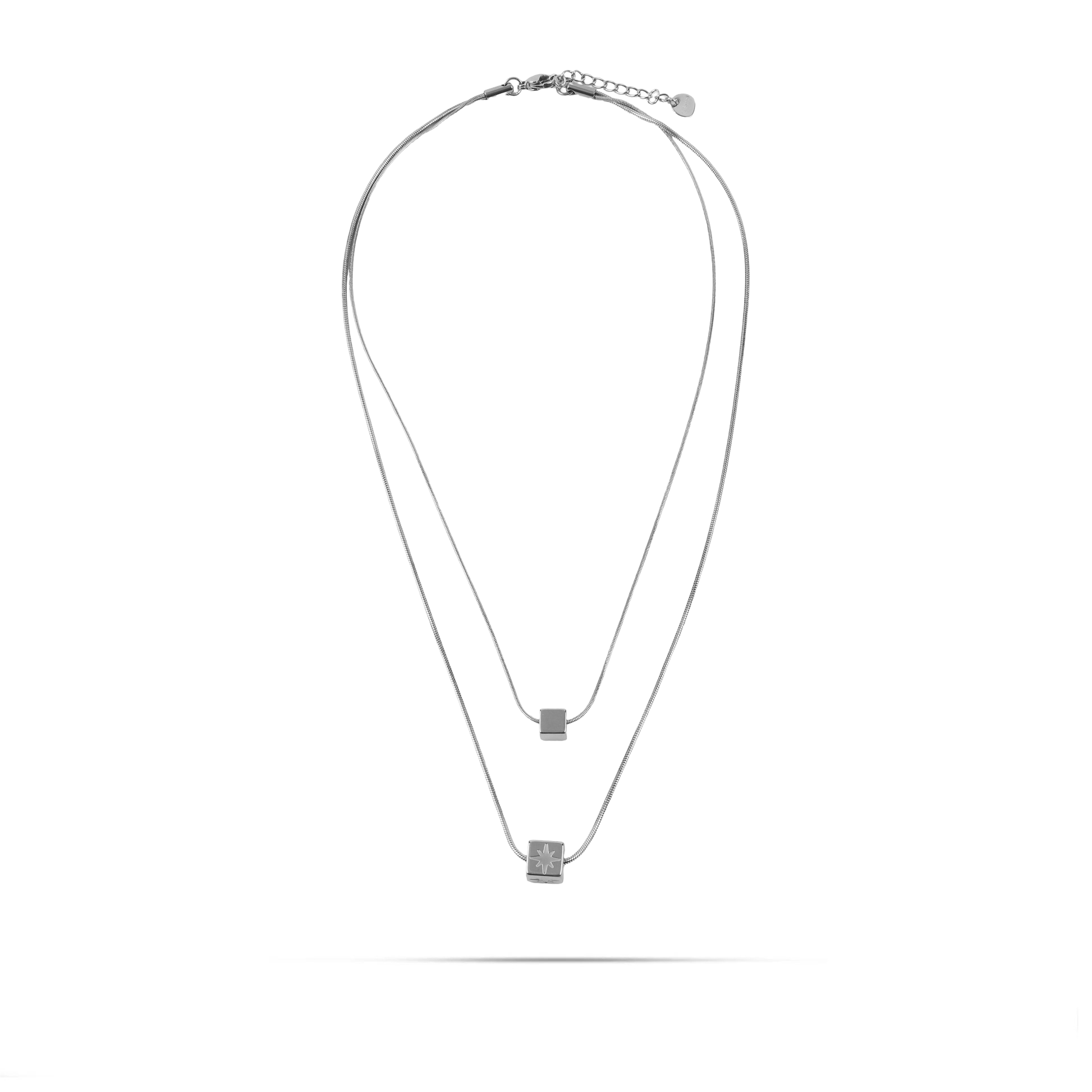 Κολιέ διπλό από ανοξείδωτο ατσάλι με μενταγιόν κυβάκια, το ένα διακοσμημένο με ένα λαμπερό αστέρι. Κατασκευασμένο από ανοξείδωτο ατσάλι, είναι στιλάτο και ανθεκτικό. Φορέστε το για να προσθέσετε μια μοναδική πινελιά στο ντύσιμό σας και να κλέψετε τις εντυπώσεις σε κάθε περίσταση.