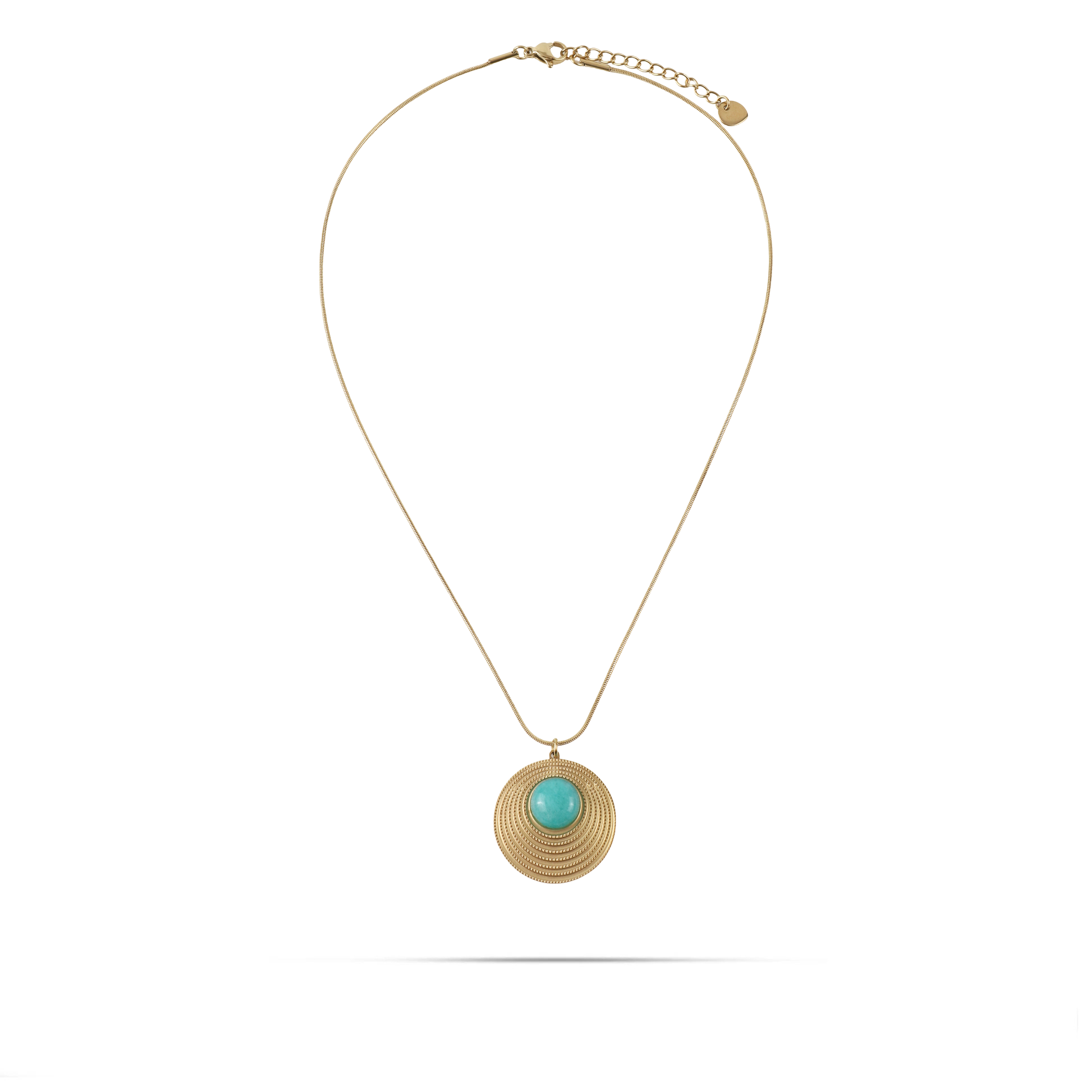 Κολιέ από ανοξείδωτο ατσάλι σε χρυσό χρώμα, με υπέροχο μενταγιόν διακοσμημένο με μία γαλάζια πέτρα. Η γαλάζια πέτρα προσδίδει μια αίσθηση μοναδικότητας στο κολιέ, ενώ το μενταγιόν τονίζει την κομψότητα. Κατασκευασμένο από ανοξείδωτο ατσάλι, είναι ανθεκτικό και ιδανικό για κάθε περίσταση. Φορέστε το για να προσθέσετε μια δόση μυστηρίου και φωτεινότητας σε κάθε εμφάνισή σας και να ξεχωρίσετε.