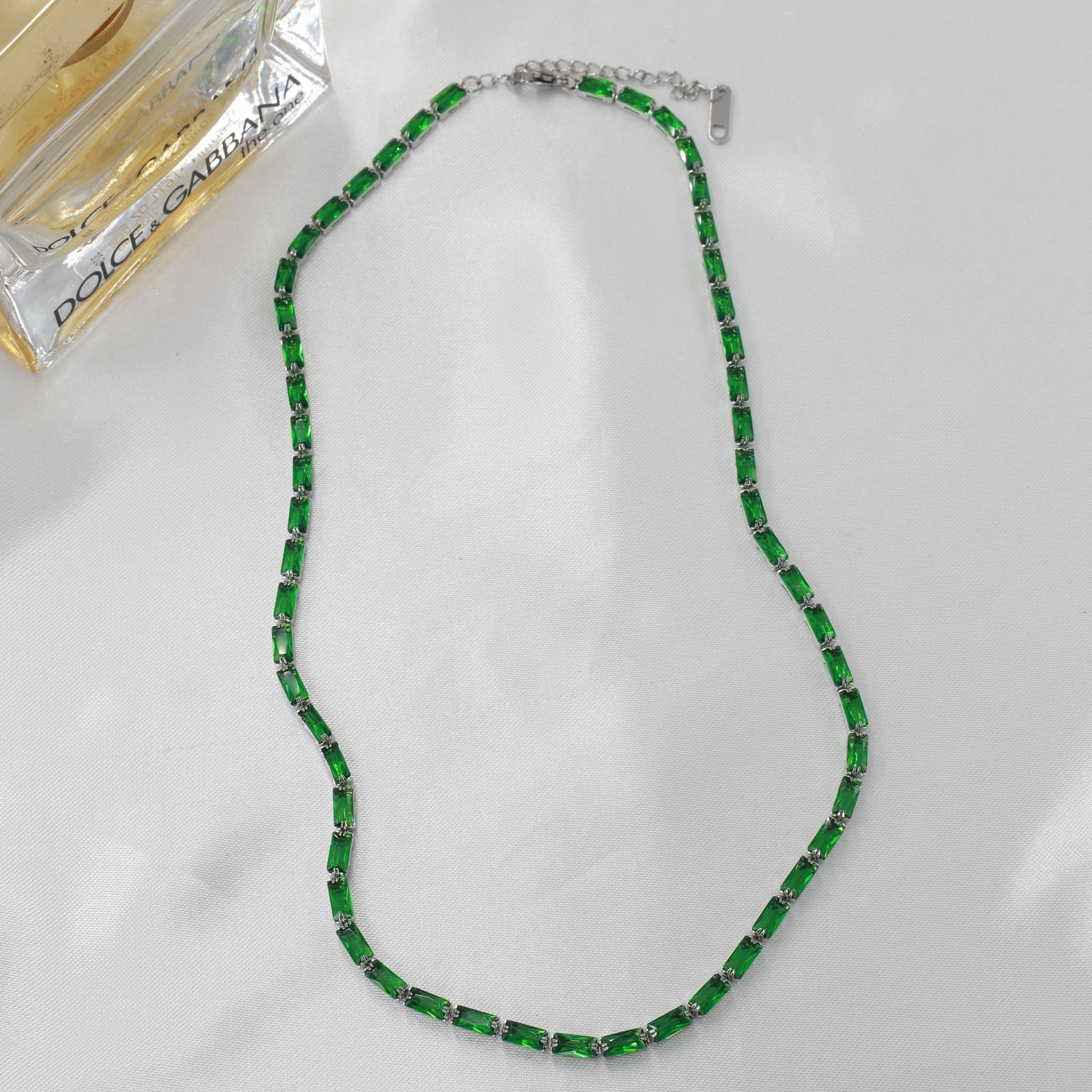 Κολιέ αλυσίδα λαιμού από ανοξείδωτο ατσάλι σε ασημί χρώμα, διακοσμημένο με λαμπερές πράσινες πέτρες Baguette Zircon που χαρίζουν εκθαμβωτική λάμψη και προσδίδουν ζωντάνια στο κόσμημα. Η λεπτή και κομψή αλυσίδα προσφέρει διακριτική κομψότητα, ενώ η προσεγμένη κατασκευή από ανοξείδωτο ατσάλι εξασφαλίζει ανθεκτικότητα και διαχρονική λάμψη, ιδανική για καθημερινή χρήση. Ένα εκλεπτυσμένο κόσμημα που μπορεί να φορεθεί μόνο του ή να συνδυαστεί με άλλα αξεσουάρ, ολοκληρώνοντας κάθε εμφάνιση με φινέτσα.