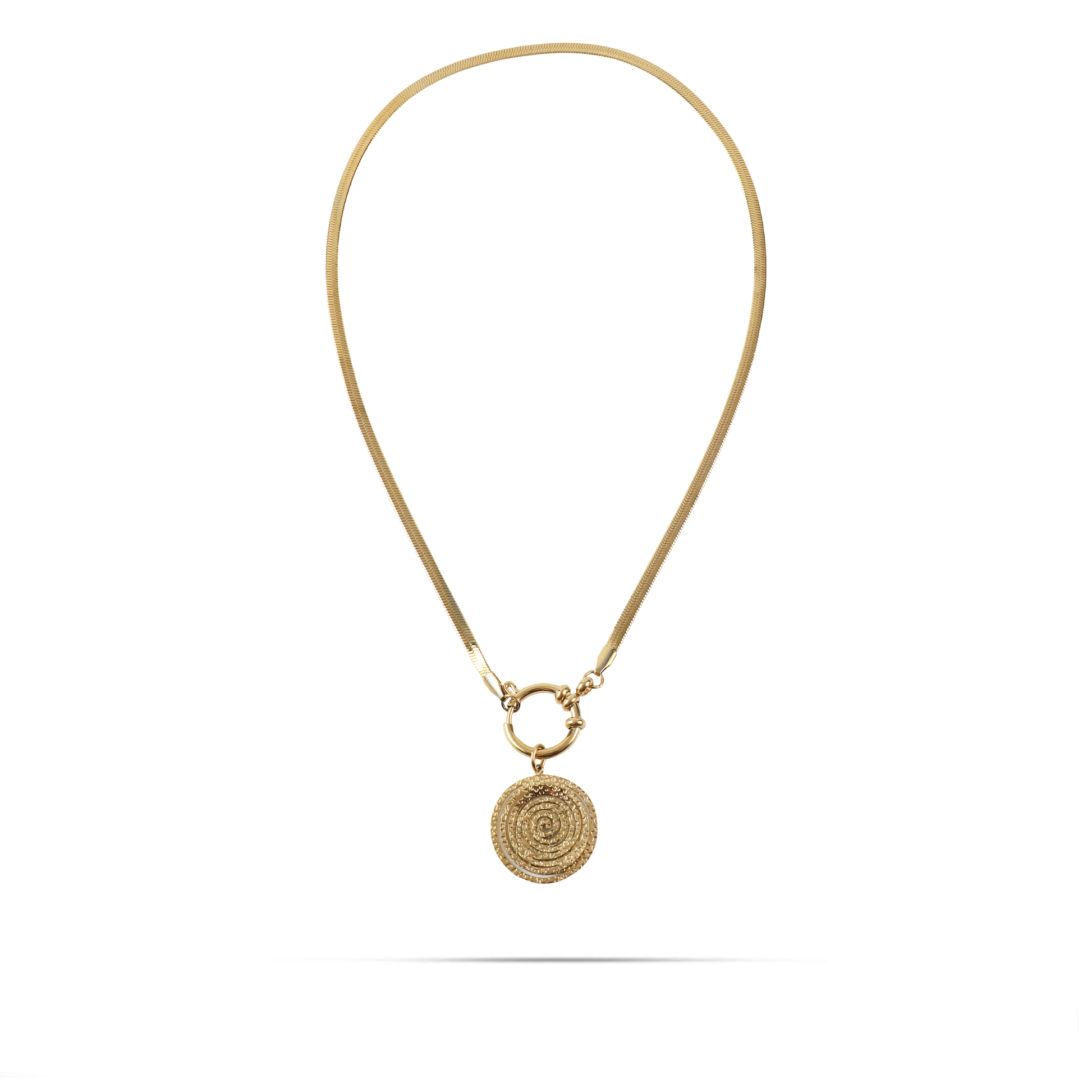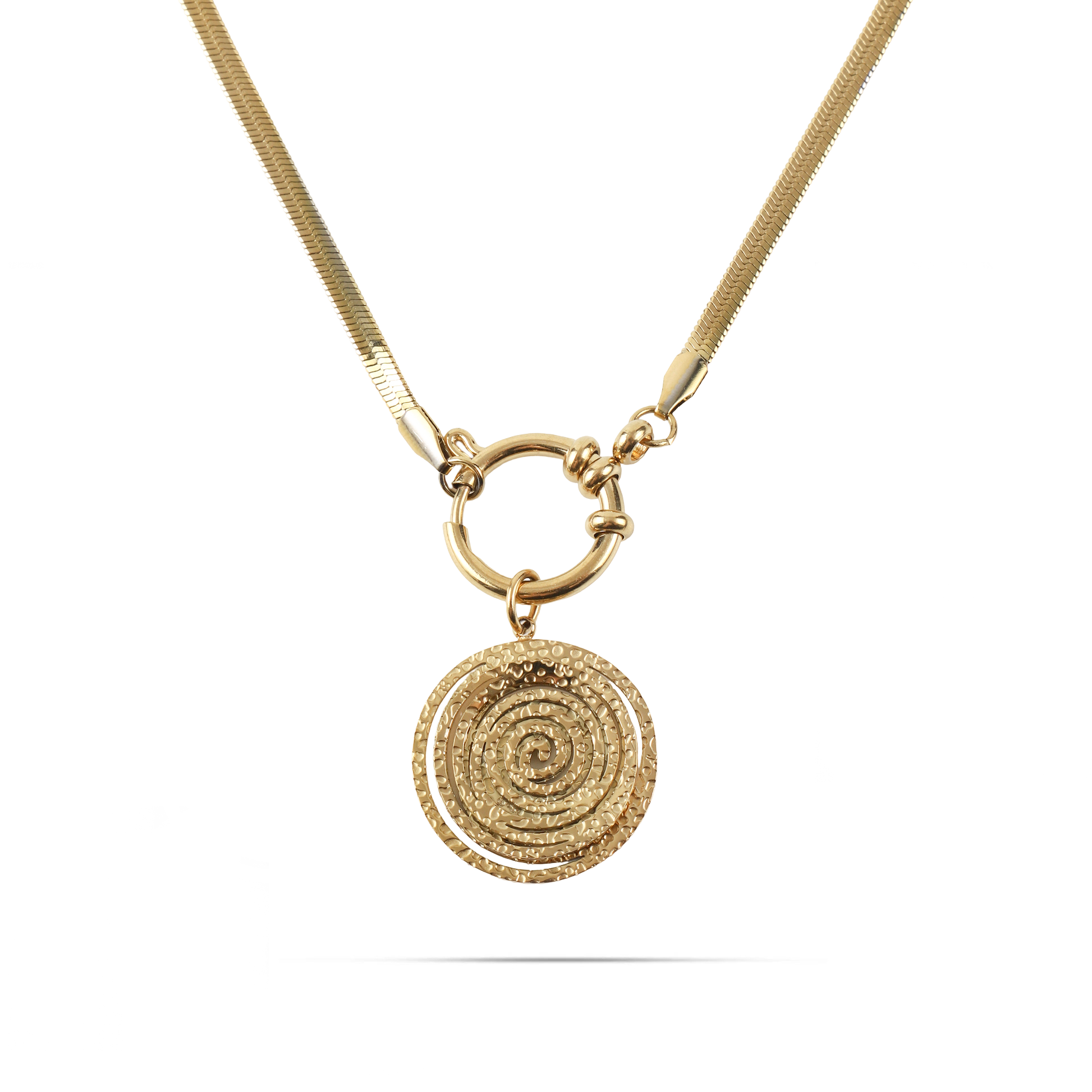 Κολιέ από ανοξείδωτο ατσάλι σε χρυσό χρώμα, με φανταστικό σφυρήλατο σχέδιο στο μενταγιόν. Το σφυρήλατο σχέδιο προσδίδει μια μοναδική αίσθηση υψηλής χειροποίητης αισθητικής και προσθέτει ένα εντυπωσιακό στοιχείο στο κολιέ. Κατασκευασμένο από ανοξείδωτο ατσάλι, είναι ανθεκτικό και ιδανικό για κάθε περίσταση, από τις καθημερινές σας εμφανίσεις μέχρι τις ειδικές περιστάσεις.