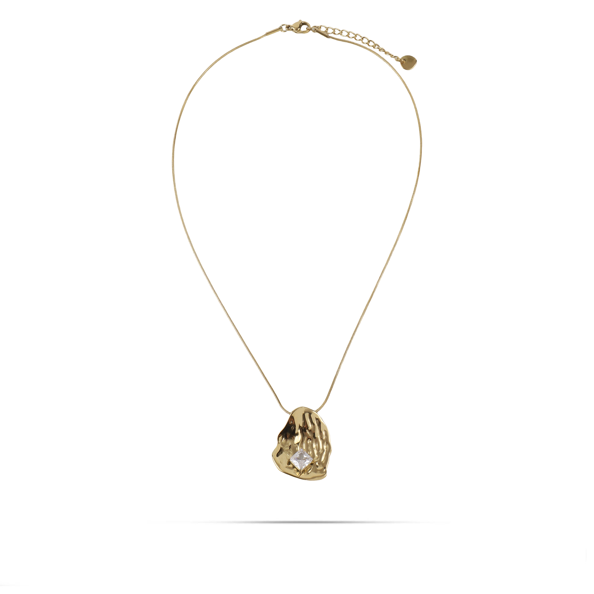 Κολιέ από ανοξείδωτο ατσάλι σε χρυσό χρώμα, με σφυρήλατο μενταγιόν διακοσμημένο με μία λαμπερή πέτρα Zircon. Κατασκευασμένο από ανοξείδωτο ατσάλι, είναι ανθεκτικό και ιδανικό για κάθε περίσταση. Φορέστε το για να προσθέσετε μια δόση λάμψης και κομψότητας σε κάθε σας εμφάνιση. Επίσης μπορεί να αποτελέσει ένα εξαίσιο δώρο.