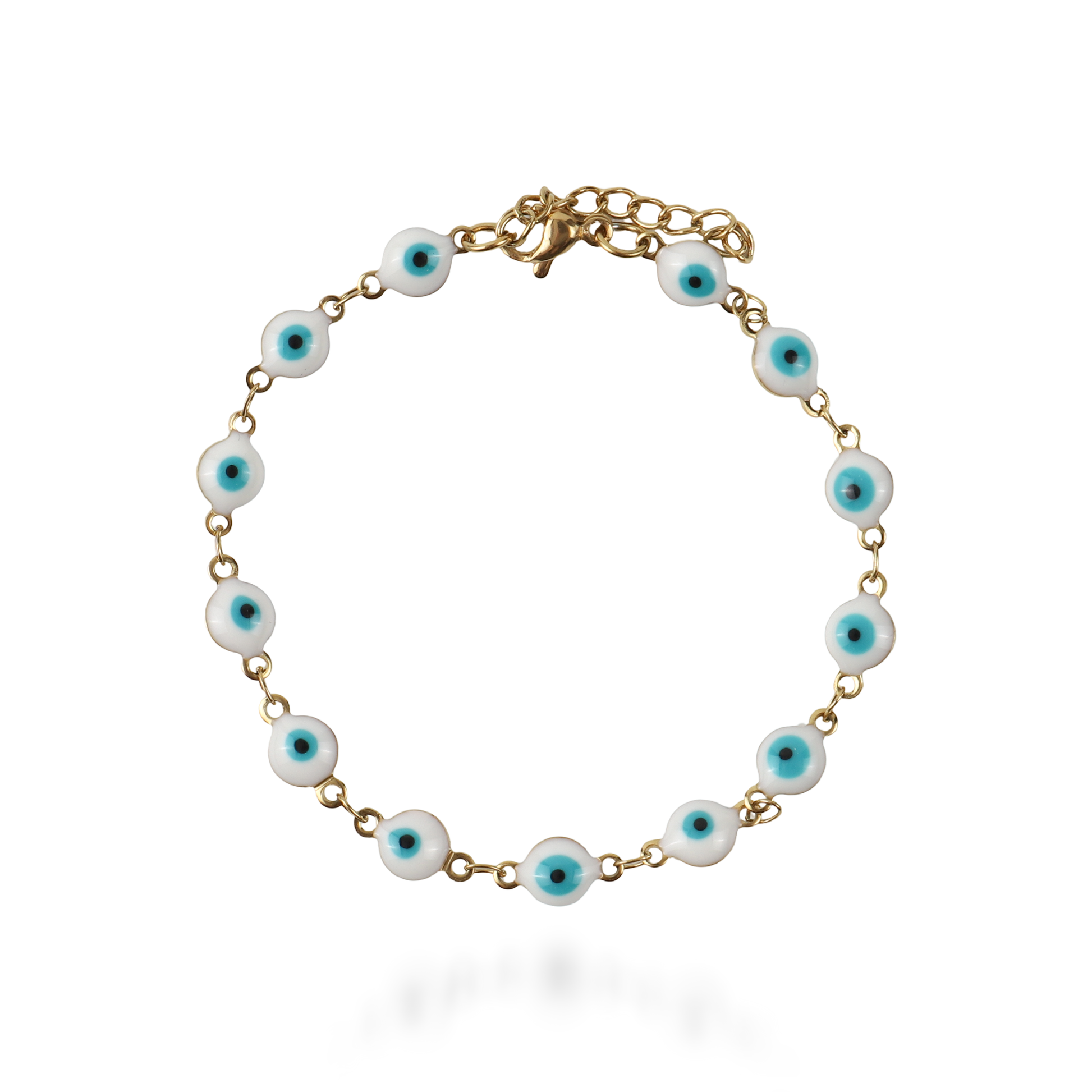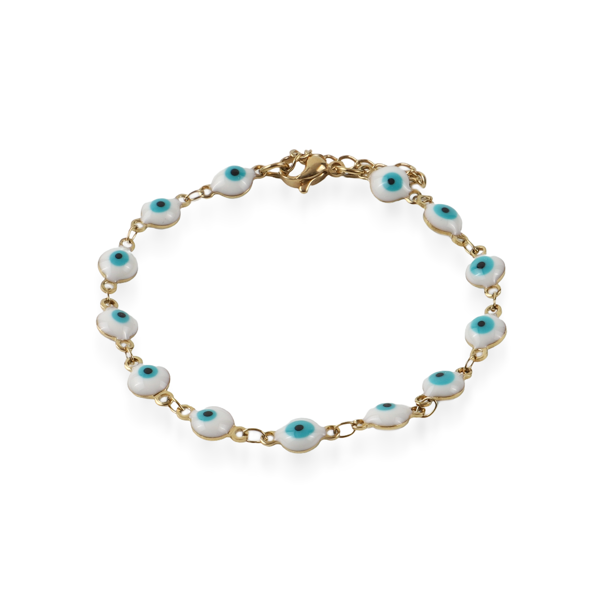 Βραχιόλι από ανοξείδωτο ατσάλι διακοσμημένο με πολλά μικρά ματάκια ένα ξεχωριστό κόσμημα για τον καρπό σας. Τα ματάκια αντιπροσωπεύουν σύμβολο προστασίας και τύχης και παρέχουν έναν μοναδικό αισθητικό χαρακτήρα στο βραχιόλι. Η λεπτομερής κατασκευή και η λάμψη του ανοξείδωτου ατσαλιού το καθιστά ένα εντυπωσιακό κόσμημα που μπορεί να φορεθεί με άνεση καθημερινά προσθέτοντας μια δόση μοναδικού στυλ σε κάθε εμφάνιση.