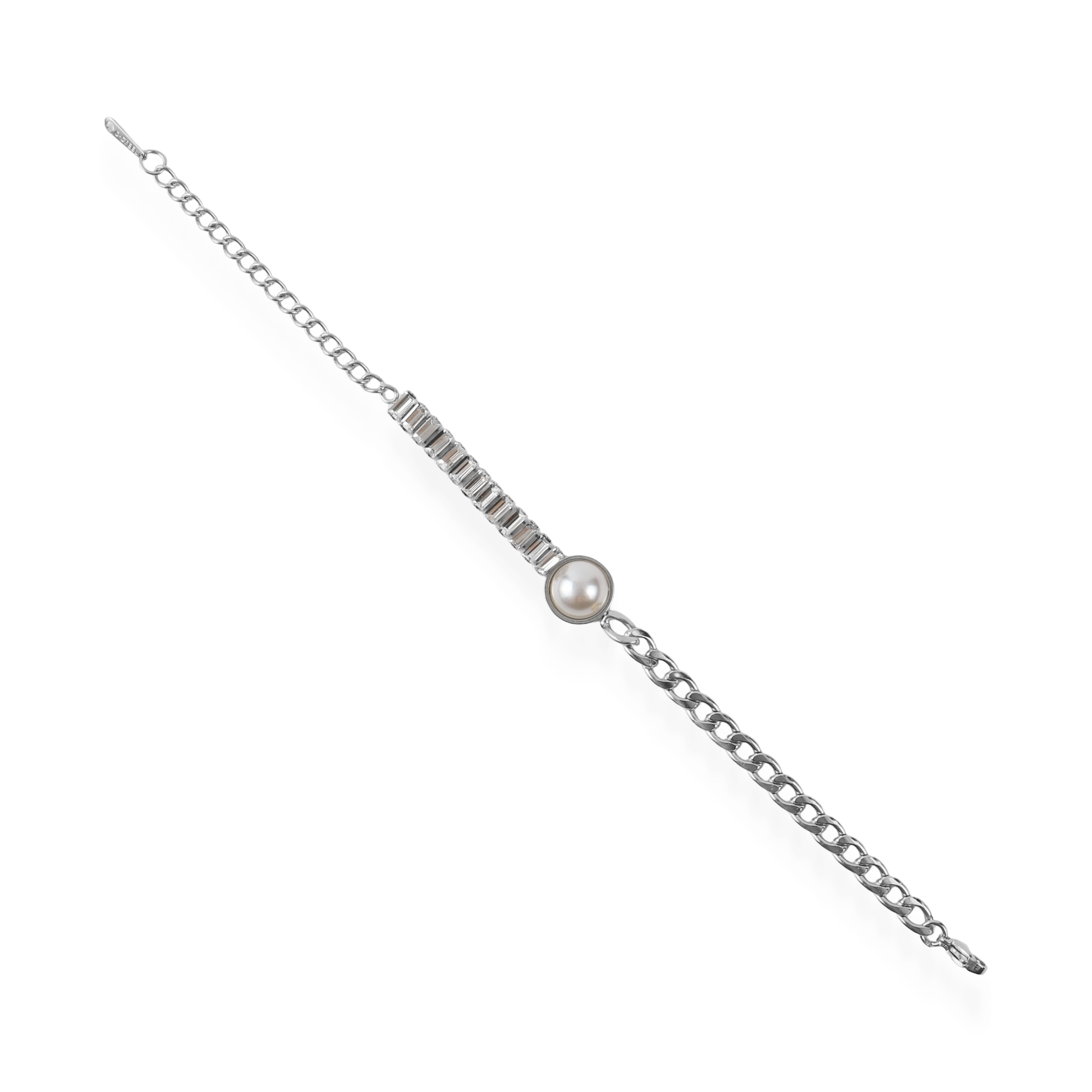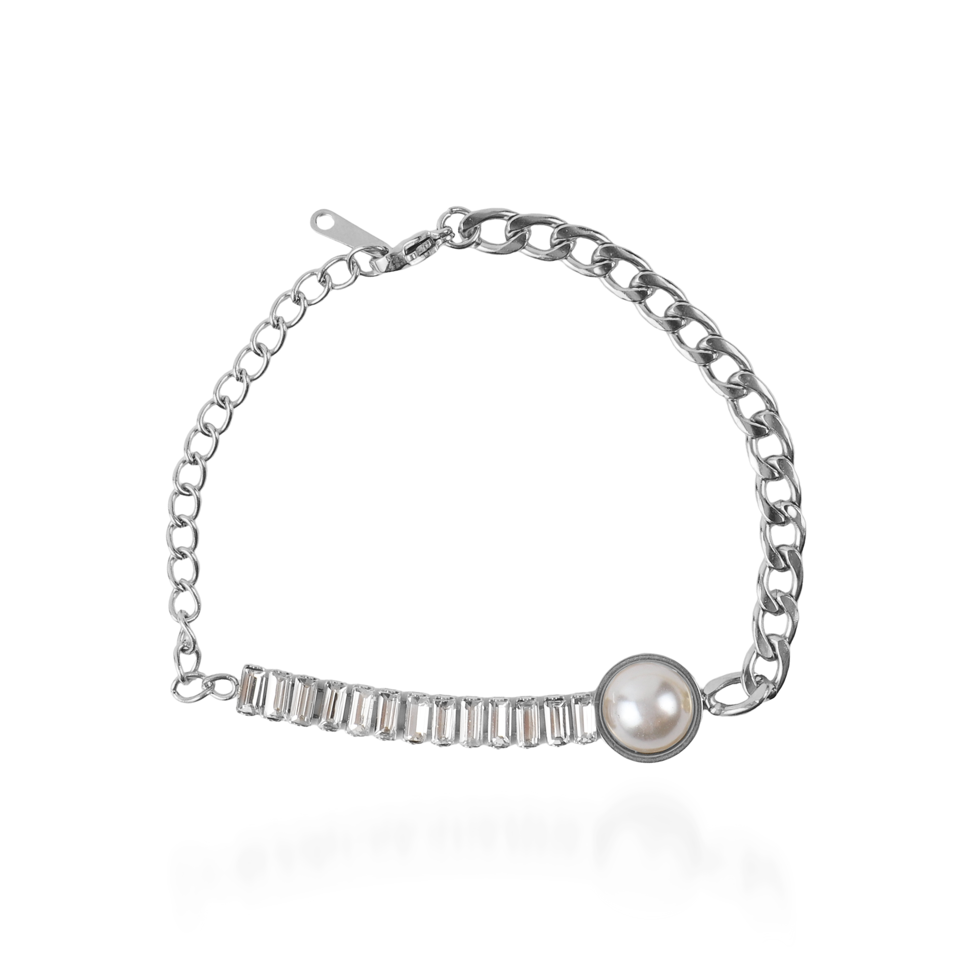 Αναβαθμίστε το στυλ σας με αυτό το κομψό βραχιόλι-αλυσίδα από ανοξείδωτο ατσάλι σε ασημί απόχρωση. Διακοσμημένο με λαμπερές λευκές πέτρες και μια εντυπωσιακή πέρλα, αποπνέει διαχρονική φινέτσα και κομψότητα. Ιδανικό για να ολοκληρώσετε τις εμφανίσεις σας με έναν διακριτικό αλλά πολυτελή τόνο, ενώ η ανθεκτική του κατασκευή υπόσχεται λάμψη που διαρκεί στον χρόνο.